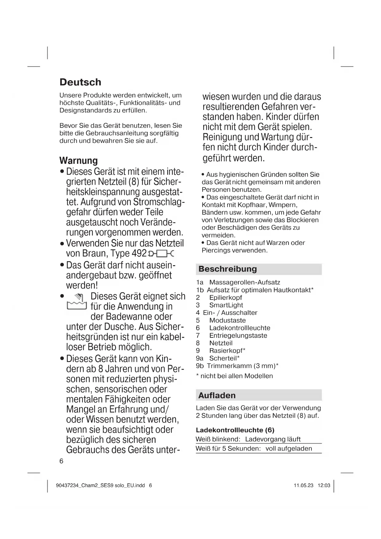 - nicht bei allen Modellen Aufladen Laden Sie das Gerät vor der Verwendung 2 Stunden lang über das Netzteil (8) auf. Ladekontrollleuchte (6) Weiß blinkend: Ladevorgang läuft Weiß für 5 Sekunden: voll aufgeladen Deutsch 90437234_Cham2_SES9 solo_EU.indd 690437234_Cham2_SES9 solo_EU.indd 6 11.05.23 12:0311.05.23 12:037 Gelb: Restnutzungs- dauer von 15 Minuten Gelb blinkend: bitte aufladen Die Betriebszeit beträgt 50 Minuten, wenn das Gerät innerhalb von 24 Stunden nach Vollladung benutzt wird. Laden Sie das Gerät wieder auf, wenn die gelbe Ladekontrollleuchte aufleuchtet oder der Motor ausgeht. Eine 15-minütige Schnell- ladung ermöglicht eine Betriebszeit von 10 Minuten. Die beste Umgebungstemperatur für das Laden, die Verwendung und die Aufbe- wahrung liegt zwischen 15 und 35 °C. Am Ende seiner Lebensdauer kann der Akku beim Braun Kundendienst ersetzt werden. Betriebsmodi Gerät startet mit Power- Modus (I) Durch wiederholtes Drücken der Modustaste (5) kann man nacheinander folgende Modi wählen: Sanft-Modus (II) Smart Touch Modus (A = Automatik) zurück auf Power-Modus (I) Im Smart Touch Modus können Sie die Geschwindigkeit steuern, je nachdem, wie fest Sie das Gerät aufdrücken. Leichter Druck: Sanft-Modus für empfindliche Bereiche Normaler Druck: Power-Modus Power-Modus und Sanft-Modus sind für alle Aufsätze verfügbar. Der Smart Touch Modus wurde für den Massagerollen-Aufsatz optimiert. Eine rote Warnleuchte (3) zeigt an, dass Sie zu fest aufdrücken. Einschaltsperre Um die Einschaltsperre zu aktivieren, drücken Sie den Ein- / Ausschalter 3 Sekunden lang, bis ein Piepton zu hören ist. Um das Gerät zu entsperren, drü- cken Sie den Ein- / Ausschalter erneut 3 Sekunden lang. Lassen Sie den Ein- / Ausschalter los, sobald das Gerät startet. Das Entsperren kann auch über das Laden erfolgen. Epilation (A) Tipps für Einsteiger