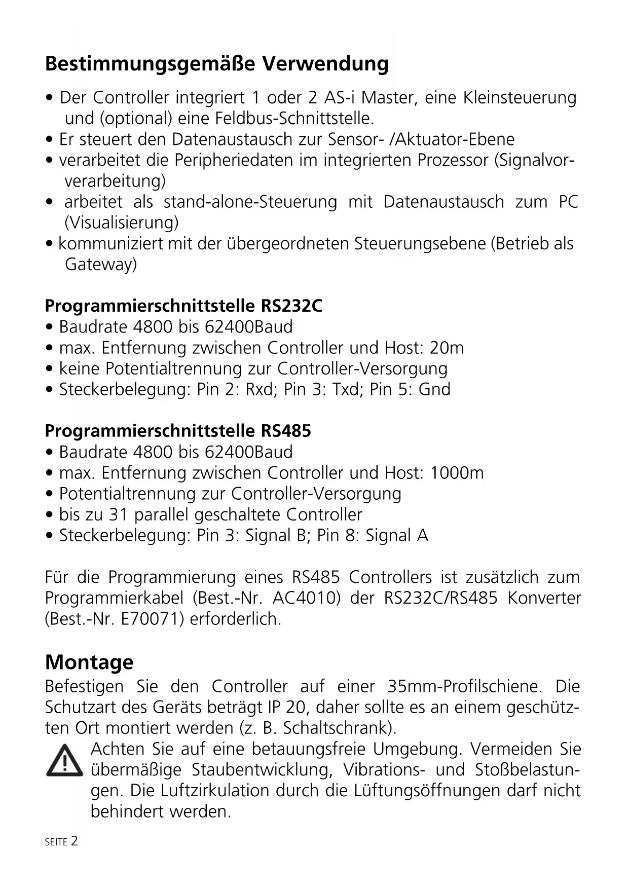 - Steckerbelegung: Pin 3: Signal B; Pin 8: Signal A Für die Programmierung eines RS485 Controllers ist zusätzlich zum Programmierkabel (Best.-Nr. AC4010) der RS232C/RS485 Konverter (Best.-Nr. E70071) erforderlich. Montage Befestigen Sie den Controller auf einer 35mm-Profilschiene. Die Schutzart des Geräts beträgt IP 20, daher sollte es an einem geschütz- ten Ort montiert werden (z. B. Schaltschrank). Achten Sie auf eine betauungsfreie Umgebung. Vermeiden Sie übermäßige Staubentwicklung, Vibrations- und Stoßbelastun- gen. Die Luftzirkulation durch die Lüftungsöffnungen darf nicht behindert werden. SEITE 2Elektrischer Anschluß Schalten Sie die Anlage spannungsfrei. Schließen Sie das Gerät entsprechend der Klemmenbeschriftung an. Verbinden Sie nie- mals die Minuspotentiale untereinander oder Minuspotentiale und PE-Anschluß. Stellen Sie eine elektrisch sichere Erdverbindung zwischen AS-i Controller (Klemme PE) und Gerät-Erdanschluß her. Die RS485-Leitung muß an beiden Enden mit einem Busabschluß betrieben werden, da im Ruhezustand und bei einem High-Signal der Leitungstreiber hochohmig geschaltet wird. Die Leitungen A und B werden durch einen 120Ω Widerstand verbunden. Leitung A wird über 330Ω auf +5V und Leitung B über 330Ω auf 0V gelegt. Diese Widerstände sind bereits im AS-i Controller integriert. Sie lassen sich über Brücken zwischen den Pins 5-9, 8-7, und 1-6 im Abschlußstecker aktivieren. Nach Anlegen der Versorgungsspannung leuchten die LEDs und die LED-Anzeige (LED-Test); danach werden für je 1s die Versionsnummern für Hardware und Software (Software Version Controller und Software Version AS-i Master) angezeigt. SEITE 3Bedien- und Anzeigeelemente SEITE 4 ALARMCONFIGNOT AUTO ADDR ASI PWR COM MODE PROJ MODE CTRL MODE SET ASI-CONTROLLER ifm electronic gmbh·D 45127 EssenMade in Germany ASI 2