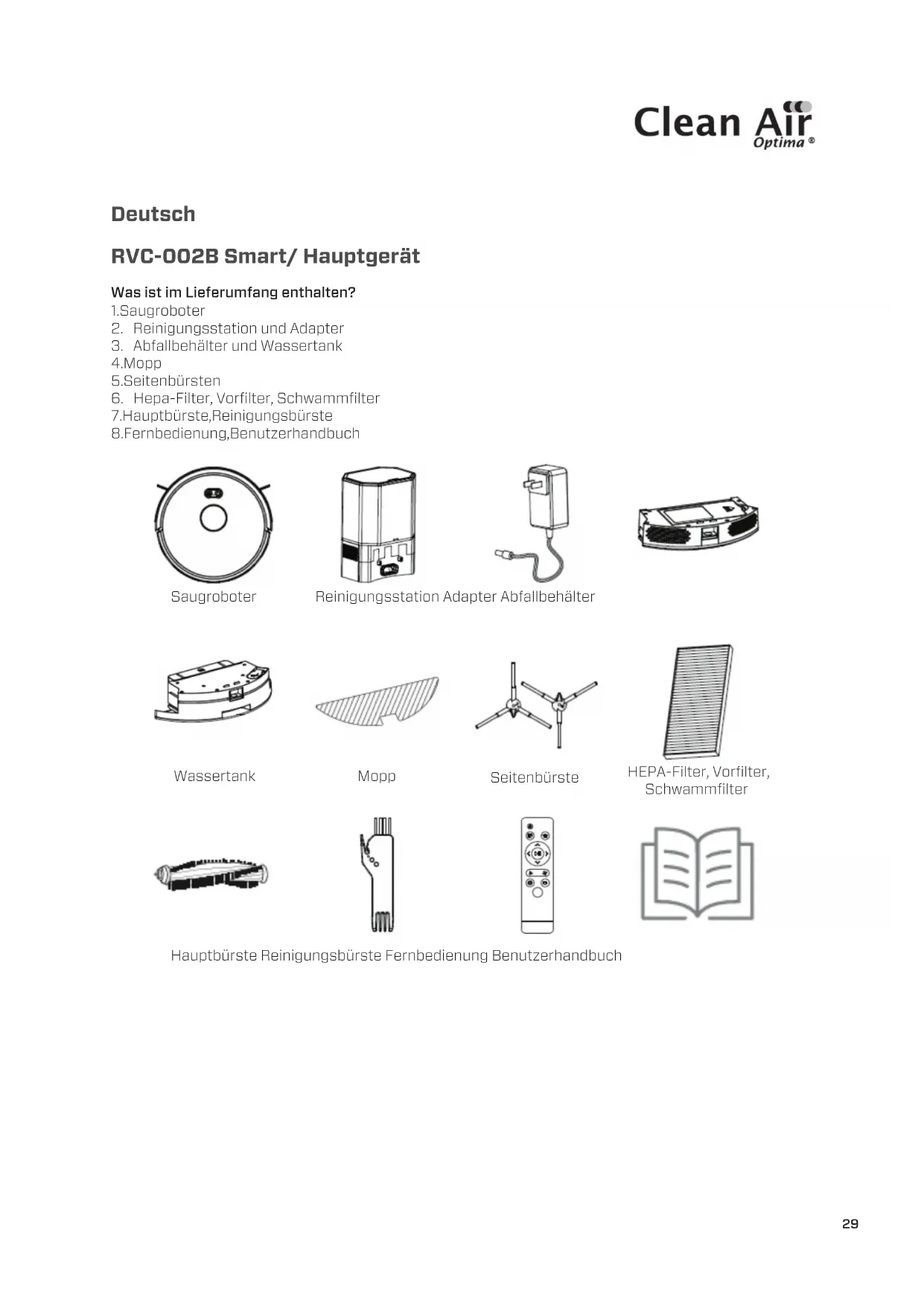 undder Umstände bei, unter denen diese Probleme aufgetreten sind. Der Clean Air Optima® Robotstaubsauger RVC-002B Smart wird vor der Auslieferung strengen Prüfverfahren unterzogen. Wenn das Produkt innerhalb von zwei Jahren ab Kaufdatum aufgrund von Herstellungsfehlern nicht den Spezifikationen entspricht, hat der Käufer gegen Vorlage dieser Garantie Anspruch auf kostenlose Reparatur oder den Ersatz von Teilen (vorausgesetzt, die Fehlfunktion oder Beschädigung des Geräts und/oder der Teile ist unter normalen Betriebsbedingungen aufgetreten). Die Garantie gilt: Für alle in Material und Verarbeitung fehlerhaften Teile. Wie lange: zwei Jahre ab Kaufdatum. Das werden wir tun: Fehlerhafte Teile reparieren oder ersetzen. Sonstige Bedingungen Die Bestimmungen dieser Garantie ersetzen alle anderen schriftlichen Garantien, obausdrücklich oder stillschweigend, schriftlich oder mündlich, einschließlich der Garantie der Marktgängigkeit oder Eignung für einen bestimmten Zweck. Die maximale Haftung des Herstellers überschreitet nicht den tatsächlichen Kaufpreis, den Sie für das Produkt gezahlt haben. In keinem Fall haftet der Hersteller für besondere, zufällige, Folge- oder indirekte Schäden. Diese Garantie erstreckt sich nicht auf einen Mangel, der nach unserem alleinigen Ermessen auf unsachgemäße oder unangemessene Verwendung oder Wartung, fehlerhafte Montage, Unfall oder Naturkatastrophen, unsachgemäße Verpackung oder unbefugte Manipulationen, Änderungen oder Modifikationen zurückzuführen ist. Diese Garantie erlischt, wenn der Aufkleber mit der Seriennummer entfernt oder entstellt wurde.54 Vielen Dank für das Lesen! Senden Sie Ihr Feedback zum Clean Air Optima® Robotstaufsauger RVC-002B Smart an: www.cleanairoptima.com Für häufig gestellte Fragen zum RVC-002B Smart besuchen Siebitte: www.cleanairoptima.com und suchen Sie nach „RVC-002B Smart“. Laden Sie die PDF-Bedienungsanleitung herunter unter: www.cleanairoptima.com/info/manuals Alle Videos mit Produktanimationen von Clean Air Optima® finden Sie auf: www.youtube.com Clean Air Optima International B.V. | David Ricardostraat 9-7 / 9-9 | 7559 SH Hengelo (ov) Niederlande | Telefon: +31 (0) 74 - 2670145 Clean Air Optima Germany GmbH | Enschedestraße 14 | 48529 Nordhorn | Deutschland Telefon: +49 (0)5921 879-121 E-Mail: info@cleanairoptima.com Internet: www.cleanairoptima.com55 Nederlands RVC-002B Smart Hoofdeenheid Wat zit er in de doos?