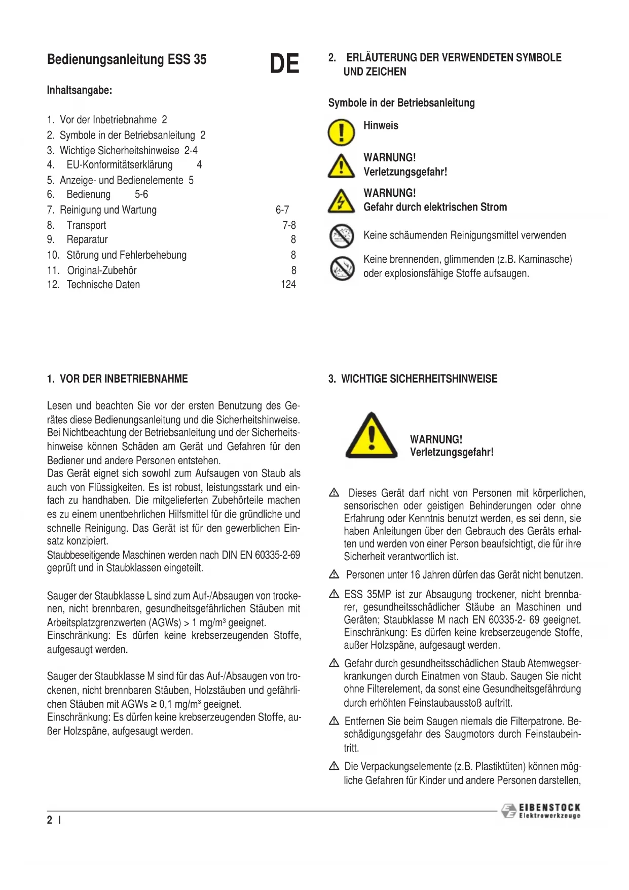 Lesen und beachten Sie vor der ersten Benutzung des Ge- rätes diese Bedienungsanleitung und die Sicherheitshinweise. Bei Nichtbeachtung der Betriebsanleitung und der Sicherheits- hinweise können Schäden am Gerät und Gefahren für den Bediener und andere Personen entstehen. Das Gerät eignet sich sowohl zum Aufsaugen von Staub als auch von Flüssigkeiten. Es ist robust, leistungsstark und ein- fach zu handhaben. Die mitgelieferten Zubehörteile machen es zu einem unentbehrlichen Hilfsmittel für die gründliche und schnelle Reinigung. Das Gerät ist für den gewerblichen Ein- satz konzipiert. Staubbeseitigende Maschinen werden nach DIN EN 60335-2-69 geprüft und in Staubklassen eingeteilt. Sauger der Staubklasse L sind zum Auf-/Absaugen von trocke- nen, nicht brennbaren, gesundheitsgefährlichen Stäuben mit Arbeitsplatzgrenzwerten (AGWs) > 1 mg/m³ geeignet. Einschränkung: Es dürfen keine krebserzeugenden Stoffe, aufgesaugt werden. Sauger der Staubklasse M sind für das Auf-/Absaugen von tro- ckenen, nicht brennbaren Stäuben, Holzstäuben und gefährli- chen Stäuben mit AGWs ≥ 0,1 mg/m³ geeignet. Einschränkung: Es dürfen keine krebserzeugenden Stoffe, au- ßer Holzspäne, aufgesaugt werden. Bedienungsanleitung ESS 35 Inhaltsangabe: