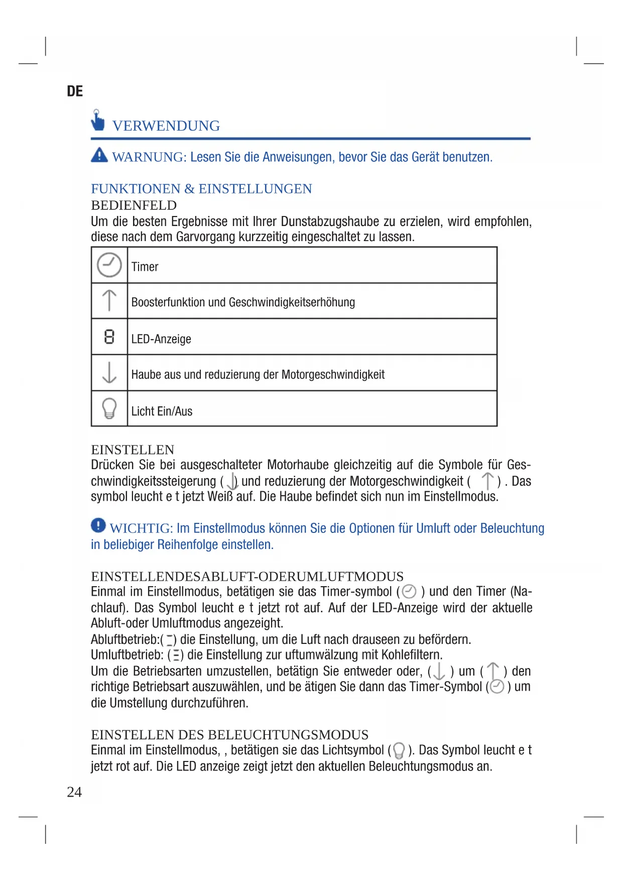 VERWENDUNG WARNUNG: Lesen Sie die Anweisungen, bevor Sie das Gerät benutzen. FUNKTIONEN & EINSTELLUNGEN BEDIENFELD Um die besten Ergebnisse mit Ihrer Dunstabzugshaube zu erzielen, wird empfohlen, diese nach dem Garvorgang kurzzeitig eingeschaltet zu lassen. Timer Boosterfunktion und Geschwindigkeitserhöhung LED-Anzeige Haube aus und reduzierung der Motorgeschwindigkeit Licht Ein/Aus EINSTELLEN Drücken Sie bei ausgeschalteter Motorhaube gleichzeitig auf die Symbole für Ges- chwindigkeitssteigerung ( ) und reduzierung der Motorgeschwindigkeit ( ) . Das symbol leucht e t jetzt Weiß auf. Die Haube befindet sich nun im Einstellmodus. WICHTIG: Im Einstellmodus können Sie die Optionen für Umluft oder Beleuchtung in beliebiger Reihenfolge einstellen. EINSTELLENDESABLUFT-ODERUMLUFTMODUS Einmal im Einstellmodus, betätigen sie das Timer-symbol ( ) und den Timer (Na- chlauf). Das Symbol leucht e t jetzt rot auf. Auf der LED-Anzeige wird der aktuelle Abluft-oder Umluftmodus angezeight. Abluftbetrieb:( ) die Einstellung, um die Luft nach drauseen zu befördern. Umluftbetrieb: ( ) die Einstellung zur uftumwälzung mit Kohlefiltern. Um die Betriebsarten umzustellen, betätign Sie entweder oder, ( ) um ( ) den richtige Betriebsart auszuwählen, und be ätigen Sie dann das Timer-Symbol ( ) um die Umstellung durchzuführen.