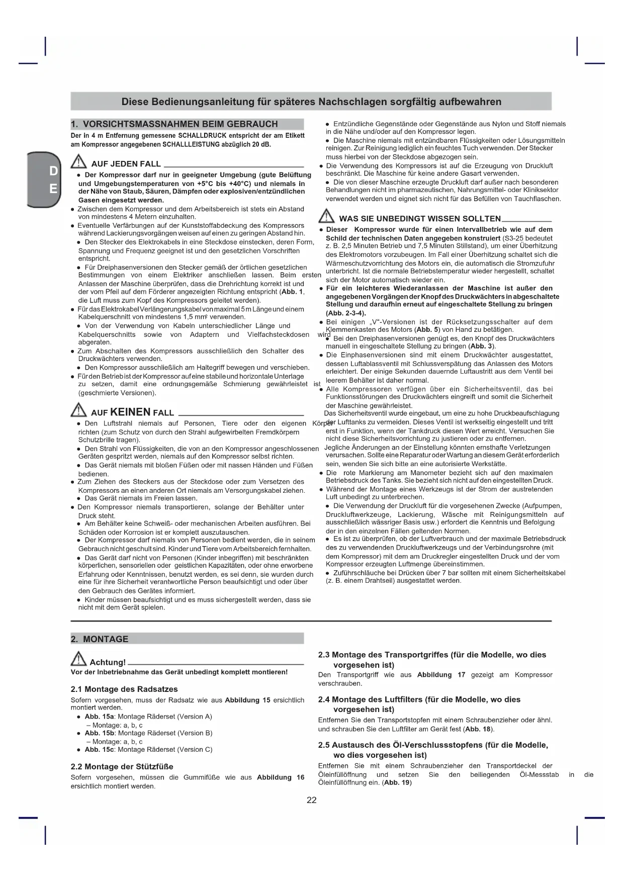Ʀ Dieser Kompressor wurde für einen Intervallbetrieb wie auf dem Schild der technischen Daten angegeben konstruiert(S3-25bedeutetz.B.2,5MinutenBetriebund7,5MinutenStillstand),umeinerÜberhitzungdesElektromotorsvorzubeugen.ImFalleinerÜberhitzungschaltetsichdieWärmeschutzvorrichtungdesMotorsein,dieautomatischdieStromzufuhrunterbricht.IstdienormaleBetriebstemperaturwiederhergestellt,schaltetsich der Motor automatisch wieder ein. Ʀ Für ein leichteres Wiederanlassen der Maschine ist außer den angegebenen Vorgängen der Knopf des Druckwächters in abgeschaltete Stellung und daraufhin erneut auf eingeschaltete Stellung zu bringen (Abb. 2-3-4). Ʀ Bei einigen „V“-Versionen ist der Rücksetzungsschalter auf dem KlemmenkastendesMotors(Abb. 5)vonHandzubetätigen. Ʀ BeidenDreiphasenversionengenügtes,denKnopfdesDruckwächtersmanuellineingeschalteteStellungzubringen(Abb. 3). Ʀ Die Einphasenversionen sind mit einem Druckwächter ausgestattet, dessen Luftablassventil mit Schlussverspätung das Anlassen des Motors erleichtert. Der einige Sekunden dauernde Luftaustritt aus dem Ventil bei leerem Behälter ist daher normal. Ʀ Alle Kompressoren verfügen über ein Sicherheitsventil, das bei Funktionsstörungen des Druckwächters eingreift und somit die Sicherheit der Maschine gewährleistet. DasSicherheitsventilwurdeeingebaut,umeinezuhoheDruckbeaufschlagungder Lufttanks zu vermeiden. Dieses Ventil ist werkseitig eingestellt und tritt erstinFunktion,wennderTankdruckdiesenWerterreicht.VersuchenSienicht diese Sicherheitsvorrichtung zu justieren oder zu entfernen. JeglicheÄnderungenanderEinstellungkönntenernsthafteVerletzungenverursachen. Sollte eine Reparatur oder Wartung an diesem Gerät erforderlich sein,wendenSiesichbitteaneineautorisierteWerkstätte. Ʀ Die rote Markierung am Manometer bezieht sich auf den maximalen Betriebsdruck des Tanks. Sie bezieht sich nicht auf den eingestellten Druck. Ʀ Während der Montage eines Werkzeugs ist der Strom der austretenden Luft unbedingt zu unterbrechen. Ʀ DieVerwendungderDruckluftfürdievorgesehenenZwecke(Aufpumpen,Druckluftwerkzeuge, Lackierung, Wäsche mit Reinigungsmitteln aufausschließlichwässrigerBasisusw.)erfordertdieKenntnisundBefolgungder in den einzelnen Fällen geltenden Normen. Ʀ Esistzuüberprüfen,obderLuftverbrauchunddermaximaleBetriebsdruckdeszuverwendendenDruckluftwerkzeugsundderVerbindungsrohre(mitdemKompressor)mitdemamDruckreglereingestelltenDruckunddervomKompressorerzeugtenLuftmengeübereinstimmen. Ʀ ZuführschläuchebeiDrückenüber7barsolltenmiteinemSicherheitskabel(z.B.einemDrahtseil)ausgestattetwerden. Diese Bedienungsanleitung für späteres Nachschlagen sorgfältig aufbewahren