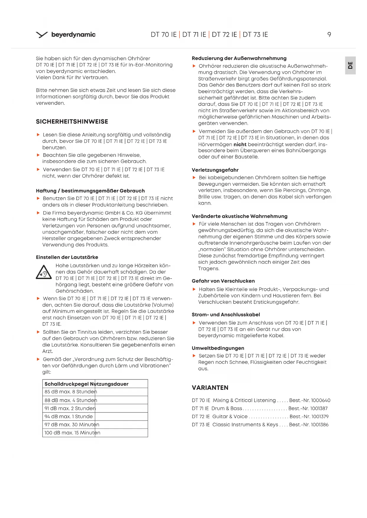 DT 70 IE | DT 71 IE | DT 72 IE | DT 73 IE Sie haben sich für den dynamischen Ohrhörer DT 70 IE | DT 71 IE | DT 72 IE | DT 73 IE für In-Ear-Monitoring von beyerdynamic entschieden. Vielen Dank für Ihr Verauen. Bitte nehmen Sie sich etwas Zeit und lesen Sie sich diese Informationen sorgfältig durch, bevor Sie das Produkt verwenden. SICHERHEITSHINWEISE Lesen Sie diese Anleitung sorgfältig und volländig durch, bevor Sie DT 70 IE | DT 71 IE | DT 72 IE | DT 73 IE benutzen. Beachten Sie alle gegebenen Hinweise, insbesondere die zum sicheren Gebrauch. Verwenden Sie DT 70 IE | DT 71 IE | DT 72 IE | DT 73 IE nicht, wenn der Ohrhörer defekt i. Haung / beimmungsgemäßer Gebrauch Benutzen Sie DT 70 IE | DT 71 IE | DT 72 IE | DT 73 IE nicht anders als in dieser Produktanleitung beschrieben. Die Firma beyerdynamic GmbH & Co. KG übernimmt keine Haung für Schäden am Produkt oder Verletzungen von Personen aufgrund unachtsamer, unsachgemäßer, falscher oder nicht dem vom Hereller angegebenen Zweck entsprechender Verwendung des Produkts. Einellen der Lautärke Hohe Lautärken und zu lange Hörzeiten kön- nen das Gehör dauerha schädigen. Da der DT 70 IE | DT 71 IE | DT 72 IE | DT 73 IE direkt im Ge- hörgang liegt, beeht eine größere Gefahr von Gehörschäden. Wenn Sie DT 70 IE | DT 71 IE | DT 72 IE | DT 73 IE verwen- den, achten Sie darauf, dass die Lautärke (Volume) auf Minimum eingeellt i. Regeln Sie die Lautärke er nach Einsetzen von DT 70 IE | DT 71 IE | DT 72 IE | DT 73 IE. Sollten Sie an Tinnitus leiden, verzichten Sie besser auf den Gebrauch von Ohrhörern bzw. reduzieren Sie die Lautärke. Konsultieren Sie gegebenenfalls einen Arzt. Gemäß der „Verordnung zum Schutz der Beschäig- ten vor Gefährdungen durch Lärm und Vibrationen“ gilt: Schalldruckpegel Nutzungsdauer 85 dB max. 8 Stunden 88 dB max. 4 Stunden 91 dB max. 2 Stunden 94 dB max. 1 Stunde 97 dB max. 30 Minuten 100 dB max. 15 Minuten Reduzierung der Außenwahrnehmung Ohrhörer reduzieren die akuische Außenwahrneh- mung draisch. Die Verwendung von Ohrhörer im Straßenverkehr birgt großes Gefährdungspotenzial. Das Gehör des Benutzers da auf keinen Fall so ark beeinträchtigt werden, dass die Verkehrs- sicherheit gefährdet i. Bitte achten Sie zudem darauf, dass Sie DT 70 IE | DT 71 IE | DT 72 IE | DT 73 IE nicht im Straßenverkehr sowie im Aktionsbereich von möglicherweise gefährlichen Maschinen und Arbeits- geräten verwenden. Vermeiden Sie außerdem den Gebrauch von DT 70 IE | DT 71 IE | DT 72 IE | DT 73 IE in Situationen, in denen das Hörvermögen nicht beeinträchtigt werden da, ins- besondere beim Überqueren eines Bahnübergangs oder auf einer Bauelle. Verletzungsgefahr Bei kabelgebundenen Ohrhörern sollten Sie heige Bewegungen vermeiden. Sie könnten sich ernha verletzen, insbesondere, wenn Sie Piercings, Ohrringe, Brille usw. tragen, an denen das Kabel sich veangen kann. Verändee akuische Wahrnehmung Für viele Menschen i das Tragen von Ohrhörern gewöhnungsbedütig, da sich die akuische Wahr- nehmung der eigenen Stimme und des Körpers sowie auretende Innenohrgeräusche beim Laufen von der „normalen“ Situation ohne Ohrhörer unterscheiden. Diese zunäch fremdaige Empfindung verringe sich jedoch gewöhnlich nach einiger Zeit des Tragens. Gefahr von Verschlucken Halten Sie Kleinteile wie Produkt-, Verpackungs- und Zubehöeile von Kindern und Hauieren fern. Bei Verschlucken beeht Erickungsgefahr. Strom- und Anschlusskabel Verwenden Sie zum Anschluss von DT 70 IE | DT 71 IE | DT 72 IE | DT 73 IE an ein Gerät nur das von beyerdynamic mitgeliefee Kabel. Umweltbedingungen Setzen Sie DT 70 IE | DT 71 IE | DT 72 IE | DT 73 IE weder Regen noch Schnee, Flüssigkeiten oder Feuchtigkeit aus. VARIANTEN DT 70 IE Mixing & Critical Liening .....Be.-Nr. 1000640 DT 71 IE Drum & Bass ...................Be.-Nr. 1001387 DT 72 IE Guitar & Voice .................Be.-Nr. 1001379 DT 73 IE Classic Inruments & Keys ....Be.-Nr. 100138610