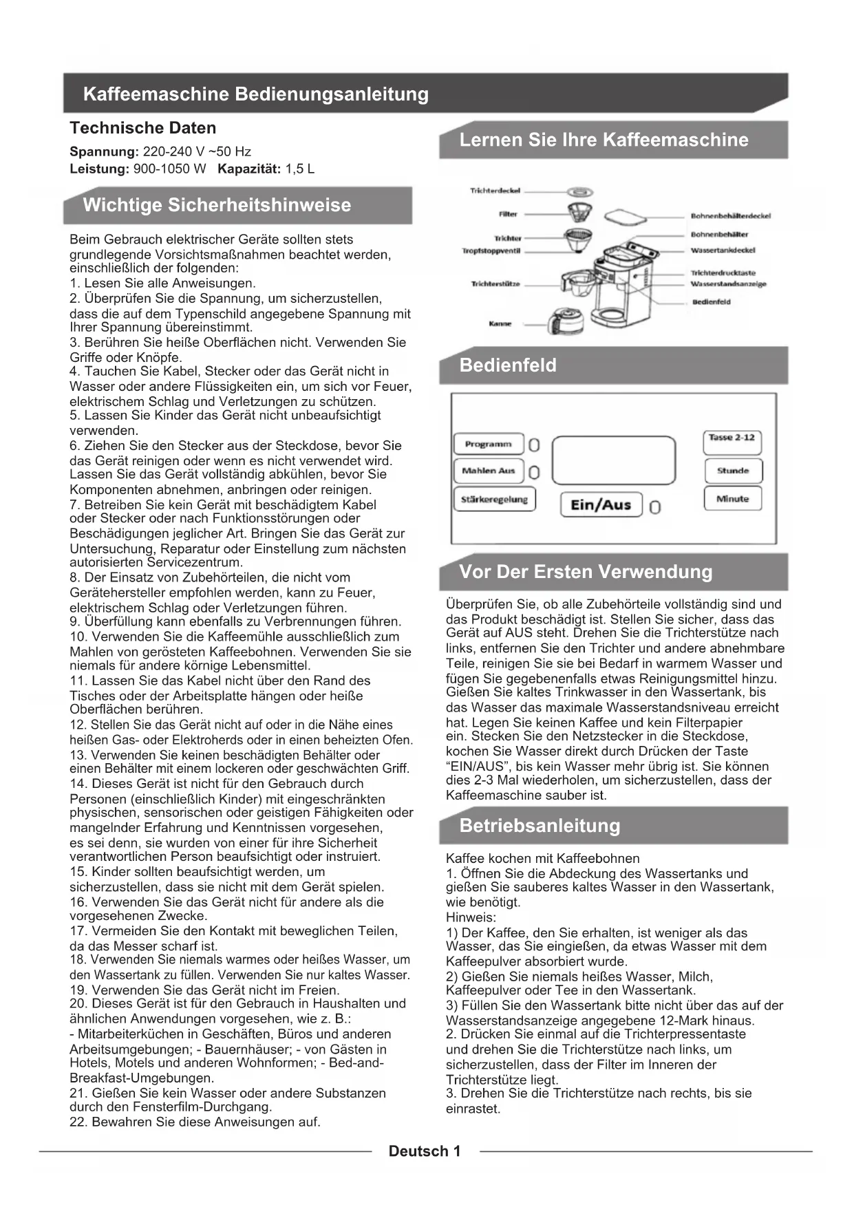 Wichtige Sicherheitshinweise Lernen Sie Ihre Kaffeemaschine Bedienfeld Vor Der Ersten Verwendung Betriebsanleitung Technische Daten Spannung: 220-240 V ~50 Hz Leistung: 900-1050 W Kapazität: 1,5 LDeutsch 2