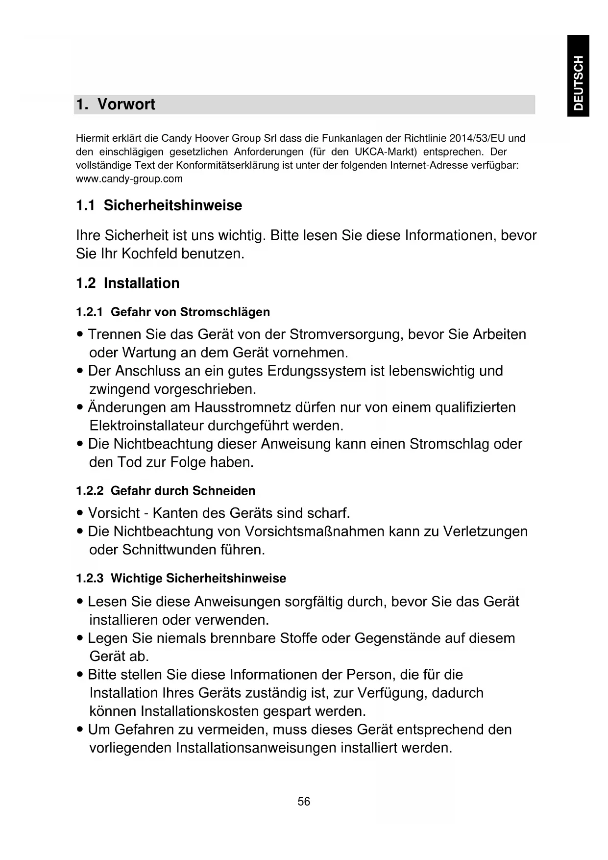 Hiermit erklärt die Candy Hoover Group Srl dass die Funkanlagen der Richtlinie 2014/53/EU und den einschlägigen gesetzlichen Anforderungen (für den UKCA-Markt) entsprechen. Der vollständige Text der Konformitätserklärung ist unter der folgenden Internet-Adresse verfügbar: www.candy-group.com