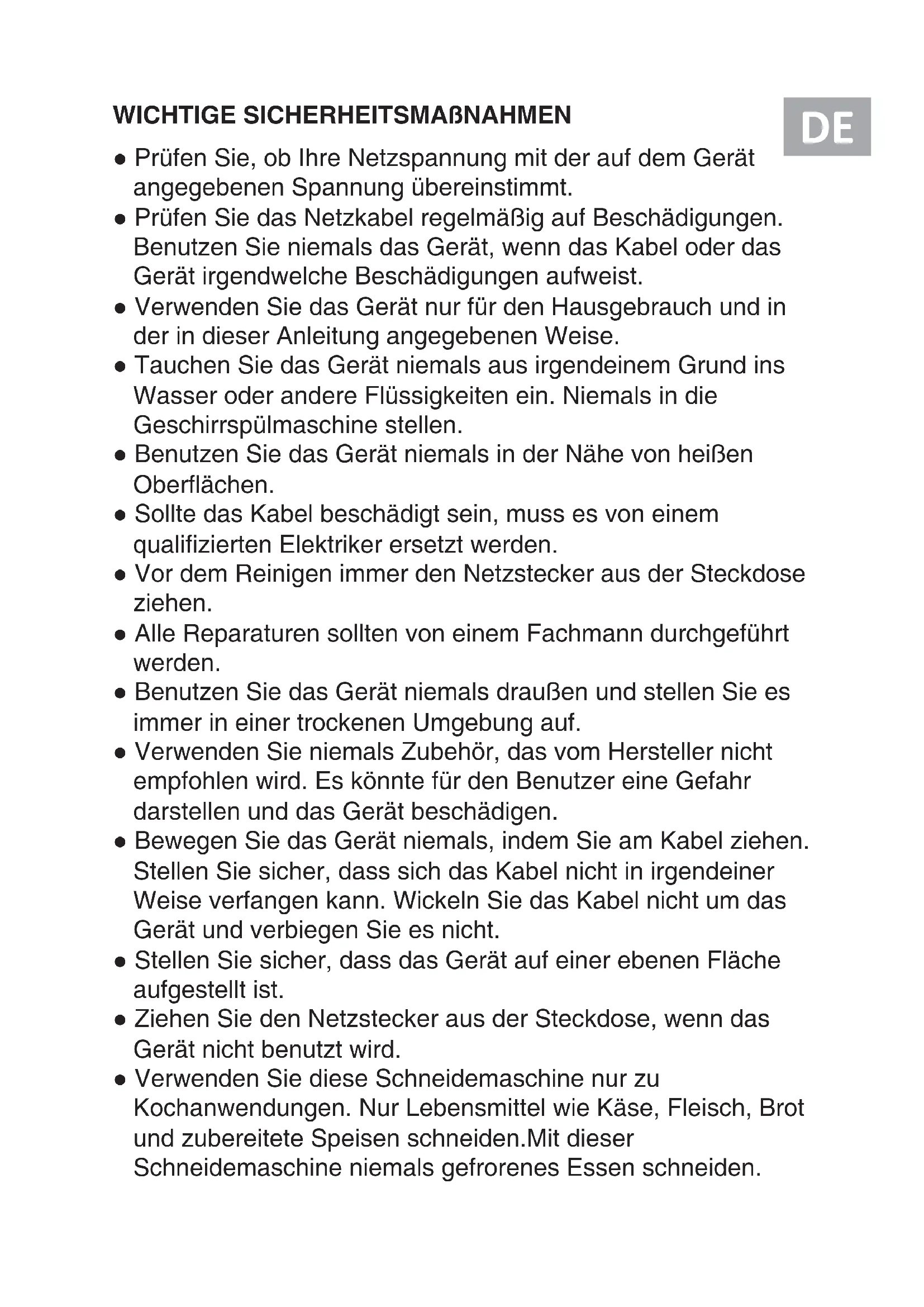 Manual de instruccionesWICHTIGE SICHERHEITSMAßNAHMEN Prüfen Sie, ob Ihre Netzspannung mit der auf dem Gerät angegebenen Spannung übereinstimmt. Prüfen Sie das Netzkabel regelmäßig auf Beschädigungen. Benutzen Sie niemals das Gerät, wenn das Kabel oder das Gerät irgendwelche Beschädigungen aufweist. Verwenden Sie das Gerät nur für den Hausgebrauch und in der in dieser Anleitung angegebenen Weise. Tauchen Sie das Gerät niemals aus irgendeinem Grund ins Wasser oder andere Flüssigkeiten ein. Niemals in die Geschirrspülmaschine stellen. Benutzen Sie das Gerät niemals in der Nähe von heißen Oberflächen. Sollte das Kabel beschädigt sein, muss es von einem qualifizierten Elektriker ersetzt werden. Vor dem Reinigen immer den Netzstecker aus der Steckdose ziehen. Alle Reparaturen sollten von einem Fachmann durchgeführt werden. Benutzen Sie das Gerät niemals draußen und stellen Sie es immer in einer trockenen Umgebung auf. Verwenden Sie niemals Zubehör, das vom Hersteller nicht empfohlen wird. Es könnte für den Benutzer eine Gefahr darstellen und das Gerät beschädigen. Bewegen Sie das Gerät niemals, indem Sie am Kabel ziehen. Stellen Sie sicher, dass sich das Kabel nicht in irgendeiner Weise verfangen kann. Wickeln Sie das Kabel nicht um das Gerät und verbiegen Sie es nicht. Stellen Sie sicher, dass das Gerät auf einer ebenen Fläche aufgestellt ist. Ziehen Sie den Netzstecker aus der Steckdose, wenn das Gerät nicht benutzt wird. Verwenden Sie diese Schneidemaschine nur zu Kochanwendungen. Nur Lebensmittel wie Käse, Fleisch, Brot und zubereitete Speisen schneiden.Mit dieser Schneidemaschine niemals gefrorenes Essen schneiden. DE Niemals Lebensmittel nur mit den Händen schneiden, immer den Schieber und die Essensführung benutzen, es sei denn, es sei wegen der Größe des Artikels unmöglich. Achten Sie darauf, das Messer niemals zu berühren. Dieses Gerät kann nicht kontinuierlich funktionieren, es ist kein professionelles Gerät. Es ist notwendig, Zwischenstopps zu machen. Das Schneidemesser des Gerätes ist extrem scharf, immer Vorsicht beim Reinigen des Gerätes ausüben. Es ist unbedingt erforderlich, dieses Gerät stets sauber zu halten, da es in direktem Kontakt mit dem Essen kommt. Vergewissern Sie sich, dass das Gerät bei dem Auseinandernehmen vor dem Reinigen vom Netz getrennt ist. Berühren Sie das Messer niemals, wenn das Gerät in Betrieb ist. Außerdem versuchen Sie niemals, die Bewegung des Schneidemessersauf irgendeine Weise vorzeitig zu stoppen. Ɣ Dieses Gerät kann von Kindern ab acht Jahren und älter sowie von Personen mit eingeschränkten physischen, sensorischen oder mentalen Fähigkeiten bzw. Mangel an Erfahrung und Kenntnissen verwendet werden, sofern sie zuvor in der sicheren Benutzung des Geräts unterwiesen worden sind und die einhergehenden Gefahren verstehen. Ɣ Kinder dürfen mit dem Gerät nicht spielen. Ɣ Reinigungs und Instandhaltungsmaßnahmen dürfen nur von Kindern über 8 Jahren und unter Aufsicht durchgeführt werden. Ɣ Gerät und Kabel dürfen nicht in die Hände von Kindern unter 8 Jahren gelangen. Ɣ Das Gerät ist nicht dafür vorgesehen, über eine externe Zeitschaltuhr oder separate Fernbedienung gesteuert zu werden. Ɣ Bei Beschädigung des Netzkabels ist dieses durch den Hersteller, einen Kundendienstmitarbeiter oder eine in ähnlicher Weise qualifizierte Person auszutauschen, um eine Gefährdung zu vermeiden.4