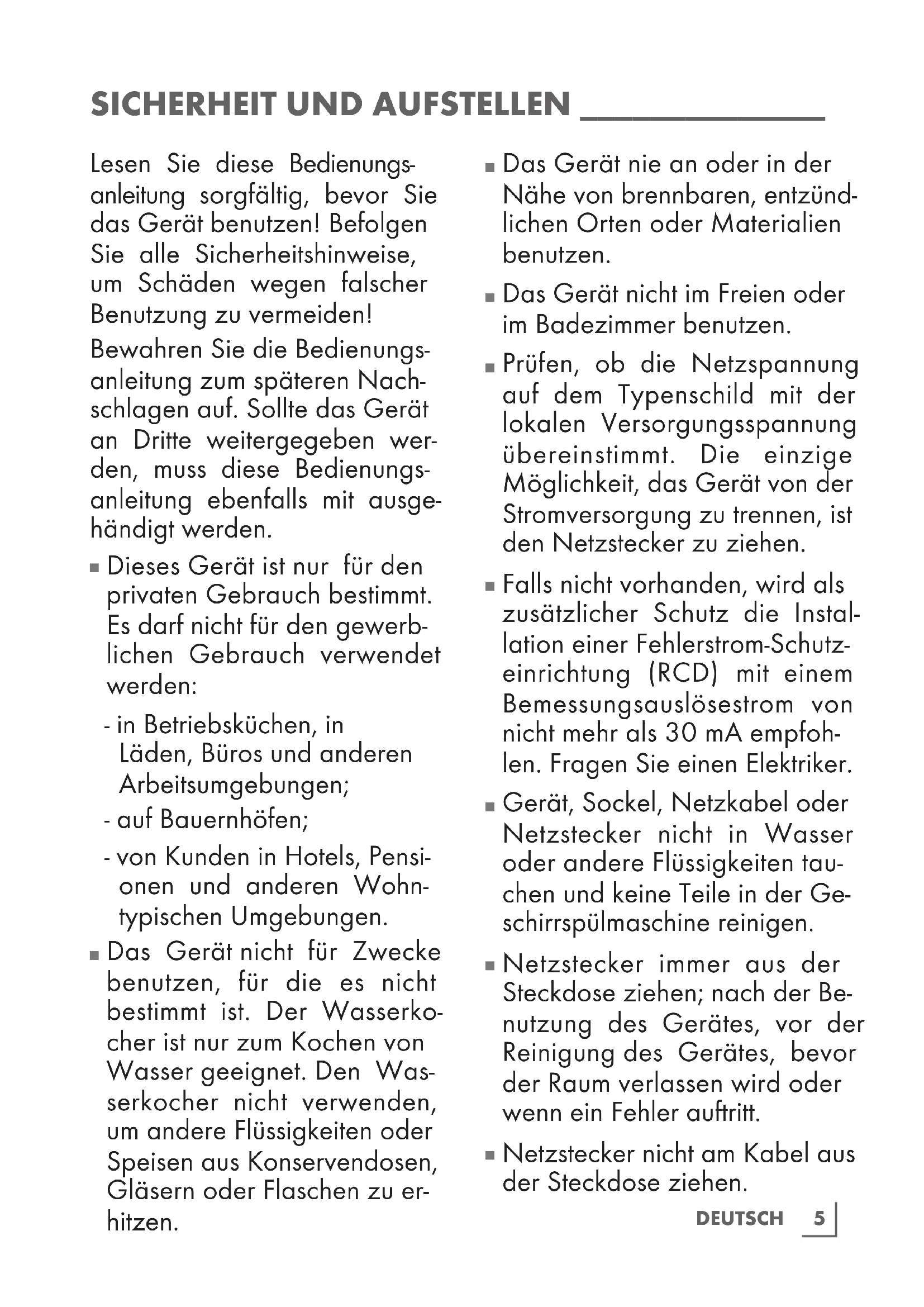 Das Gerät nicht für Zwecke benutzen, für die es nicht bestimmt ist. Der Wasserko- cher ist nur zum Kochen von Wasser geeignet. Den Was- serkocher nicht verwenden, um andere Flüssigkeiten oder Speisen aus Konservendosen, Gläsern oder Flaschen zu er- hitzen.