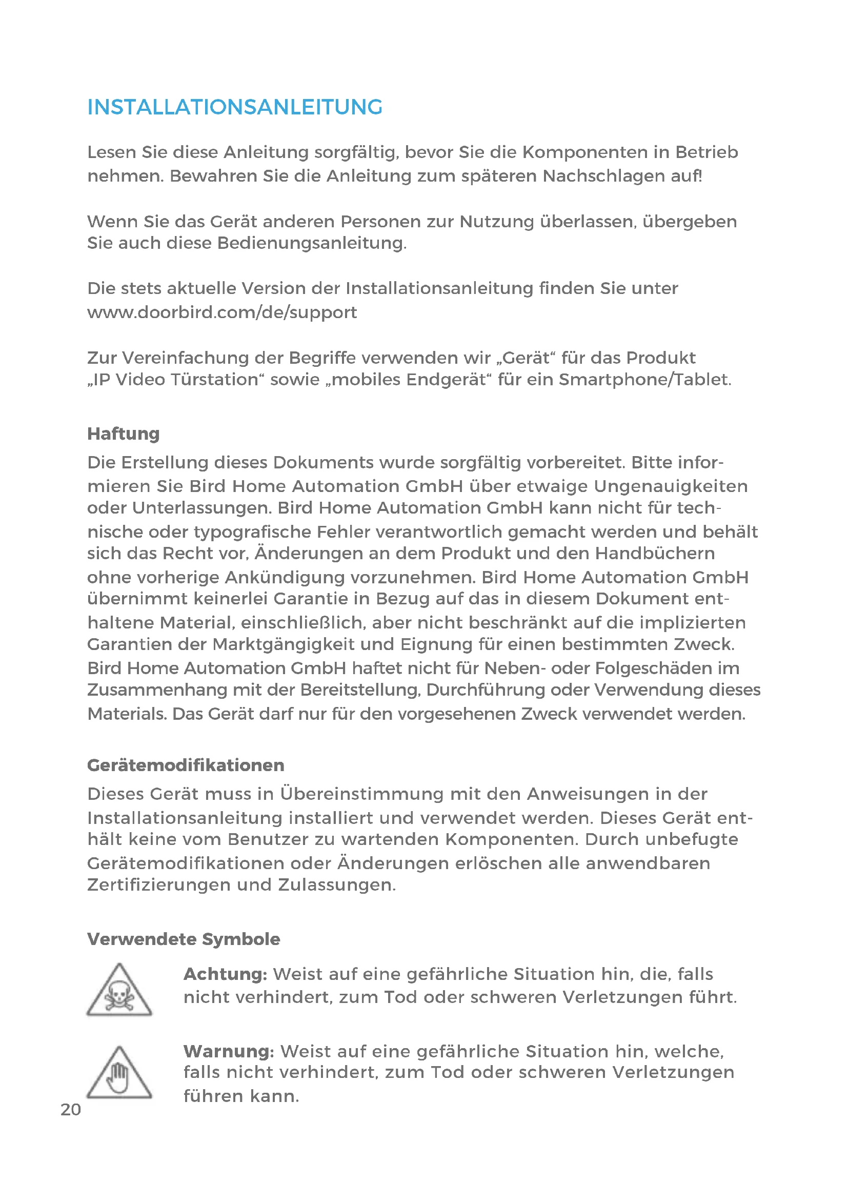 Instructions for disposal Do not dispose of the device with regular domestic waste. Electronic equipment must be disposed e.g. at local collection points for waste electronic equipment in compliance with the Waste Elec trical and Electronic Equipment Directive. Publisher Bird Home Automation GmbH Joachimsthaler Str. 12 10719 Berlin Germany Web: www.doorbird.com Email: hello@doorbird.com20 INSTALLATIONSANLEITUNG Lesen Sie diese Anleitung sorgfältig, bevor Sie die Komponenten in Betrieb nehmen. Bewahren Sie die Anleitung zum späteren Nachschlagen auf! Wenn Sie das Gerät anderen Personen zur Nutzung überlassen, übergeben Sie auch diese Bedienungsanleitung. Die stets aktuelle Version der Installationsanleitung finden Sie unter www.doorbird.com/de/support Zur Vereinfachung der Begriffe verwenden wir „Gerät“ für das Produkt „IP Video Türstation“ sowie „mobiles Endgerät“ für ein Smartphone/Tablet. Haftung Die Erstellung dieses Dokuments wurde sorgfältig vorbereitet. Bitte infor- mieren Sie Bird Home Automation GmbH über etwaige Ungenauigkeiten oder Unterlassungen. Bird Home Automation GmbH kann nicht für tech- nische oder typografische Fehler verantwortlich gemacht werden und behält sich das Recht vor, Änderungen an dem Produkt und den Handbüchern ohne vorherige Ankündigung vorzunehmen. Bird Home Automation GmbH übernimmt keinerlei Garantie in Bezug auf das in diesem Dokument ent- haltene Material, einschließlich, aber nicht beschränkt auf die implizierten Garantien der Marktgängigkeit und Eignung für einen bestimmten Zweck. Bird Home Automation GmbH haftet nicht für Neben- oder Folgeschäden im Zusammenhang mit der Bereitstellung, Durchführung oder Verwendung dieses Materials. Das Gerät darf nur für den vorgesehenen Zweck verwendet werden. Gerätemodifikationen Dieses Gerät muss in Übereinstimmung mit den Anweisungen in der Installationsanleitung installiert und verwendet werden. Dieses Gerät ent- hält keine vom Benutzer zu wartenden Komponenten. Durch unbefugte Gerätemodifikationen oder Änderungen erlöschen alle anwendbaren Zertifizierungen und Zulassungen. Verwendete Symbole Achtung: Weist auf eine gefährliche Situation hin, die, falls nicht verhindert, zum Tod oder schweren Verletzungen führt. Warnung: Weist auf eine gefährliche Situation hin, welche, falls nicht verhindert, zum Tod oder schweren Verletzungen führen kann.DEUTSCH