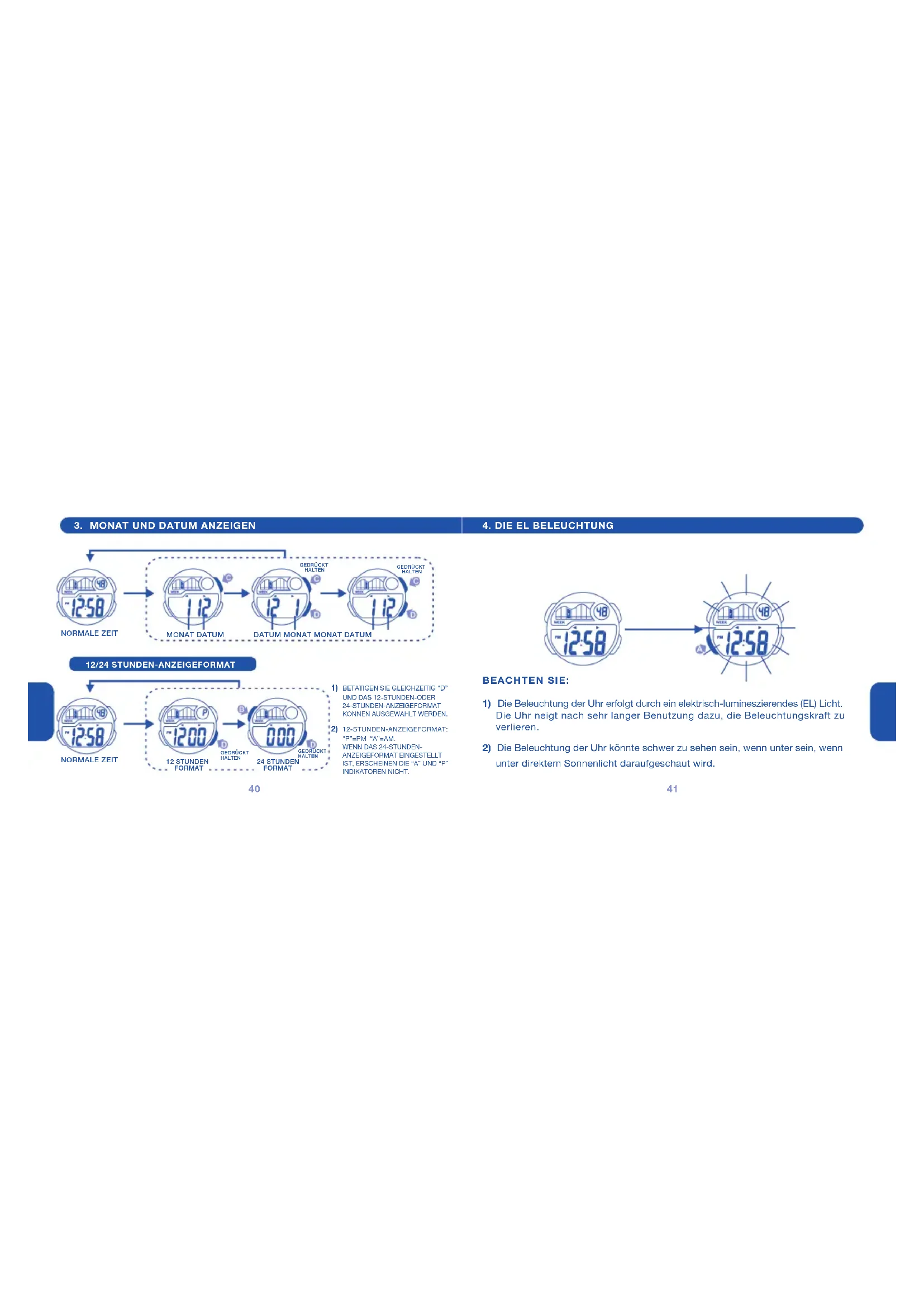 1) Die Beleuchting der Uhr erfolgt durch ein elektrisch-lumineszierendes (EL) Licht. Die Uhr neigt nach sehr länger Benutzung dazu, die Beleuchungskräft zu verlieren.