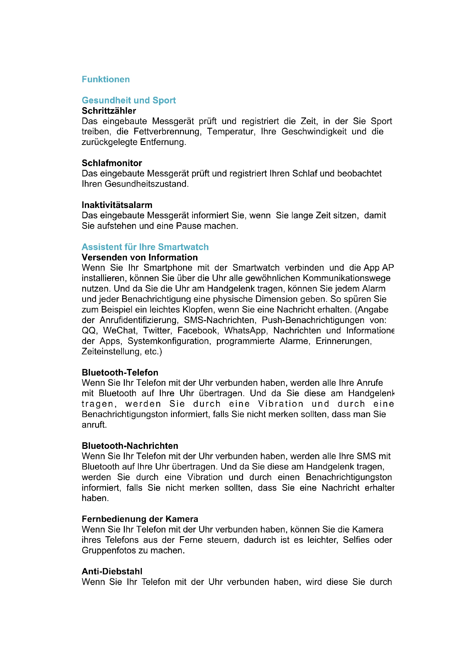 Lieferumfang 1 Smartwatch Prixton SW21, 1 Mikro-USB-Kabel, 1 Benutzerhandbuch Sicherheitspasswort Das Startpasswort ist 1212. Durch diese Option können Sie vermeiden, dass andere Personen Ihre Uhr ohne Ihre Erlaubnis verwenden. Bitte ändern Sie das Startpasswort, damit die Sicherheit Ihrer Informationen garantiert ist. Herunterladen der Synchronisierungssoftware Android Telefone Laden Sie sich die App Fundo Smartdevice in Ihrer Plattform zum Herunterladen von Anwendungen für Android, Play Store, herunter oder scannen Sie den QR-Code der Verpackung ein. Laden Sie die App zur Synchronisierung mit Ihrem Android-Telefon herunter. Diese App wird nur dafür verwendet, die Uhr mit dem Telefon zu synchronisieren, und verbraucht keine Datendienste. Wenn Sie die entsprechende Software bereits heruntergeladen haben, prüfen Sie, um welche Version es sich handelt, und verwenden Sie die neuste verfügbare Synchronisierungssoftware, um die korrekte Funktionsweise zu garantieren. Aktualisieren Sie die Synchronisierungssoftware immer, wenn es eine neue Version gibt. iPhone Laden Sie sich die App Fundo SmartDevice in Ihrer Plattform zum Herunterladen von Anwendungen für IOS, App Store, herunter oder indem Sie den auf der Verpackung vorhanden BIDI-Code für IOS einscannen, und installieren Sie sie. Bluetoothverbindung und Synchronisierungsfunktion Vom Telefon zur Uhr Einstellen der Uhr: Aktivieren Sie das Bluetooth, suchen Sie Geräte und tippen Sie auf Geräte verknüpfen, wenn Sie "SW21 Prixton" gefunden haben. Stimmen Sie auch auf dem Telefon zu, um die vollständige Verbindung Akku-Abdeckungherzustellen. Wählen Sie "ja", wenn Sie eine Anfrage der Kontaktliste erhalten. Außerdem ist es besser "nicht mehr fragen" auszuwählen, damit sie nicht jedes Mal erscheint, wenn Sie die Verbindung aufbauen. Achtung: Die Synchronisierungssoftware kann die App öffnen, wenn diese bereits installiert und zugriffsbereit ist. Wenn 2 bis 5 Minuten vergangen sind, gibt das Telefon an, dass die Verbindung aufgebaut wurde. Die Uhr wird ebenfalls über die Bluetoothverbindung informieren. Die auf dem Telefon erhaltenen Nachrichten werden mit der Uhr synchronisiert. Von der Uhr zum Telefon Tippen Sie auf der Uhr auf das Wahlfeld Bluetooth und auf "Neues Gerät suchen". Sobald Ihr Telefon gefunden wurde (zum Beispiel Samsung S5), wählen Sie "Verbinden". Der übrige Vorgang verläuft genau wie im Punkt Beschrieben. Anleitungen Laden Sie den Akku vollständig auf, bevor Sie die Uhr benutzen. Die Ladezeit beträgt etwa eine Stunde. Verwenden Sie das bereitgestellte Zubehör oder das Ihres Android-Telefons. Das Bluetooth kann nicht abgestellt werden, wenn man sich außerhalb der Reichweite desselben befindet. Wenn Sie die Anti-Diebstahl-Funktion aktviert haben, kann die Suchfunktion nicht genutzt werden, solange die Bluetooth-Verbindung nicht wiederhergestellt wurde. Sollte die Bluetooth-Verbindung zufällig unterbrochen werden, stellen Sie sie wieder her. Sie müssen der Synchronisierung der Kontakte zustimmen, wenn Beim Abspielen von Musik werden einige Liednamen nicht angezeigt. Das ist normal und auf interne Funktionen von Android zurückzuführen.ITFunzioni Salute e fitness Podometro Accelerometro integrato che controlla e registra l'allenamento, i grassi bruciati, la temperatura, la velocità e la distanza.. Monitoraggio del sonno Accelerometro integrato che controlla e registra il sonno e controlla lo stato di salute. Allarme sedentarismo Accelerometro incorporato che avvisa l'utente quando è seduto da molto tempo ed è ora di alzarsi e fare una pausa. Assistente per lo smartphone Invio di informazioni Dopo aver collegato lo smartphone con lo smartwatch e installato la app APK, l'orologio consentirà di effettuare tutte le forme più comuni di comunicazione. Portandolo al polso, è possibile dare anche una dimensione fisica agli avvisi e alle notifiche. Ad esempio, si percepisce un leggero tocco ad ogni messaggio ricevuto. (Visualizzazione dell’identità del chiamante, notifiche SMS, push dei messaggi: QQ, WeChat, Twitter, Facebook, WhatsApp, notizie e informazioni sulle applicazioni, impostazioni di sistema, avvisi programmati, promemoria, impostazione dell’ora, ecc.) Telefono Bluetooth Dopo che il telefono sarà collegato con l'orologio, tutte le chiamate saranno trasferite all'orologio tramite Bluetooth. E con l’orologio al polso, se non ci si rende conto di ricevere una telefonata, saranno una vibrazione e un suono di segnalazione ad avvisare. Messaggi Bluetooth Dopo che il telefono sarà collegato con l'orologio, tutti i messaggi SMS saranno trasferiti all'orologio tramite Bluetooth. E con l’orologio al polso, se non ci si rende conto di ricevere un messaggio, saranno una vibrazione e un suono di segnalazione ad avvisare. Telecomando della fotocamera Dopo aver collegato il telefono con l'orologio, è possibile controllare a distanza la fotocamera dello smartphone e quindi fare selfies e foto di gruppo. Anti-perdita Dopo aver collegato l’orologio allo smartphone, questo avviserà con una vibrazione o un suono di allarme nel momento in cui è fuori dalla portata del Bluetooth. Inoltre, è possibile cercare l'orologio con il telefono e viceversa quando entrambi sono all'interno della portata del Bluetooth.Comunicazione e social network Se si inserisce una scheda SIM nell’orologio, è possibile effettuare e ricevere chiamate ed inviare, ricevere e rispondere ai messaggi SMS. Intrattenimento Per l’intrattenimento ci sono il lettore di musica, video, il registratore, la fotocamera, ecc Assistente personale Lo smartwatch può inoltre essere un assistente personale con album fotografico, agenda, calcolatrice, temi personalizzabili e altre funzioni. Data e ora Gli orologi di alta qualità sono sempre stati caratterizzati dalla loro precisione e lo smartwatch Prixton non fa eccezione. Esso consente inoltre di personalizzare la visualizzazione dell’ora sul quadrante scegliendo tra 3 opzioni per renderlo p
