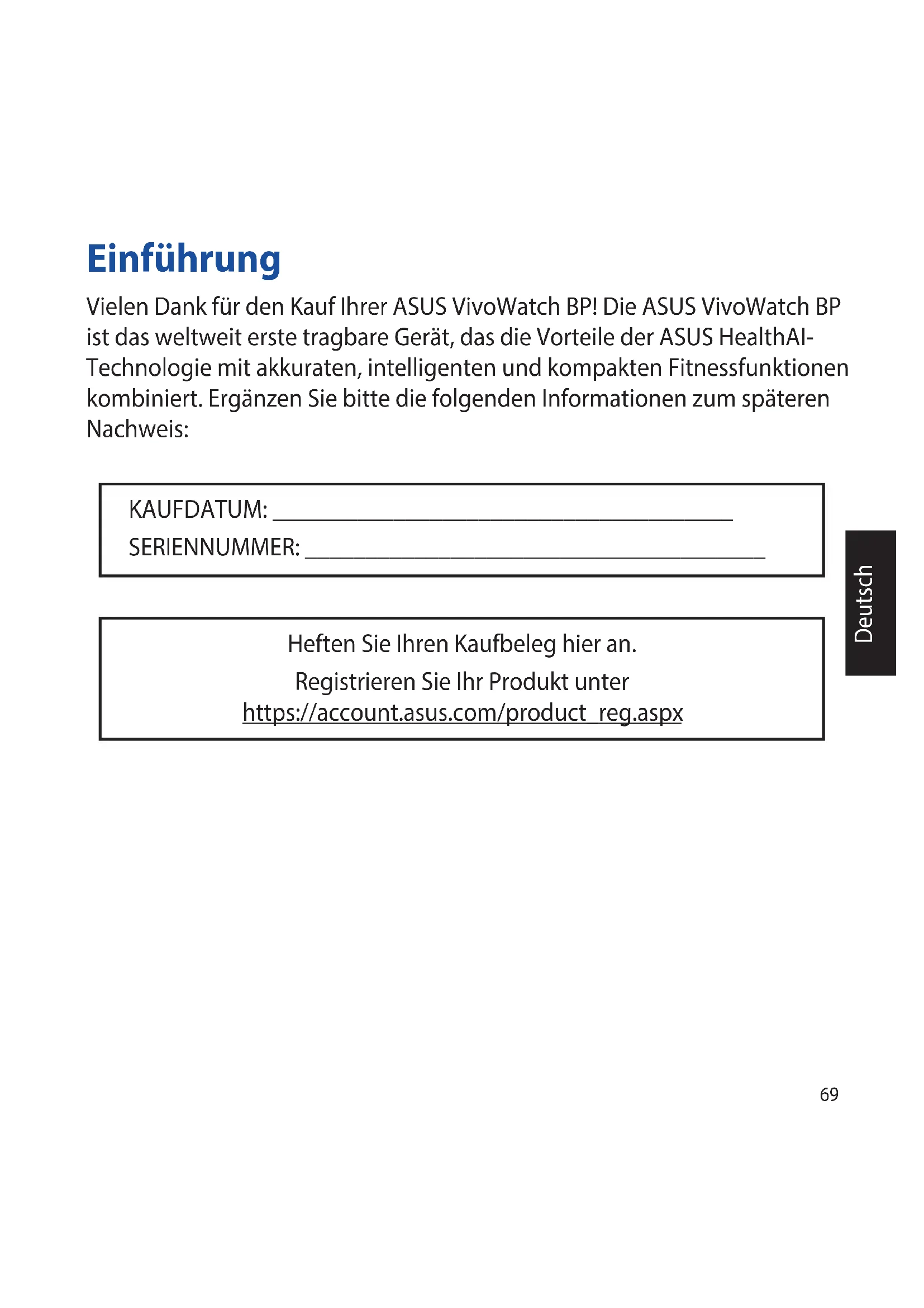 message contextuel apparaît lorsque la mise à jour du rmware est terminée.69 Deutsch Einführung Vielen Dank für den Kauf Ihrer ASUS VivoWatch BP! Die ASUS VivoWatch BP ist das weltweit erste tragbare Gerät, das die Vorteile der ASUS HealthAI- Technologie mit akkuraten, intelligenten und kompakten Fitnessfunktionen kombiniert. Ergänzen Sie bitte die folgenden Informationen zum späteren Nachweis: KAUFDATUM: ______________________________________ SERIENNUMMER: ______________________________________ Heften Sie Ihren Kaufbeleg hier an. Registrieren Sie Ihr Produkt unter https://account.asus.com/product_reg.aspx70 Deutsch Über dieses Handbuch Diese Anleitung liefert Informationen über die Hardware- und Softwaremerkmale Ihrer ASUS VivoWatch BP, geordnet in folgenden Kapiteln: Kapitel 1: Erste Schritte Dieses Kapitel beschreibt die Hardware-Komponenten Ihrer ASUS VivoWatch BP und legt dar, wie Sie die verschiedenen Bestandteile Ihrer ASUS VivoWatch BP benutzen. Kapitel 2: Ihre ASUS VivoWatch BP verwenden Dieses Kapitel bietet eine Übersicht zur Nutzung Ihrer ASUS VivoWatch BP. Anhang Dieser Abschnitt enthält Hinweise zu Ihrer ASUS VivoWatch BP. Lesen Sie alle Informationen in der Bedienungsanleitung und mögliche weitere Hinweiszettel im Paket, bevor Sie das Gerät in Betrieb nehmen. Für die vollständige Handbuchversion zu Ihrer ASUS VivoWatch BP besuchen Sie unsere mehrsprachige Webseite unter: https://www.asus.com/VivoWatch/VivoWatch- BP-HC-A04/HelpDesk_Manual/.71 Deutsch Anmerkungen zu diesem Handbuch Zum Hervorheben wichtiger Informationen sind manche Textabschnitte in diesem Handbuch wie folgt gekennzeichnet: Diese Meldung enthält wichtige Informationen, denen Sie folgen müssen, um die Aufgabe fertigzustellen. Diese Meldung enthält zusätzliche Informationen und Tipps, die Ihnen bei der Fertigstellung einer Aufgabe helfen können. Diese Mitteilung enthält wichtige Informationen, die zur Gewährleistung Ihrer Sicherheit bei der Durchführung von Aufgaben und zur Verhinderung von Schäden an den Daten und Komponenten Ihrer ASUS VivoWatch BP befolgt werden müssen. Typographie Fett = Diese Schriftart zeigt Ihnen ein Menü oder ein Element, welches ausgewählt werden muss. KURSIV = Diese Schriftart zeigt an, dass Sie sich auf einen bestimmten Abschnitt in diesem Handbuch beziehen können.72 Deutsch Sicherheitshinweise