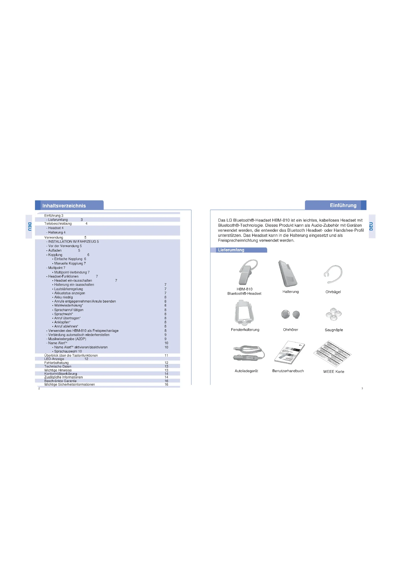 Inhaltsverzeichnis HBM-810 Bluetooth®-Headset Ohrbügel Halterung Fensterhalterung WEEE Karte Autoladegerät Ohrhörer Saugnäpfe Benutzerhandbuch DEU DEU Einführung 3 - Lieferumfang 3 Teilebeschreibung 4 - Headset 4 - Halterung 4 Verwendung 5
