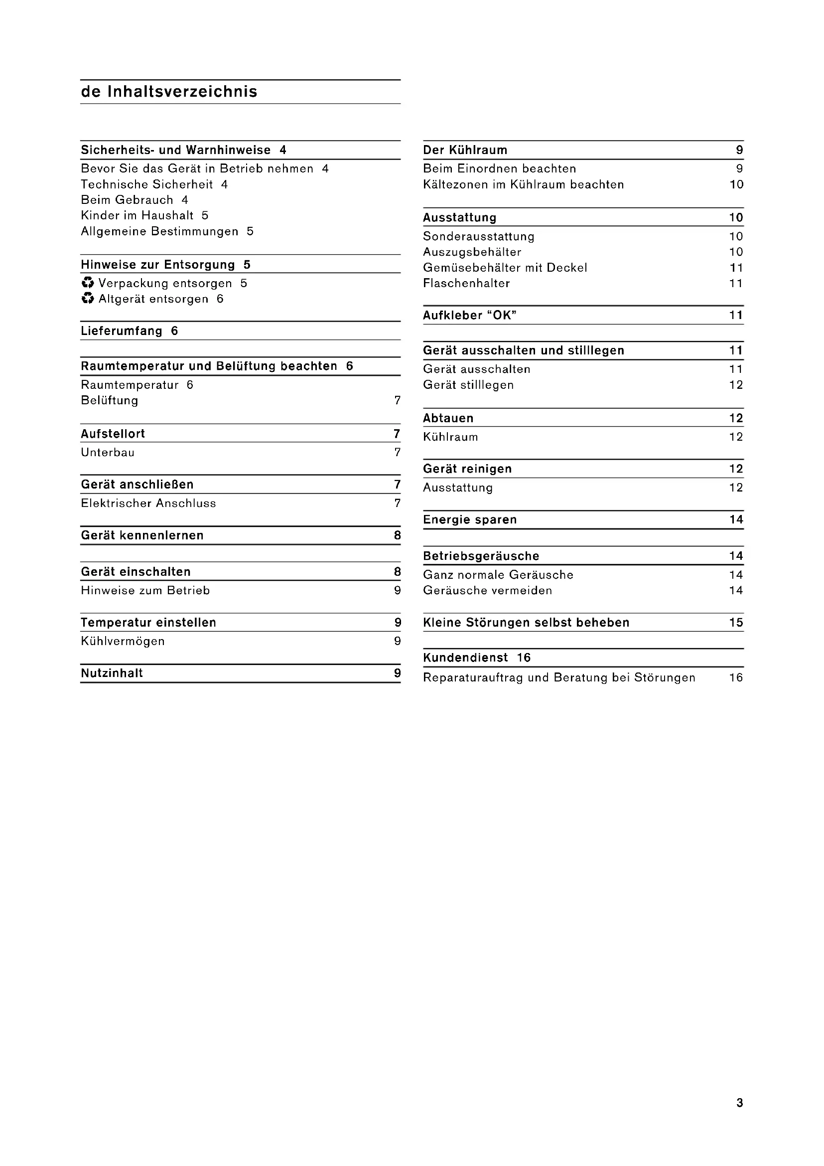 - Altgerät entsorgen 6 Lieferumfang 6 Raumtemperatur und Belüftung beachten 6 Raumtemperatur 6 Belüftung 7 Aufstellort 7 Unterbau 7 Gerät anschließen 7 Elektrischer Anschluss 7 Gerät kennenlernen 8 Gerät einschalten 8 Hinweise zum Betrieb 9 Temperatur einstellen 9 Kühlvermögen 9 Nutzinhalt 9 Der Kühlraum 9 Beim Einordnen beachten 9 Kältezonen im Kühlraum beachten 10 Ausstattung 10 Sonderausstattung 10 Auszugsbehälter 10 Gemüsebehälter mit Deckel 11 Flaschenhalter 11 Aufkleber “OK” 11 Gerät ausschalten und stilllegen 11 Gerät ausschalten 11 Gerät stilllegen 12 Abtauen 12 Kühlraum 12 Gerät reinigen 12 Ausstattung 12 Energie sparen 14 Betriebsgeräusche 14 Ganz normale Geräusche 14 Geräusche vermeiden 14 Kleine Störungen selbst beheben 15 Kundendienst 16 Reparaturauftrag und Beratung bei Störungen 164 m Sicherheits- und Warnhinweise Bevor Sie das Gerät in Betrieb nehmen Lesen Sie Gebrauchs- und Montageanleitung aufmerksam durch! Sie enthalten wichtige Informationen über Aufstellen, Gebrauch und Wartung des Gerätes. Der Hersteller haftet nicht, wenn Sie die Hinweise und Warnungen der Gebrauchsanleitung missachten. Bewahren Sie alle Unterlagen für späteren Gebrauch oder für Nachbesitzer auf. Technische Sicherheit Das Gerät enthält in geringer Menge das umweltfreundliche, aber brennbare Kältemittel R600a. Achten Sie darauf, dass die Rohre des Kältemittel-Kreislaufes bei Transport oder Montage nicht beschädigt werden. Herausspritzendes Kältemittel kann zu Augenverletzungen führen oder sich entzünden. Bei Beschädigung ▯ offenes Feuer oder Zündquellen vom Gerät fernhalten, ▯ Raum für einige Minuten gut durchlüften, ▯ Gerät ausschalten und Netzstecker ziehen, ▯ Kundendienst benachrichtigen. Je mehr Kältemittel in einem Gerät ist, umso größer muss der Raum sein, in dem das Gerät steht. In zu kleinen Räumen kann bei einem Leck ein brennbares Gas-Luft- Gemisch entstehen. Pro 8 g Kältemittel muss der Raum mindestens 1 m³ groß sein. Die Menge des Kältemittels Ihres Gerätes steht auf dem Typenschild im Inneren des Gerätes. Wenn die Netzanschlussleitung dieses Gerätes beschädigt wird, muss sie durch den Hersteller, Kundendienst oder eine ähnlich qualifizierte Person ersetzt werden. Unsachgemäße Installationen und Reparaturen können den Benutzer erheblich gefährden. Reparaturen dürfen nur durch den Hersteller, Kundendienst oder eine ähnlich qualifizierte Person durchgeführt werden. Es dürfen nur Originalteile des Herstellers benutzt werden. Nur bei diesen Teilen gewährleistet der Hersteller, dass sie die Sicherheitsanforderungen erfüllen. Eine Verlängerung der Netzanschlussleitung darf nur über den Kundendienst bezogen werden. Beim Gebrauch ▯ Nie elektrische Geräte innerhalb des Gerätes verwenden (z. B. Heizgeräte, elektrische Eisbereiter usw.). Explosionsgefahr! ▯ Nie das Gerät mit einem Dampfreinigungsgerät abtauen oder reinigen! Der Dampf kann an elektrische Teile gelangen und einen Kurzschluss auslösen. Stromschlaggefahr! ▯ Keine spitzen oder scharfkantigen Gegenstände verwenden, um Reif- und Eisschichten zu entfernen. Sie könnten damit die Kältemittel-Rohre beschädigen. Herausspritzendes Kältemittel kann sich entzünden oder zu Augenverletzungen führen. ▯ Keine Produkte mit brennbaren Treibgasen (z. B. Spraydosen) und keine explosiven Stoffe lagern. Explosionsgefahr! ▯ Sockel, Auszüge, Türen usw. nicht als Trittbrett oder zum Abstützen missbrauchen.5 ▯ Zum Abtauen und Reinigen Netzstecker ziehen oder Sicherung ausschalten. Am Netzstecker ziehen, nicht am Anschlusskabel. ▯ Hochprozentigen Alkohol nur dicht verschlossen und stehend lagern. ▯ Kunststoffteile und Türdichtung nicht mit Öl oder Fett verschmutzen. Kunststoffteile und Türdichtung werden sonst porös. ▯ Be- und Entlüftungsöffnungen für das Gerät nie abdecken oder zustellen. ▯ Vermeidung von Risiken für Kinder und gefährdete Personen: Gefährdet sind Kinder, Personen, die körperlich, psychisch oder in ihrer Wahrnehmung eingeschränkt sind sowie Personen, die nicht genügend Wissen über die sichere Bedienung des Gerätes haben. Stellen Sie sicher, dass Kinder und gefährdete Personen die Gefahren verstanden haben. Eine für die Sicherheit verantwortliche Person muss Kinder und gefährdete Personen am Gerät beaufsichtigen oder anleiten. Nur Kinder ab 8 Jahren das Gerät benutzen lassen. Bei Reinigung und Wartung Kinder beaufsichtigen. Niemals Kinder mit dem Gerät spielen lassen. Kinder im Haushalt ▯ Verpackung und deren Teile nicht Kindern überlassen. Erstickungsgefahr durch Faltkartons und Folien! ▯ Das Gerät ist kein Spielzeug für Kinder! ▯ Bei Gerät mit Türschloss: Schlüssel außer Reichweite von Kindern aufbewahren! Allgemeine Bestimmungen Das Gerät eignet sich zum Kühlen von Lebensmitteln. Dieses Gerät ist für den häuslichen Gebrauch im Privathaushalt und das häusliche Umfeld bestimmt. Das Gerät ist funkentstört nach EU-Richtlinie 2004/108/EC. Der Kältekreislauf ist auf Dichtheit geprüft. Dieses Erzeugnis entspricht den einschlägigen Sicherheitsbestimmungen für Elektrogeräte (EN 60335-2-24). Dieses Gerät ist für eine Nutzung bis zu einer Höhe von maximal 2000 Metern über dem Meeresspiegel bestimmt. Hinweise zur Entsorgung