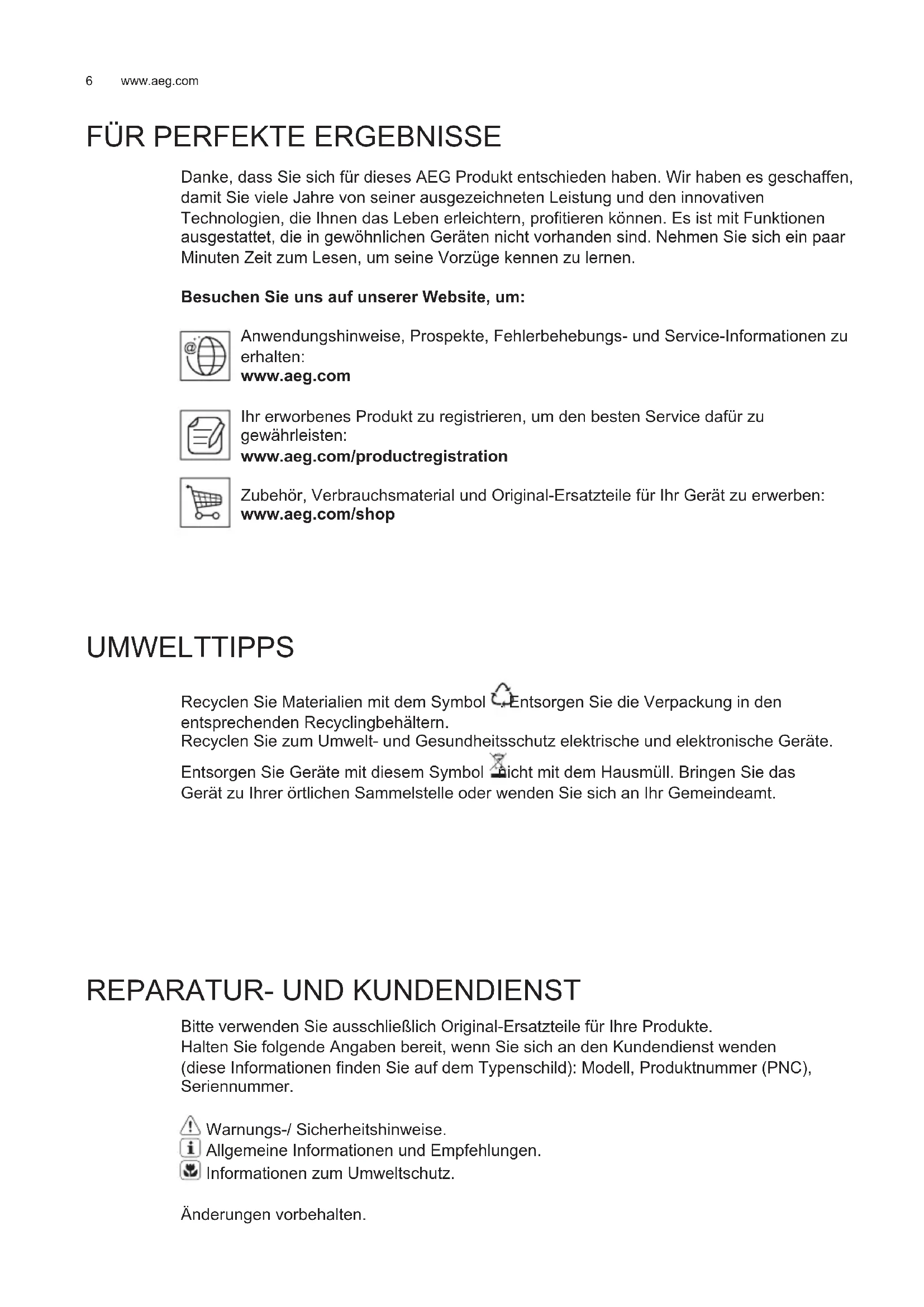 Bitte verwenden Sie ausschließlich Original-Ersatzteile für Ihre Produkte. Halten Sie folgende Angaben bereit, wenn Sie sich an den Kundendienst wenden (diese Informationen finden Sie auf dem Typenschild): Modell, Produktnummer (PNC), Seriennummer. Warnungs-/ Sicherheitshinweise. Allgemeine Informationen und Empfehlungen. Informationen zum Umweltschutz. Änderungen vorbehalten. DE GEBRAUCHSANLEITUNG7 DEUTSCH