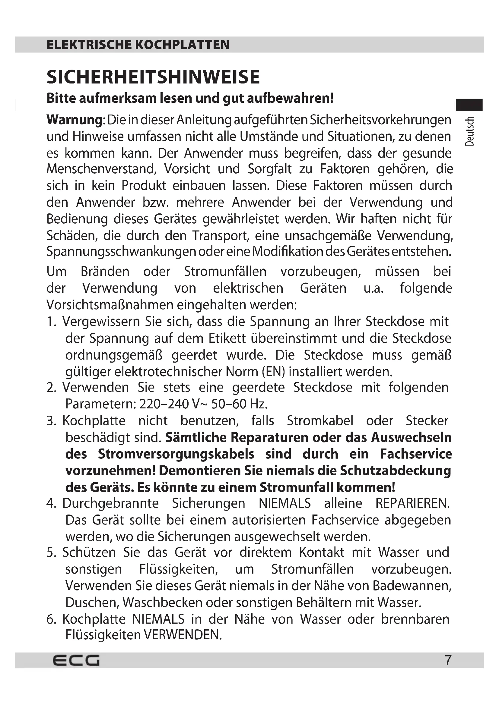 Verpackungspapier und Wellpappe – zum Altpapier geben. Verpackungsfolie, PET-Beutel, Plastikteile – in den Sammelcontainer für Plastik. ENTSORGUNG DES PRODUKTES NACH ABLAUF DER LEBENSDAUER Die Entsorgung der verwendeten elektrischen und elektronischen Geräte (gültig in den Mitgliedsländern der EU und weiteren europäischen Ländern mit dem eingeführten System der Abfalltrennung)Das abgebildete Symbol auf dem Produkt oder auf der Verpackung bedeutet, dass das Produkt nicht als Hausmüll abgegeben werden soll. Das Produkt geben Sie an einem Ort ab, der für das Recycling von elektrischen und elektronischen Geräten bestimmt ist. Die richtige Entsorgung des Produktes schützt Sie vor negativen Einüssen auf die menschliche Gesundheit und des Lebensraumes.Das Recycling des Materials trägt zum Schutz der Naturressourcen bei. Mehr Informationen über das Recycling dieses Produktes gibt Ihnen die Kommunalbehörde, Organisationen für die Bearbeitung von Hausabfall oder die Verkaufsstelle, in der Sie das Produkt erworben haben. Dieses Produkt erfüllt die Anforderung der EU-Richtlinien über elektromagnetische Kompatibilität und elektrische Sicherheit. Bedienungsanleitung s. www.ecg-electro.eu. Eine Änderung des Textes und der technischen Parameter vorbehalten. 08/05Čeština Čeština