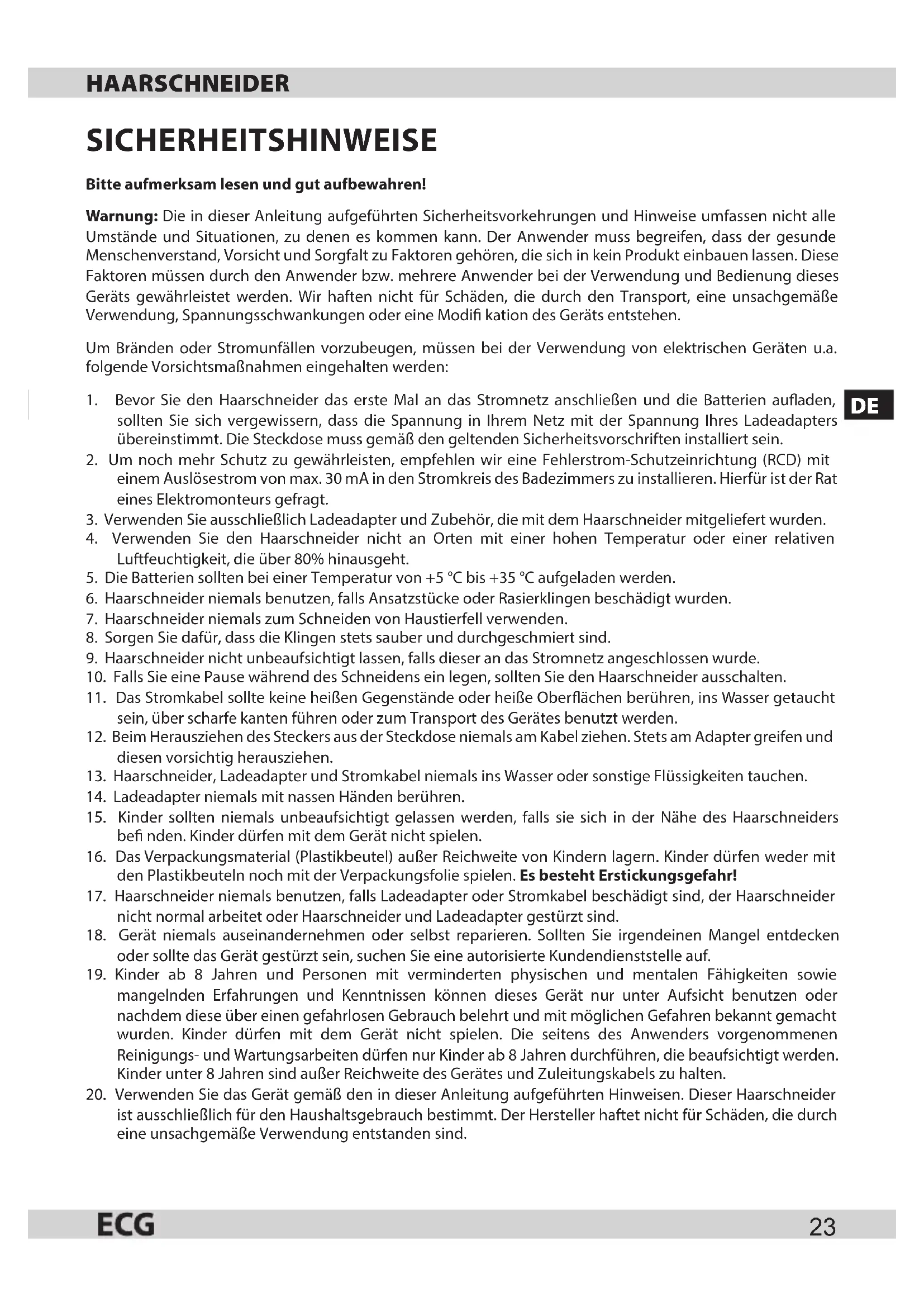 20. Verwenden Sie das Gerät gemäß den in dieser Anleitung aufgeführten Hinweisen. Dieser Haarschneider
