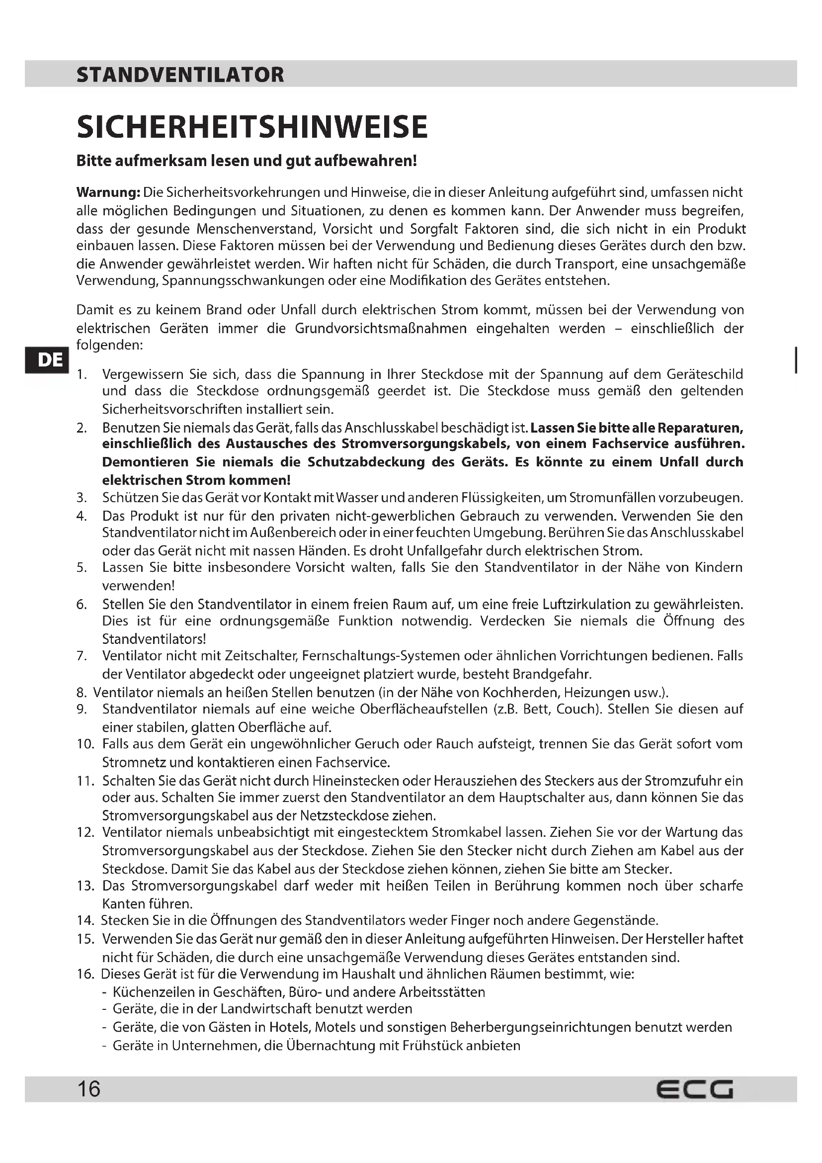 Verpackungspapier und Wellpappe – zum Altpapier geben. Verpackungsfolie, PET-Beutel, Plastikteile – in den Sammelcontainer für Plastik. ENTSORGUNG DES PRODUKTES NACH ABLAUF DER LEBENSDAUER Die Entsorgung der verwendeten elektrischen und elektronischen Geräte (gültig in den Mitgliedsländern der EU und weiteren europäischen Ländern mit dem eingeführten System der Abfalltrennung) Das abgebildete Symbol auf dem Produkt oder auf der Verpackung bedeutet, dass das Produkt nicht als Hausmüll abgegeben werden soll. Das Produkt geben Sie an einem Ort ab, der für das Recycling von elektrischen und elektronischen Geräten bestimmt ist. Die richtige Entsorgung des Produktes schützt Sie vor negativen Einüssen auf die menschliche Gesundheit und des Lebensraumes. Das Recycling des Materials trägt zum Schutz der Naturressourcen bei. Mehr Informationen über das Recycling dieses Produktes gibt Ihnen die Kommunalbehörde, Organisationen für die Bearbeitung von Hausabfall oder die Verkaufsstelle, in der Sie das Produkt erworben haben. Dieses Produkt erfüllt die Anforderung der EU-Richtlinien über elektromagnetische Kompatibilität und elektrische Sicherheit. Bedienungsanleitung s. www.ecg-electro.eu. Eine Änderung des Textes und der technischen Parameter vorbehalten. 08/05GB PEDESTAL FAN