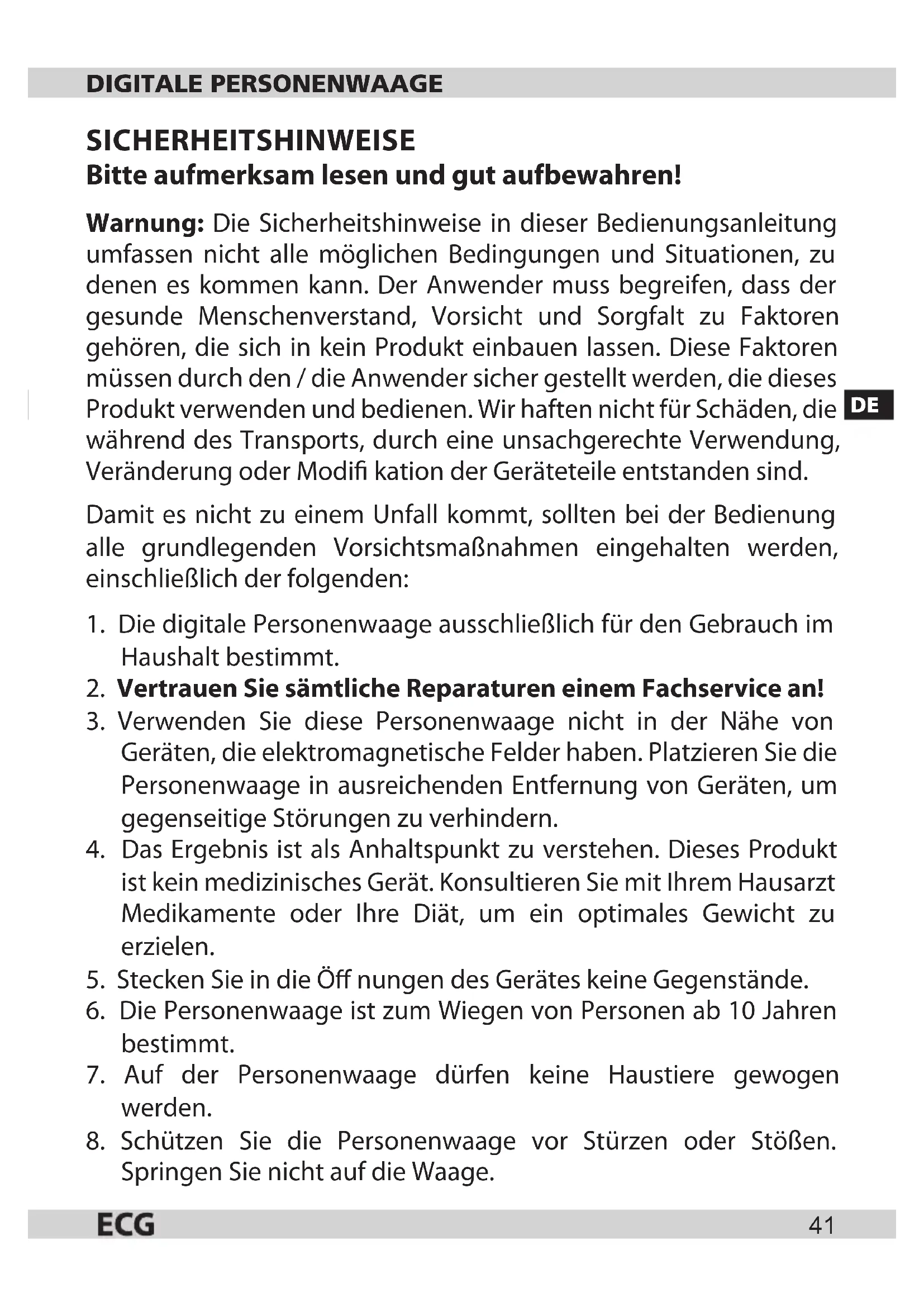 6. Die Personenwaage ist zum Wiegen von Personen ab 10 Jahren
