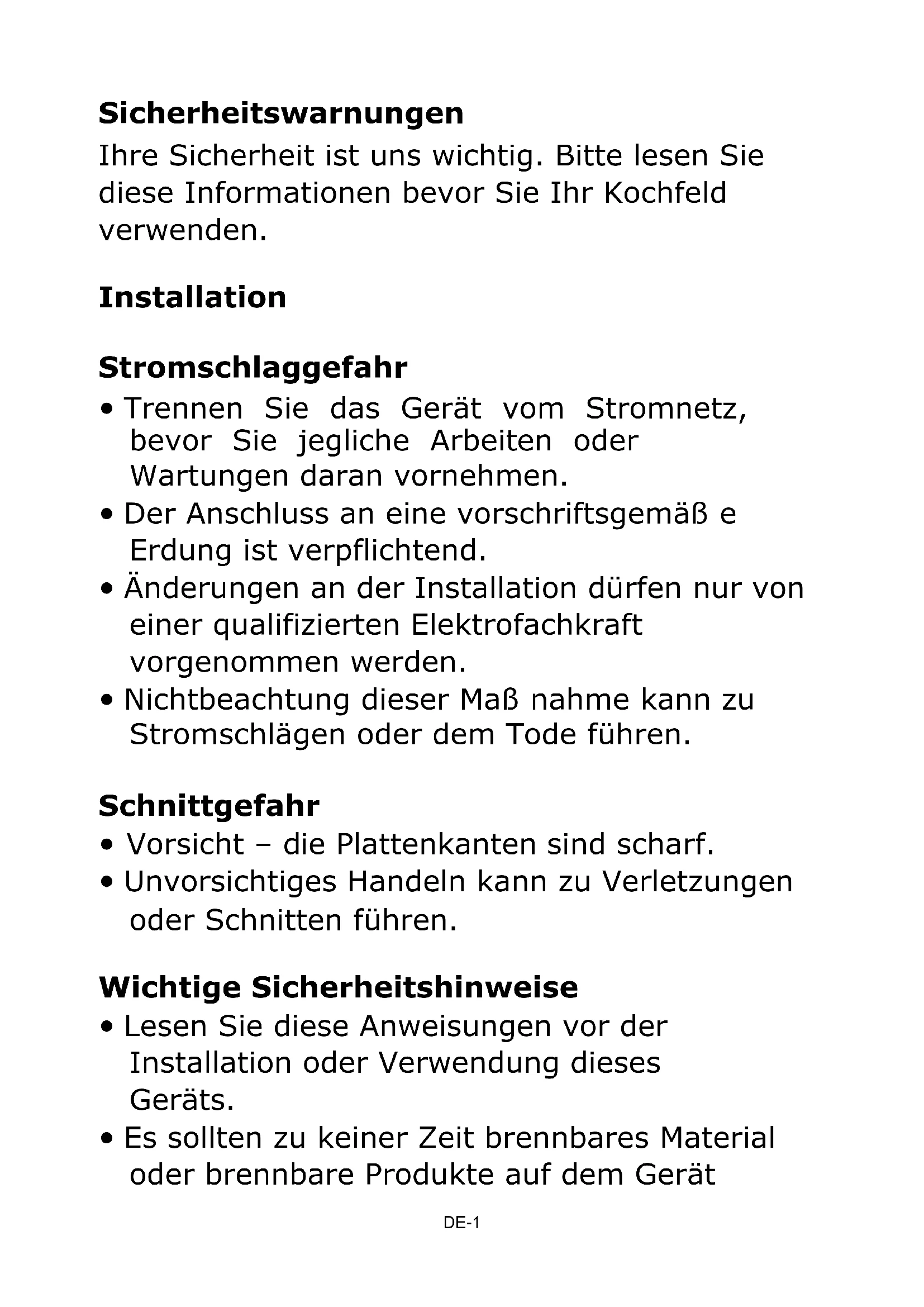 - Es sollten zu keiner Zeit brennbares Material oder brennbare Produkte auf dem Gerät DE-1abgestellt werden.