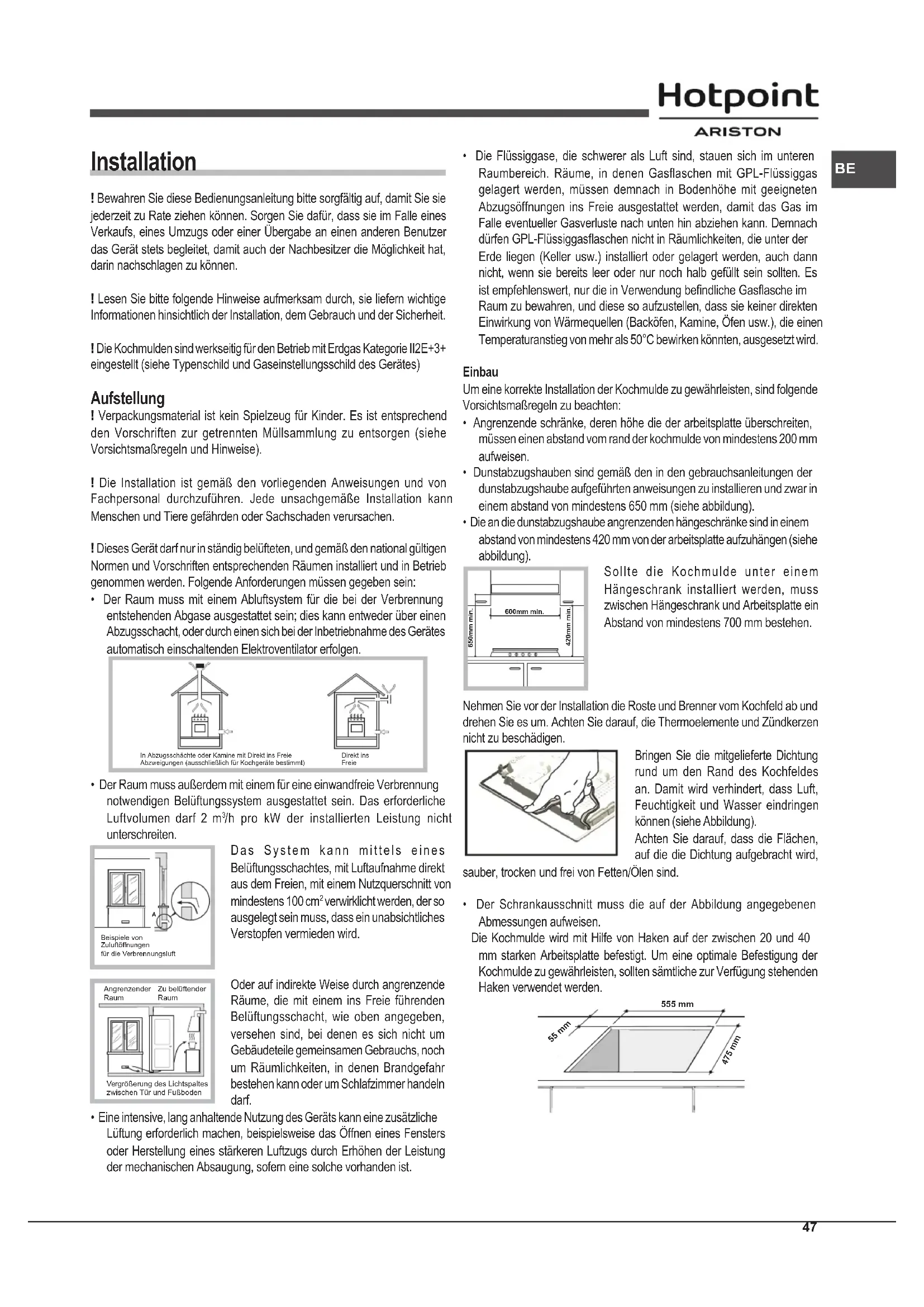 Installation ! Bewahren Sie diese Bedienungsanleitung bitte sorgfältig auf, damit Sie sie jederzeit zu Rate ziehen können. Sorgen Sie dafür, dass sie im Falle eines Verkaufs, eines Umzugs oder einer Übergabe an einen anderen Benutzer das Gerät stets begleitet, damit auch der Nachbesitzer die Möglichkeit hat, darin nachschlagen zu können. ! Lesen Sie bitte folgende Hinweise aufmerksam durch, sie liefern wichtige Informationen hinsichtlich der Installation, dem Gebrauch und der Sicherheit. ! Die Kochmulden sind werkseitig für den Betrieb mit Erdgas Kategorie II2E+3+ eingestellt (siehe Typenschild und Gaseinstellungsschild des Gerätes) Aufstellung ! Verpackungsmaterial ist kein Spielzeug für Kinder. Es ist entsprechend den Vorschriften zur getrennten Müllsammlung zu entsorgen (siehe Vorsichtsmaßregeln und Hinweise). ! Die Installation ist gemäß den vorliegenden Anweisungen und von Fachpersonal durchzuführen. Jede unsachgemäße Installation kann Menschen und Tiere gefährden oder Sachschaden verursachen. ! Dieses Gerät darf nur in ständig belüfteten, und gemäß den national gültigen Normen und Vorschriften entsprechenden Räumen installiert und in Betrieb genommen werden. Folgende Anforderungen müssen gegeben sein: