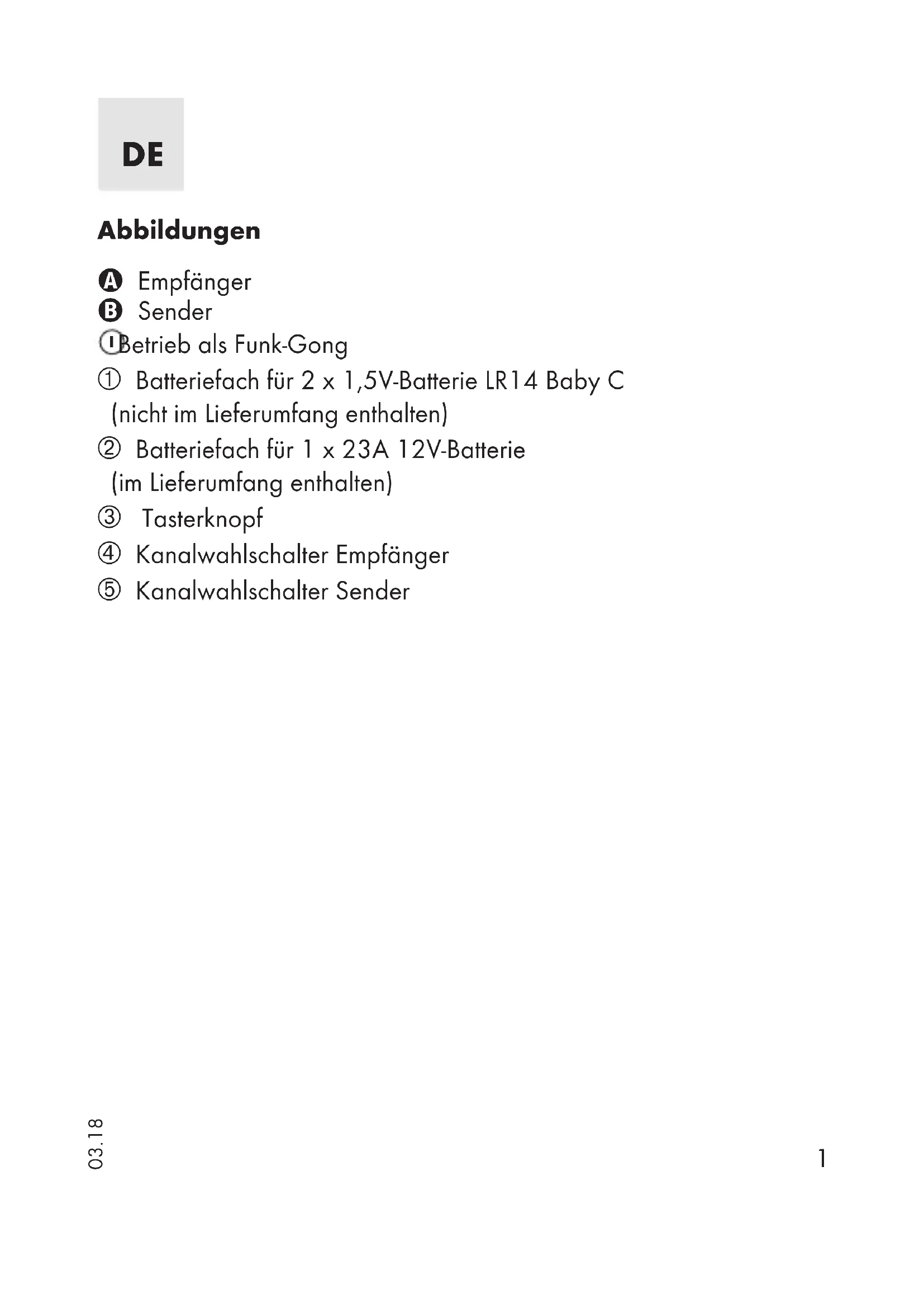 Abbildungen Empfänger Sender Betrieb als Funk-Gong Batteriefach für 2 x 1,5V-Batterie LR14 Baby C (nicht im Lieferumfang enthalten) Batteriefach für 1 x 23A 12V-Batterie (im Lieferumfang enthalten) Tasterknopf Kanalwahlschalter Empfänger Kanalwahlschalter Sender