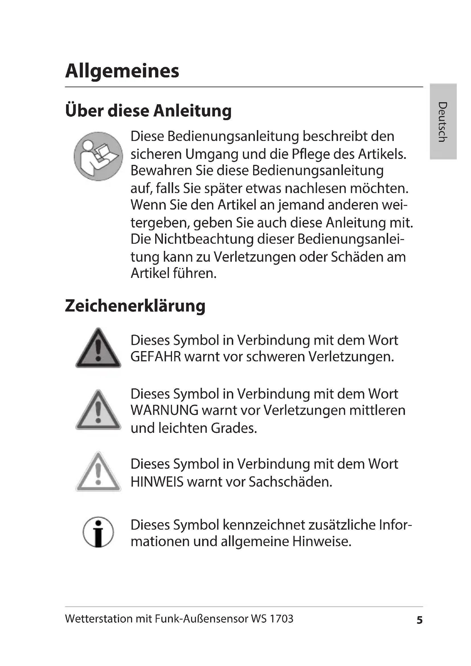 - Entsorgen FW Station.indb 4 26.04.2017 10:02:425 Wetterstation mit Funk-Außensensor WS 1703 Deutsch Allgemeines Über diese Anleitung Diese Bedienungsanleitung beschreibt den sicheren Umgang und die Pflege des Artikels. Bewahren Sie diese Bedienungsanleitung auf, falls Sie später etwas nachlesen möchten. Wenn Sie den Artikel an jemand anderen wei- tergeben, geben Sie auch diese Anleitung mit. Die Nichtbeachtung dieser Bedienungsanlei- tung kann zu Verletzungen oder Schäden am Artikel führen. Zeichenerklärung Dieses Symbol in Verbindung mit dem Wort GEFAHR warnt vor schweren Verletzungen. Dieses Symbol in Verbindung mit dem Wort WARNUNG warnt vor Verletzungen mittleren und leichten Grades. Dieses Symbol in Verbindung mit dem Wort HINWEIS warnt vor Sachschäden. Dieses Symbol kennzeichnet zusätzliche Infor- mationen und allgemeine Hinweise. FW Station.indb 5 26.04.2017 10:02:436 Wetterstation mit Funk-Außensensor WS 1703 Bestimmungsgemäßer Gebrauch Die Wetterstation - bestehend aus Basisstation und Funk-Außensensor - zeigt unterschiedliche Wetter- daten (Luftdruck, Temperatur etc.) aus der näheren Umgebung an. Aus den gemessenen Wetterdaten ermittelt die Wetterstation eine Wettervorhersage. Die Wetterstation zeigt außerdem Datum, Uhrzeit und Mondphasen an und verfügt zusätzlich über eine Weckfunktion. Für die gewerbliche Nutzung in der Wettervorhersage oder in der Wetterdaten-Messung ist die Wetterstation ungeeignet. Sicherheit Dieses Gerät kann von Kindern ab 8 Jah- ren und darüber sowie von Personen mit verringerten physischen, sensorischen oder mentalen Fähigkeiten oder Mangel an Erfahrung und/oder Wissen benutzt werden, wenn sie beaufsichtigt werden oder bezüglich des sicheren Gebrauchs des Gerätes unterwiesen wurden und die daraus resultierenden Gefahren verstanden haben. Das Gerät und der Netzadapter sind von Kindern jünger als 8 Jahren fernzuhalten. FW Station.indb 6 26.04.2017 10:02:437 Wetterstation mit Funk-Außensensor WS 1703 Deutsch Reinigung und Wartung durch den Benut- zer dürfen nicht durch Kinder vorgenom- men werden, es sei denn, sie sind 8 Jahre oder älter und werden beaufsichtigt. Kinder müssen beaufsichtigt werden, um sicherzustellen, dass sie nicht mit dem Gerät spielen. Funkwetterstation und Netzadapter dürfen nicht in Wasser oder andere Flüssigkeiten getaucht werden. Stromschlaggefahr! Benutzen Sie die Basisstation der Funkwet- terstation daher auch nicht in der Nähe von Feuchtquellen wie z. B. einem Waschbe- cken. Verwenden Sie nur den mitgelieferten Netzadapter und ersetzen Sie ihn nur durch den gleichen Typ. Der Netzadapter darf nur in trockenen Innenräumen verwendet wer- den und muss vor Feuchtigkeit geschützt werden. Gefahr für Kinder Batterien können bei Verschlucken lebensgefährlich sein. Bewahren Sie Wetterstation, Funksensor und Bat- terien deshalb für Kleinkinder unerreichbar auf. Wurde eine Batterie verschluckt, muss sofort medizinische Hilfe in Anspruch genommen werden. FW Station.indb 7 26.04.2017 10:02:438 Wetterstation mit Funk-Außensensor WS 1703 Halten Sie Kinder von Verpackungsmaterial und den zum Lieferumfang gehörenden Kleinteilen fern. Bei Verschlucken besteht Erstickungsgefahr. Gefahr durch Elektrizität (bei Verwendung des Netzadapters) Schließen Sie das Gerät an eine ordnungsgemäß ins- tallierte Steckdose an, deren Spannung den „Techni- schen Daten“ entspricht. Achten Sie darauf, dass die Steckdose gut zugänglich ist, damit Sie im Bedarfsfall schnell den Netzadapter ziehen können. Benutzen Sie die Funkwetterstation nicht, wenn Netzadapter oder Netzadapterkabel beschädigt sind. Decken Sie den Netzadapter nicht durch Vorhänge, Zeitungen etc. ab und sorgen Sie für ausreichende Belüftung. Der Netzadapter kann heiß werden. Wickeln Sie das Netzadapterkabel vor dem Anschluss vollständig ab. Achten Sie dabei darauf, dass das Kabel nicht durch scharfe Kanten oder heiße Gegenstände beschädigt wird. Ziehen Sie den Netzadapter aus der Steckdose: − bevor Sie die Funkwetterstation reinigen, − wenn während des Betriebs oensichtlich eine Störung auftritt, bei Gewitter. − Ziehen Sie dabei immer am Netzstecker, nicht am Kabel. FW Station.indb 8 26.04.2017 10:02:439 Wetterstation mit Funk-Außensensor WS 1703 Deutsch Nehmen Sie keine Veränderungen am Artikel oder am Anschlusskabel vor. Lassen Sie Reparaturen nur von einer Fachwerkstatt durchführen, da nicht fachgerecht reparierte Geräte eine Gefährdung für den Benutzer darstellen. Ersetzen Sie nicht das Netzadapterkabel. Bei Beschä- digung des Kabels oder des Netzadapters muss dieser verschrottet und durch einen Netzadapter des glei- chen Typs ersetzt werden. Gefahr von Verletzungen Achtung: Explosionsgefahr bei unsachgemäßem Umgang mit Batterien. Batterien dürfen nicht gela- den, mit anderen Mitteln reaktiviert, auseinander genommen, ins Feuer geworfen oder kurzgeschlossen werden. Vermeiden Sie den Kontakt der Batterieüssigkeit mit Haut, Augen und Schleimhäuten. Bei Kontakt müssen Sie die betroenen Stellen sofort mit reichlich klarem Wasser spülen und umgehend einen Arzt aufsuchen. Hinweis von Sachschäden Schützen Sie Basisstation und Außensensor vor Staub, Stößen, extremen Temperaturen und direkter Sonneneinstrahlung. Schützen Sie die Basisstation vor Feuchtigkeit. Stellen Sie die Basisstation ausschließlich in einem trockenen, geschlossenen Raum auf. FW Station.indb 9 26.04.2017 10:02:4310 Wetterstation mit Funk-Außensensor WS 1703 Der Funksensor ist gegen Feuchtigkeit geschützt, muss aber vor direkter Nässeeinwirkung, z. B. Regen, geschützt werden. Nehmen Sie die Batterien aus Basisstation und Außensensor heraus, wenn diese verbraucht sind oder wenn Sie die Wetterstation länger nicht benutzen. So vermeiden Sie Schäden, die durch Auslaufen entste- hen können. Setzen Sie Batterien keinen extremen Bedingungen aus, indem Sie diese z. B. auf Heizkörpern oder unter direkter Sonneneinstrahlung lagern. Erhöhte Auslauf-