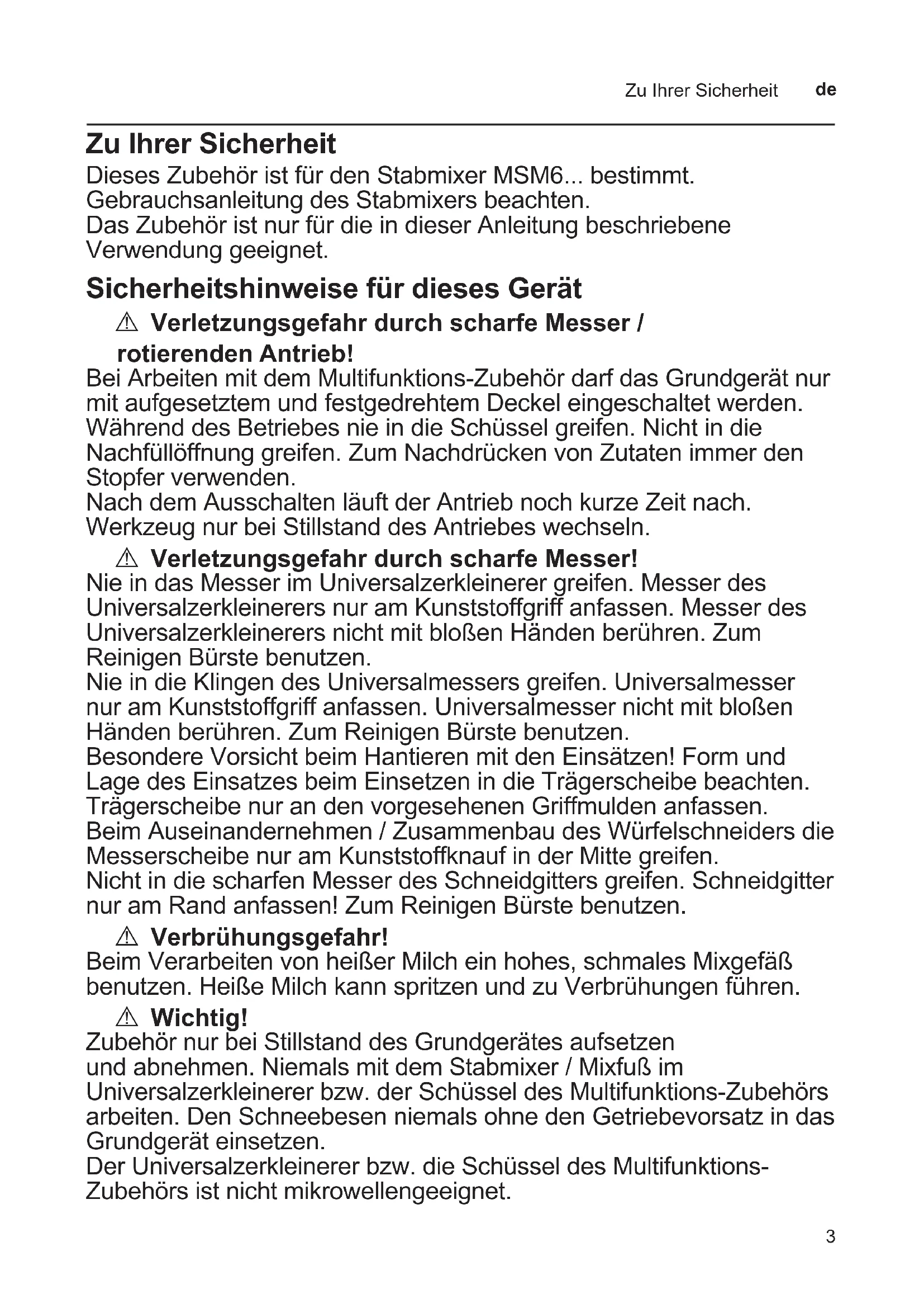 Zu Ihrer Sicherheit Dieses Zubehör ist für den Stabmixer MSM6... bestimmt. Gebrauchsanleitung des Stabmixers beachten. Das Zubehör ist nur für die in dieser Anleitung beschriebene Verwendung geeignet. Sicherheitshinweise für dieses Gerät A Verletzungsgefahr durch scharfe Messer / rotierenden Antrieb! Bei Arbeiten mit dem Multifunktions-Zubehör darf das Grundgerät nur mit aufgesetztem und festgedrehtem Deckel eingeschaltet werden. Während des Betriebes nie in die Schüssel greifen. Nicht in die Nachfüllöffnung greifen. Zum Nachdrücken von Zutaten immer den Stopfer verwenden. Nach dem Ausschalten läuft der Antrieb noch kurze Zeit nach. Werkzeug nur bei Stillstand des Antriebes wechseln. A Verletzungsgefahr durch scharfe Messer! Nie in das Messer im Universalzerkleinerer greifen. Messer des Universalzerkleinerers nur am Kunststoffgriff anfassen. Messer des Universalzerkleinerers nicht mit bloßen Händen berühren. Zum Reinigen Bürste benutzen. Nie in die Klingen des Universalmessers greifen. Universalmesser nur am Kunststoffgriff anfassen. Universalmesser nicht mit bloßen Händen berühren. Zum Reinigen Bürste benutzen. Besondere Vorsicht beim Hantieren mit den Einsätzen! Form und Lage des Einsatzes beim Einsetzen in die Trägerscheibe beachten. Trägerscheibe nur an den vorgesehenen Griffmulden anfassen. Beim Auseinandernehmen / Zusammenbau des Würfelschneiders die Messerscheibe nur am Kunststoffknauf in der Mitte greifen. Nicht in die scharfen Messer des Schneidgitters greifen. Schneidgitter nur am Rand anfassen! Zum Reinigen Bürste benutzen. A Verbrühungsgefahr! Beim Verarbeiten von heißer Milch ein hohes, schmales Mixgefäß benutzen. Heiße Milch kann spritzen und zu Verbrühungen führen. A Wichtig! Zubehör nur bei Stillstand des Grundgerätes aufsetzen und abnehmen. Niemals mit dem Stabmixer / Mixfuß im Universalzerkleinerer bzw. der Schüssel des Multifunktions-Zubehörs arbeiten. Den Schneebesen niemals ohne den Getriebevorsatz in das Grundgerät einsetzen. Der Universalzerkleinerer bzw. die Schüssel des Multifunktions- Zubehörs ist nicht mikrowellengeeignet.4 Universalzerkleinerer