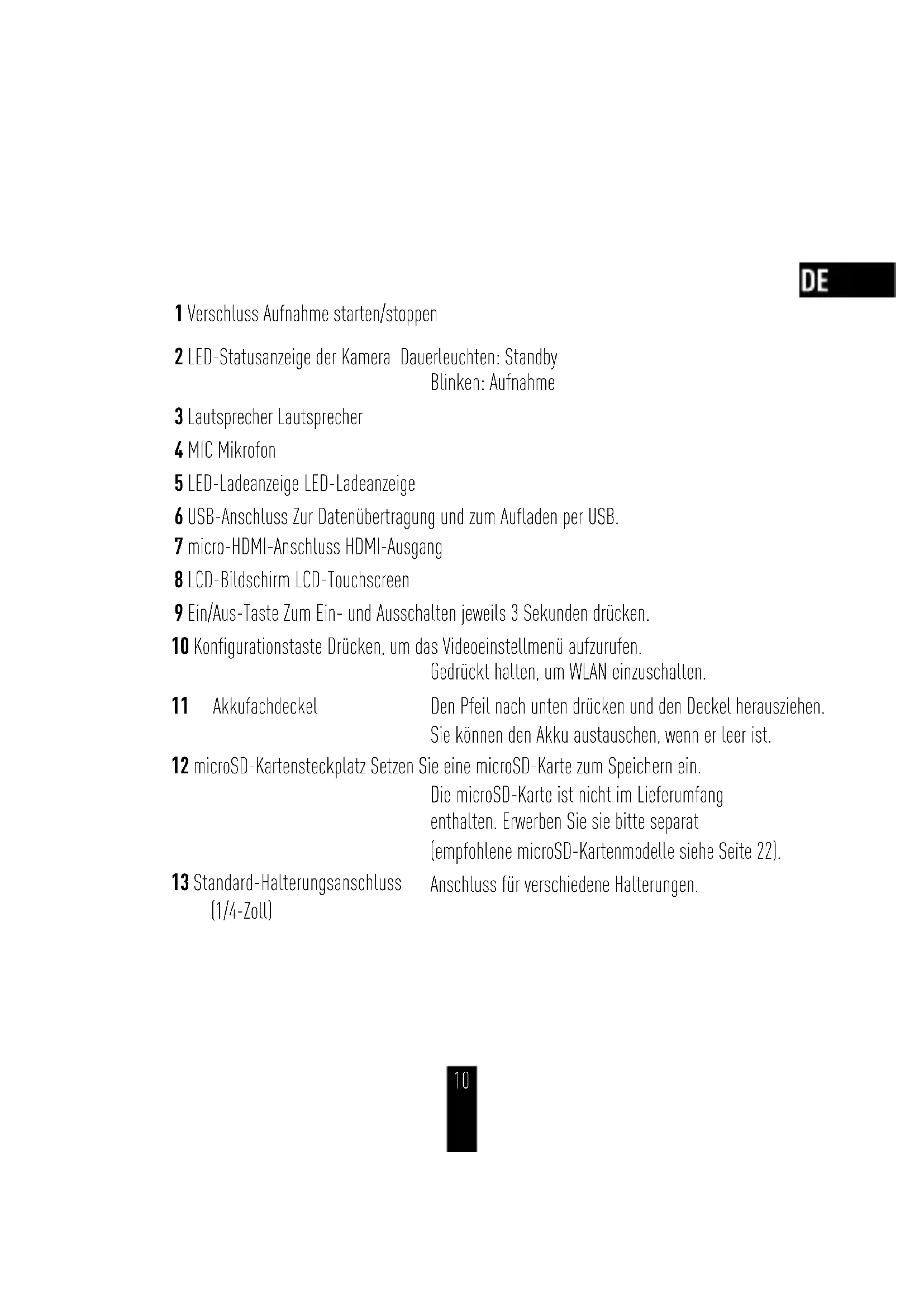 91 Verschluss Aufnahme starten/stoppen 2 LED-Statusanzeige der Kamera Dauerleuchten: Standby Blinken: Aufnahme 3 Lautsprecher Lautsprecher 4 MIC Mikrofon 5 LED-Ladeanzeige LED-Ladeanzeige 6 USB-Anschluss Zur Datenübertragung und zum Aufladen per USB. 7 micro-HDMI-Anschluss HDMI-Ausgang 8 LCD-Bildschirm LCD-Touchscreen 9 Ein/Aus-Taste Zum Ein- und Ausschalten jeweils 3 Sekunden drücken. 10 Konfigurationstaste Drücken, um das Videoeinstellmenü aufzurufen. Gedrückt halten, um WLAN einzuschalten. 11 Akkufachdeckel Den Pfeil nach unten drücken und den Deckel herausziehen. Sie können den Akku austauschen, wenn er leer ist. 12 microSD-Kartensteckplatz Setzen Sie eine microSD-Karte zum Speichern ein. Die microSD-Karte ist nicht im Lieferumfang enthalten. Erwerben Sie sie bitte separat (empfohlene microSD-Kartenmodelle siehe Seite 22). 13 Standard-Halterungsanschluss (1/4-Zoll) Anschluss für verschiedene Halterungen. 10Bedienung Schritt 1 Kamera aus dem Gehäuse nehmen. Wenn Sie die Kamera zum ersten Mal verwenden, nehmen Sie die Kamera aus dem Gehäuse, um die microSD-Karte einzulegen und den Akku aufzuladen. Setzen Sie die microSD-Karte in den microSD-Kartensteckplatz ein. 11Schritt 2 Laden Sie die Kamera auf.
