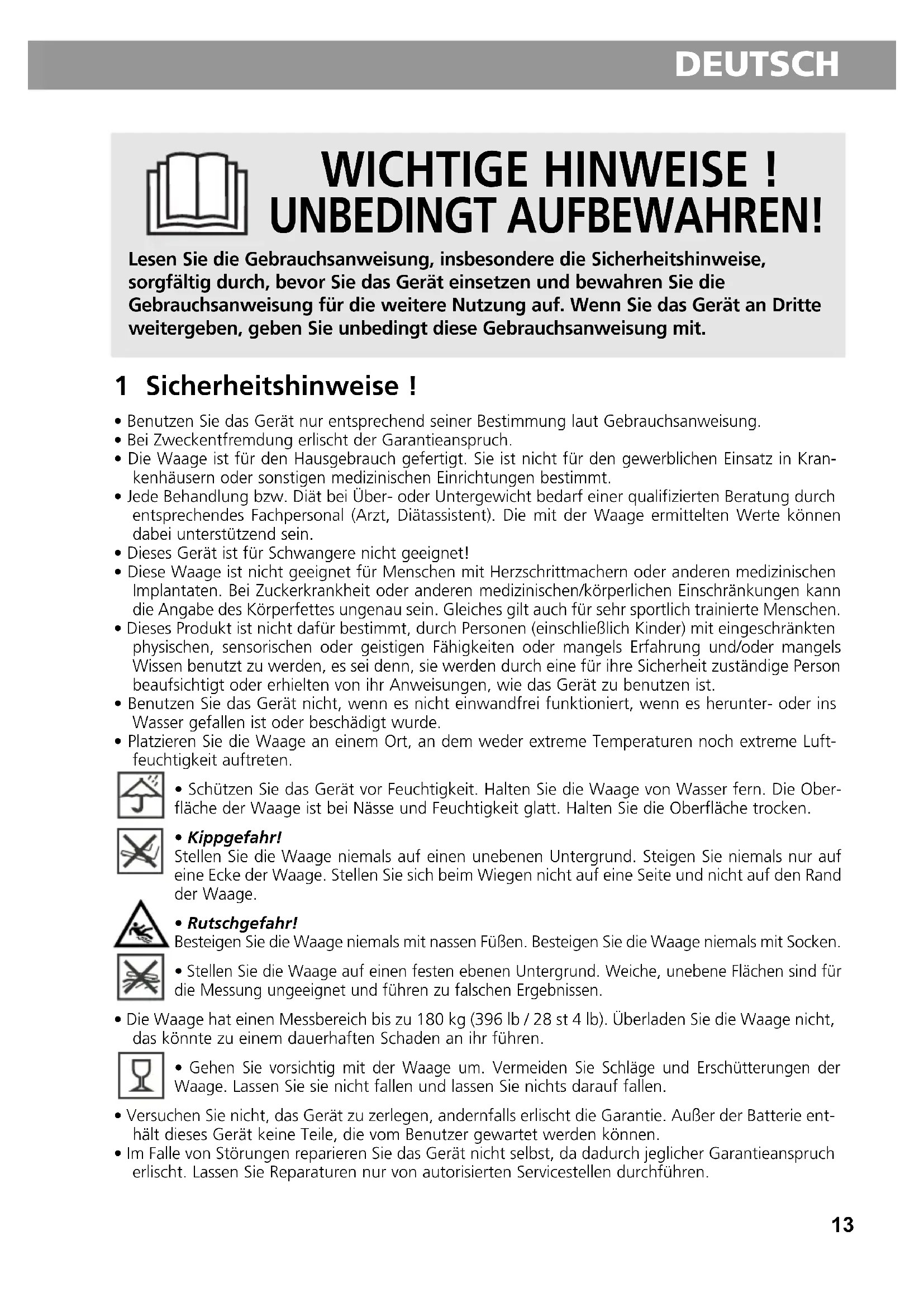 DEUTSCH WICHTIGE HINWEISE ! UNBEDINGT AUFBEWAHREN! Lesen Sie die Gebrauchsanweisung, insbesondere die Sicherheitshinweise, sorgfältig durch, bevor Sie das Gerät einsetzen und bewahren Sie die Gebrauchsanweisung für die weitere Nutzung auf. Wenn Sie das Gerät an Dritte weitergeben, geben Sie unbedingt diese Gebrauchsanweisung mit. 1 Sicherheitshinweise !