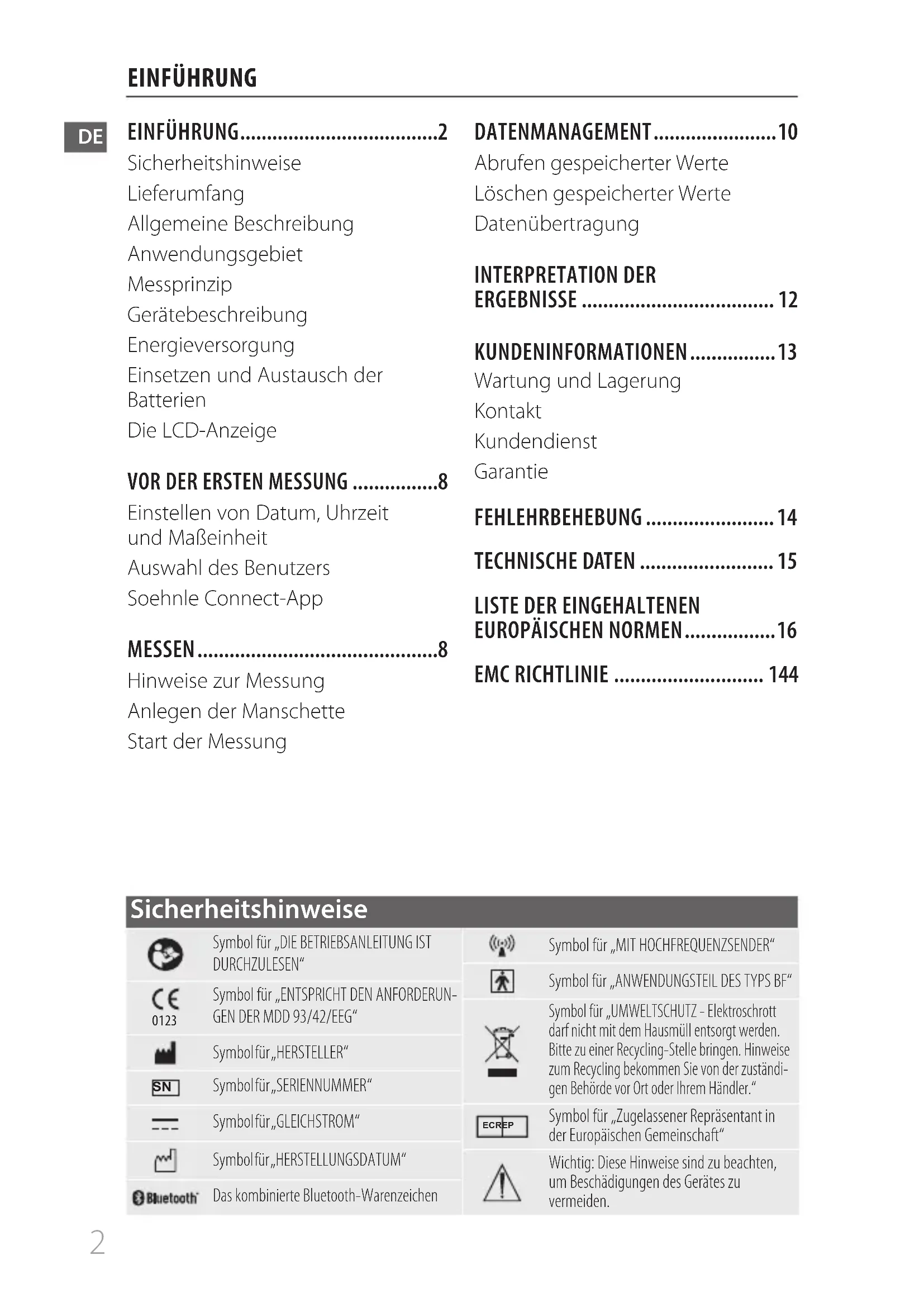 EMC RICHTLINIE ............................ 144 Symbol für „DIE BETRIEBSANLEITUNG IST DURCHZULESEN“0123Symbol für „ENTSPRICHT DEN ANFORDERUN-GEN DER MDD 93/42/EEG“Symbol für „HERSTELLER“ Symbol für „SERIENNUMMER“Symbol für „GLEICHSTROM“Symbol für „HERSTELLUNGSDATUM“Das kombinierte Bluetooth-WarenzeichenSymbol für „MIT HOCHFREQUENZSENDER“Symbol für „ANWENDUNGSTEIL DES TYPS BF“Symbol für „UMWELTSCHUTZ - Elektroschrott darf nicht mit dem Hausmüll entsorgt werden. Bitte zu einer Recycling-Stelle bringen. Hinweise zum Recycling bekommen Sie von der zuständi-gen Behörde vor Ort oder Ihrem Händler.“EC REPSymbol für „Zugelassener Repräsentant in der Europäischen Gemeinschaft“Wichtig: Diese Hinweise sind zu beachten, um Beschädigungen des Gerätes zu vermeiden. SicherheitshinweiseDE EINFÜHRUNG