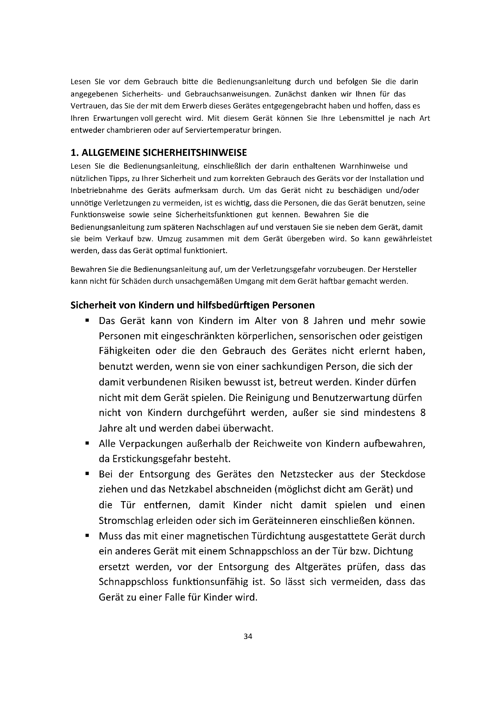 Lesen Sie die Bedienungsanleitung, einschließlich der darin enthaltenen Warnhinweise und nützlichen Tipps, zu Ihrer Sicherheit und zum korrekten Gebrauch des Geräts vor der Installation und Inbetriebnahme des Geräts aufmerksam durch. Um das Gerät nicht zu beschädigen und/oder unnötige Verletzungen zu vermeiden, ist es wichtig, dass die Personen, die das Gerät benutzen, seine Funktionsweise sowie seine Sicherheitsfunktionen gut kennen. Bewahren Sie die Bedienungsanleitung zum späteren Nachschlagen auf und verstauen Sie sie neben dem Gerät, damit sie beim Verkauf bzw. Umzug zusammen mit dem Gerät übergeben wird. So kann gewährleistet werden, dass das Gerät optimal funktioniert. Bewahren Sie die Bedienungsanleitung auf, um der Verletzungsgefahr vorzubeugen. Der Hersteller kann nicht für Schäden durch unsachgemäßen Umgang mit dem Gerät haftbar gemacht werden. Sicherheit von Kindern und hilfsbedürftigen Personen Das Gerät kann von Kindern im Alter von 8 Jahren und mehr sowie Personen mit eingeschränkten körperlichen, sensorischen oder geistigen Fähigkeiten oder die den Gebrauch des Gerätes nicht erlernt haben, benutzt werden, wenn sie von einer sachkundigen Person, die sich der damit verbundenen Risiken bewusst ist, betreut werden. Kinder dürfen nicht mit dem Gerät spielen. Die Reinigung und Benutzerwartung dürfen nicht von Kindern durchgeführt werden, außer sie sind mindestens 8 Jahre alt und werden dabei überwacht. Alle Verpackungen außerhalb der Reichweite von Kindern aufbewahren, da Erstickungsgefahr besteht. Bei der Entsorgung des Gerätes den Netzstecker aus der Steckdose ziehen und das Netzkabel abschneiden (möglichst dicht am Gerät) und die Tür entfernen, damit Kinder nicht damit spielen und einen Stromschlag erleiden oder sich im Geräteinneren einschließen können. Muss das mit einer magnetischen Türdichtung ausgestattete Gerät durch ein anderes Gerät mit einem Schnappschloss an der Tür bzw. Dichtung ersetzt werden, vor der Entsorgung des Altgerätes prüfen, dass das Schnappschloss funktionsunfähig ist. So lässt sich vermeiden, dass das Gerät zu einer Falle für Kinder wird.35 Das Gerät und das Netzkabel außerhalb der Reichweite von Kindern unter 8 Jahren aufbewahren. HINWEIS: Kinder zwischen 3 und 8 Jahren können das Gerät be- und entladen. Kinder sollten beaufsichtigt werden, um sicherzustellen, dass sie nicht mit dem Gerät spielen. Allgemeine Sicherheit ACHTUNG! Das Gerät ist für den Hausgebrauch und ähnliche Anwendungen bestimmt. ACHTUNG! Bewahren Sie keine entzündlichen Stoffe, wie z.B. Spraydosen, im Inneren des Gerätes auf, da sie dort auslaufen können. ACHTUNG! Ist das Netzkabel beschädigt, muss es zur Vermeidung der Stromschlaggefahr umgehend durch den Hersteller oder einen Fachhändler ausgetauscht werden. ACHTUNG! Dieses Gerät ist nur zur Installation im Freien vorgesehen, auf keinen Fall muss es eingebaut oder einbaufähig installiert werden. ACHTUNG! Den Kältekreislauf auf keinen Fall beschädigen. ACHTUNG! Im Inneren des Kühlfachs keine Elektrogeräte verwenden, außer diese sind vom Hersteller zugelassen. Achtung! Brandgefahr Bei Beschädigungen des Kältekreislaufs: Offene Flammen und sonstige Zündquellen vermeiden. Den Raum, in dem sich das Gerät befindet, gut lüften. Es ist gefährlich, irgendwelche Änderungen an der Zusammensetzung des Geräts vorzunehmen. Schäden am Netzkabel können einen Kurzschluss und/oder elektrischen Schlag verursachen. Elektrosicherheit Wir können nicht für Schäden haftbar gemacht werden, die durch eine fehlerhafte Elektroinstallation verursacht werden. Das Netzkabel darf nicht verlängert werden. Kein Verlängerungskabel, keinen Adapter und keine Mehrfachsteckdose verwenden. Prüfen, dass die Wandsteckdose nicht beschädigt ist. Eine Wandsteckdose in schlechtem Zustand kann zur Überhitzung des Geräts und seiner Explosion führen. Prüfen, dass die Wandsteckdose des Geräts leicht erreichbar ist. Nicht am Netzkabel ziehen. Den Schutzkontakt auf keinen Fall entfernen. Das Netzkabel nicht anschließen, wenn die Wandsteckdose locker ist. Es besteht Stromschlag- und Brandgefahr. Das Gerät nicht benutzen, wenn die Abdeckung der Innenbeleuchtung nicht angebracht ist. Vor dem Glühbirnenwechsel den Netzstecker aus der Steckdose ziehen. Das Gerät funktioniert mit 220~240V/50Hz Einphasenwechselstrom. Das Gerät muss an eine vorschriftsmäßig geerdete Wandsteckdose angeschlossen werden.36 Ist das Netzkabel beschädigt, es nicht selbst austauschen, sondern den Kundendienst kontaktieren. Der Netzstecker muss leicht erreichbar sein, aber außerhalb der Reichweite von Kindern liegen. Bei Zweifeln wenden Sie sich bitte an Ihren Elektroinstallateur.