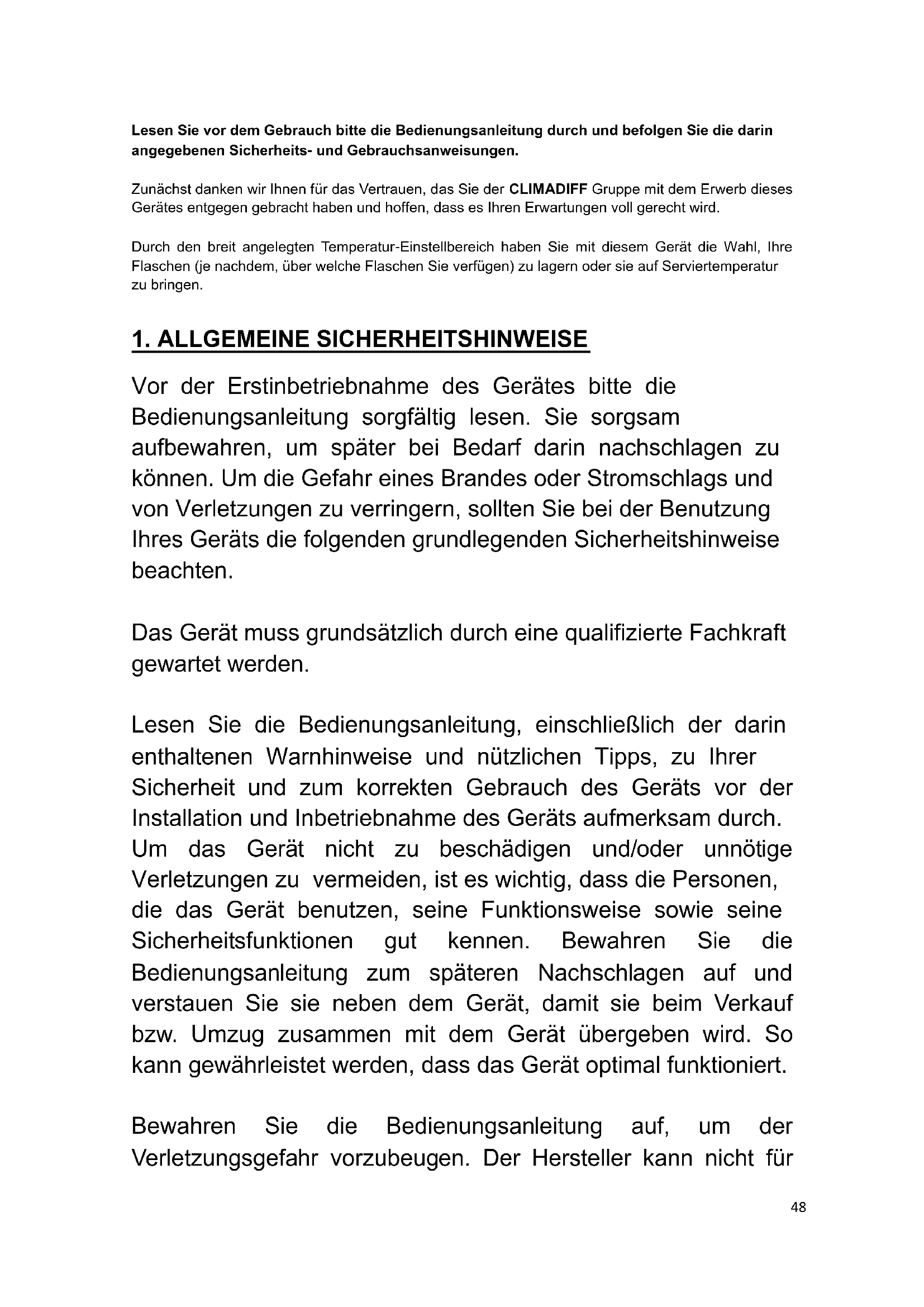 As we continuously improve our products for the benefit of our customers, we reserve the right to modify technical characteristics without notice. Warranties for CLIMADIFF brand products are offered exclusively by selected retailers. No part of these instructions may be considered as a supplementary guarantee. FRIO ENTREPRISE cannot be held liable for errors or technical or editorial omissions in this document. Non-binding document.4748 Lesen Sie vor dem Gebrauch bitte die Bedienungsanleitung durch und befolgen Sie die darin angegebenen Sicherheits- und Gebrauchsanweisungen. Zunächst danken wir Ihnen für das Vertrauen, das Sie der CLIMADIFF Gruppe mit dem Erwerb dieses Gerätes entgegen gebracht haben und hoffen, dass es Ihren Erwartungen voll gerecht wird. Durch den breit angelegten Temperatur-Einstellbereich haben Sie mit diesem Gerät die Wahl, Ihre Flaschen (je nachdem, über welche Flaschen Sie verfügen) zu lagern oder sie auf Serviertemperatur zu bringen.