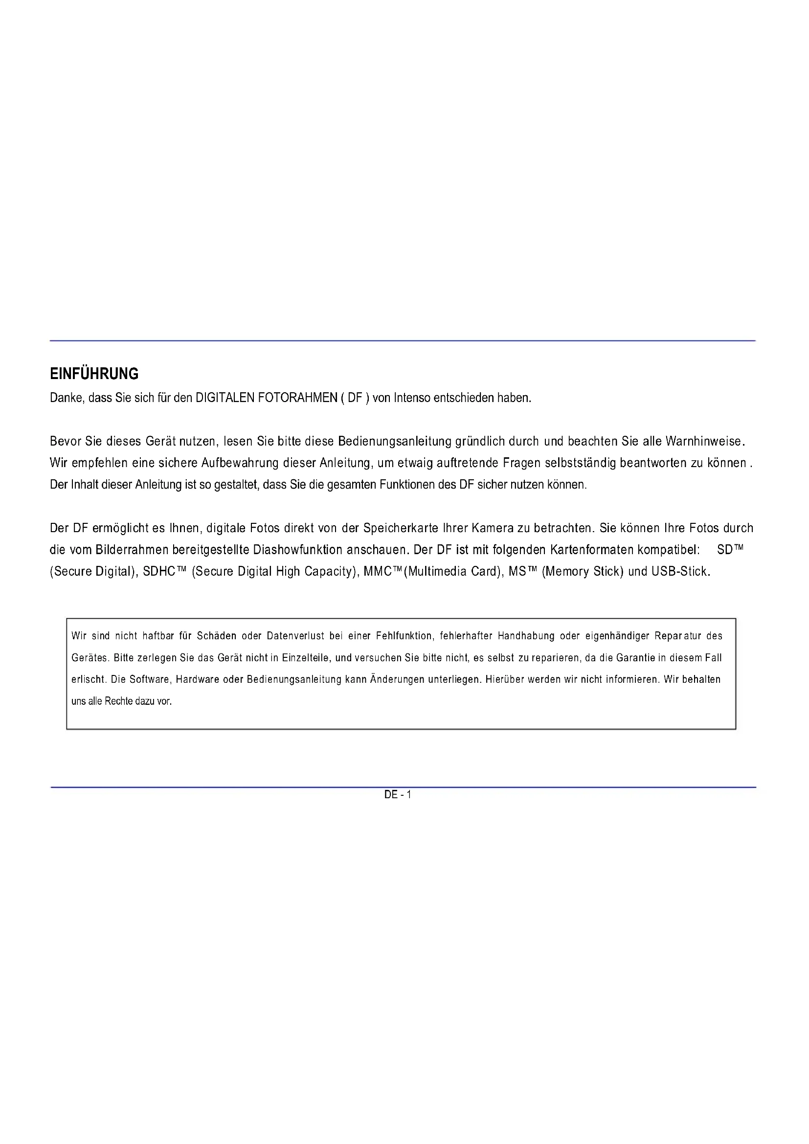 - SERVICE AND MAINTENANCE GB - 1 We are not liable for any damages or loss of data in the case of malfunction, maloperation or if you repair the device yourself. Please do not disassemble the device into individual parts and do not try to repair it yourself; in such a case guarantee will expire. Software, hardware and the operating instructions can be all subject to change. We will not inform you hereof and reserve all rights in this matter. INTRODUCTION Thank you for buying the Intenso’s DIGITAL PHOTO FRAME ( DF ). Before using this device please carefully read these operating instructions a nd observe all safety notes. Please store these instructions at a safe place to have an answer at hand whenever you have questions. These instructions have been compiled with great care to enable you to safely use all functions of the DF. The DF allows you watching digital photos directly from your camera’s memory card. You can watch your photos in a slide show mode provided by the photo frame. The DF is compatible with the following card formats: SD™ (Secure Digital), SDHC™ (Secure Digital High Capacity), MMC™ (Multimedia Card), MS™ (Memory Stick) and USB flash drive.GB - 2 p. 25
