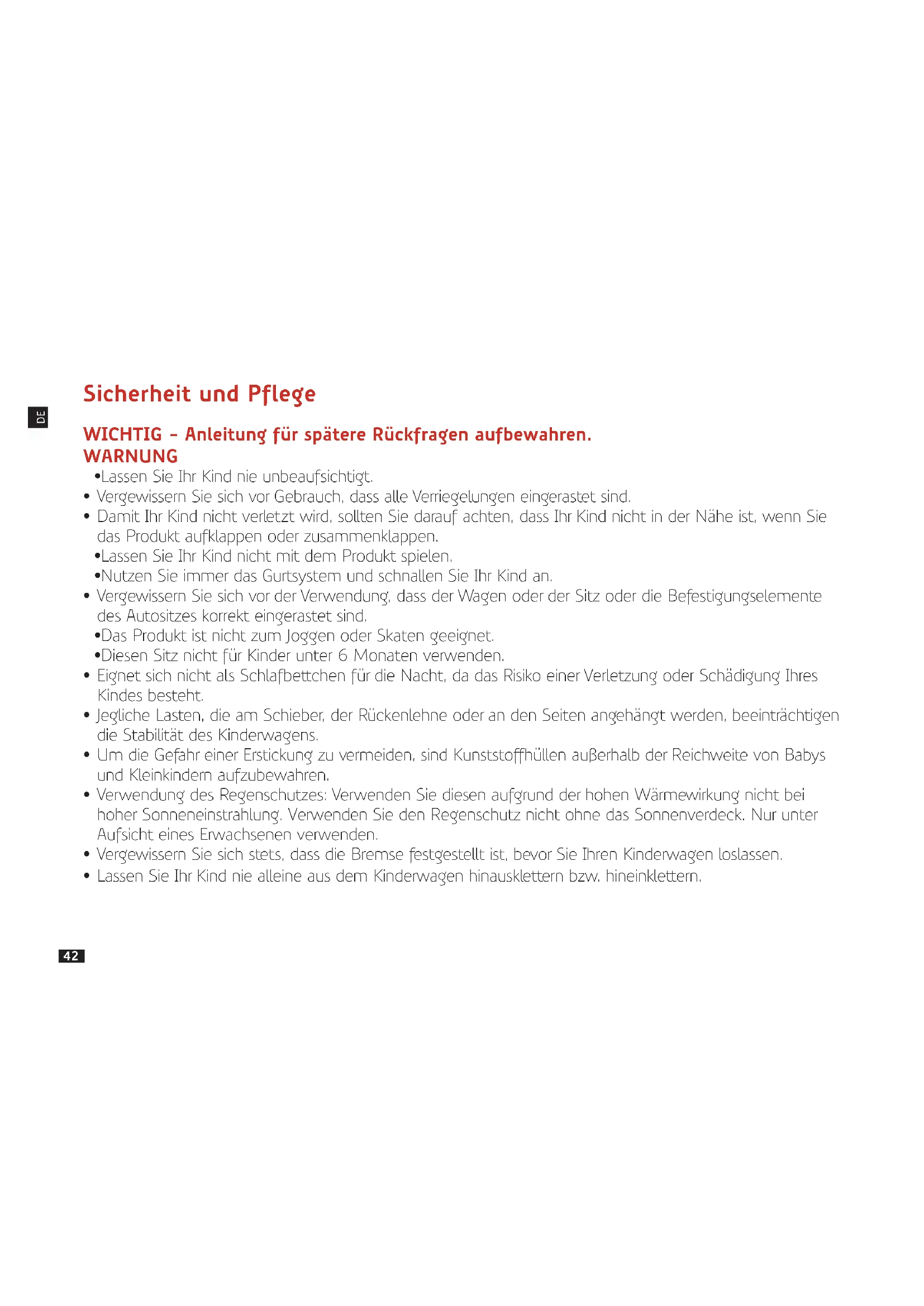 - Verwendung des Regenschutzes: Verwenden Sie diesen aufgrund der hohen Wärmewirkung nicht bei hoher Sonneneinstrahlung. Verwenden Sie den Regenschutz nicht ohne das Sonnenverdeck. Nur unter Aufsicht eines Erwachsenen verwenden.