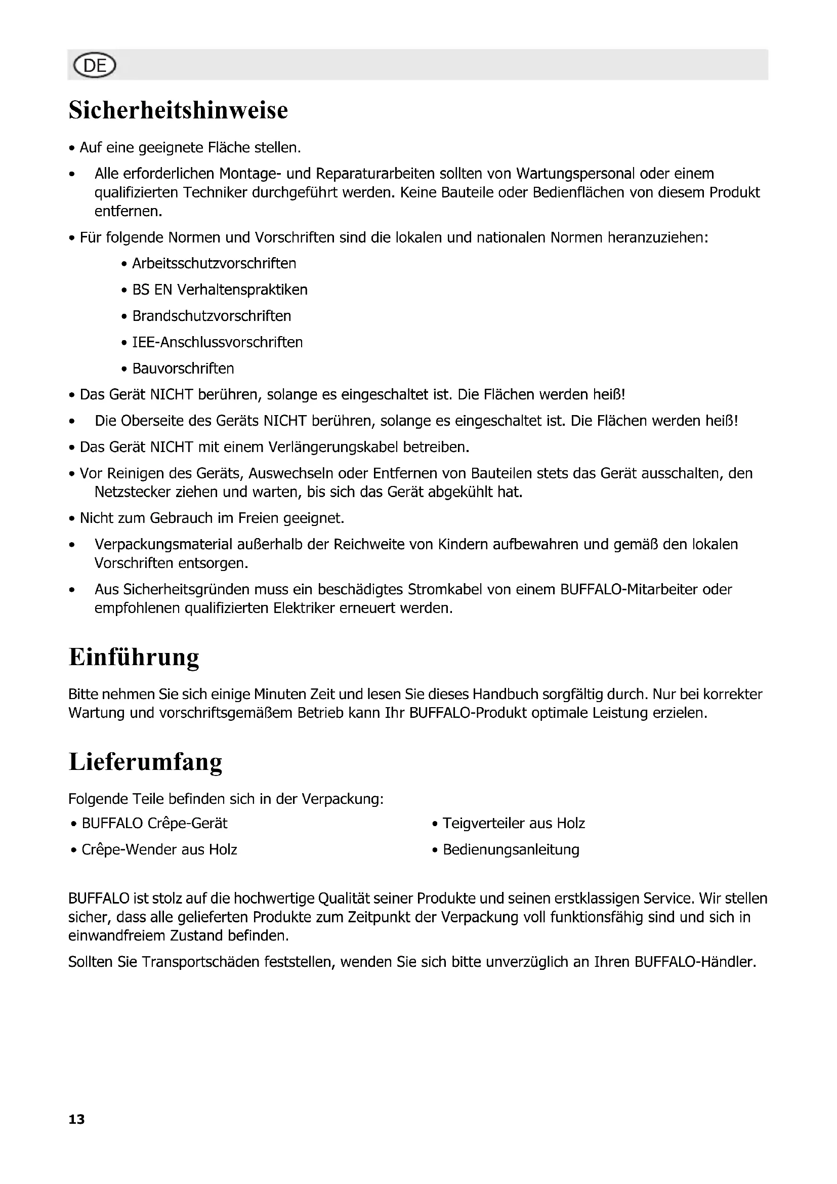 - Erdleiter (grün/gelb) an Klemme E Das Gerät muss über eine spezielle Erdleitung geerdet werden. Bei Fragen wenden Sie sich bitte an einen qualifizierten Elektriker. Störung Vermutliche Ursache Lösung Das Gerät funktioniert nicht Das Gerät ist nicht eingeschaltet Prüfen, ob der Netzstecker in die Steckdose gesteckt wurde und das Gerät eingeschaltet ist Sicherheitsabschaltung aktiviert Lassen Sie das Gerät abkühlen, bevor Sie Reset-Schalter (befindet sich auf der Unterseite des Gerätes) drücken Stecker und Kabel sind beschädigt BUFFALO-Mitarbeiter oder qualifizierten Techniker anrufen Sicherung im Stecker ist durchgebrannt Neue Sicherung in den Stecker einsetzen Stromzufuhr Netzstrom prüfen Interner Vernetzungsfehler BUFFALO-Mitarbeiter oder qualifizierten Techniker anrufen Heizelement funktioniert nicht mehr BUFFALO-Mitarbeiter oder qualifizierten Techniker anrufen Modell Spannung Leistung Strom- stärke Durchmesser der Garfläche Temperat urbereich Abmess-ungen h x b x t mm Gewicht CC039 230V 50Hz 2900W 12,6A 410mm 60-300ºC 140 X 550 X 456 17,6kg16