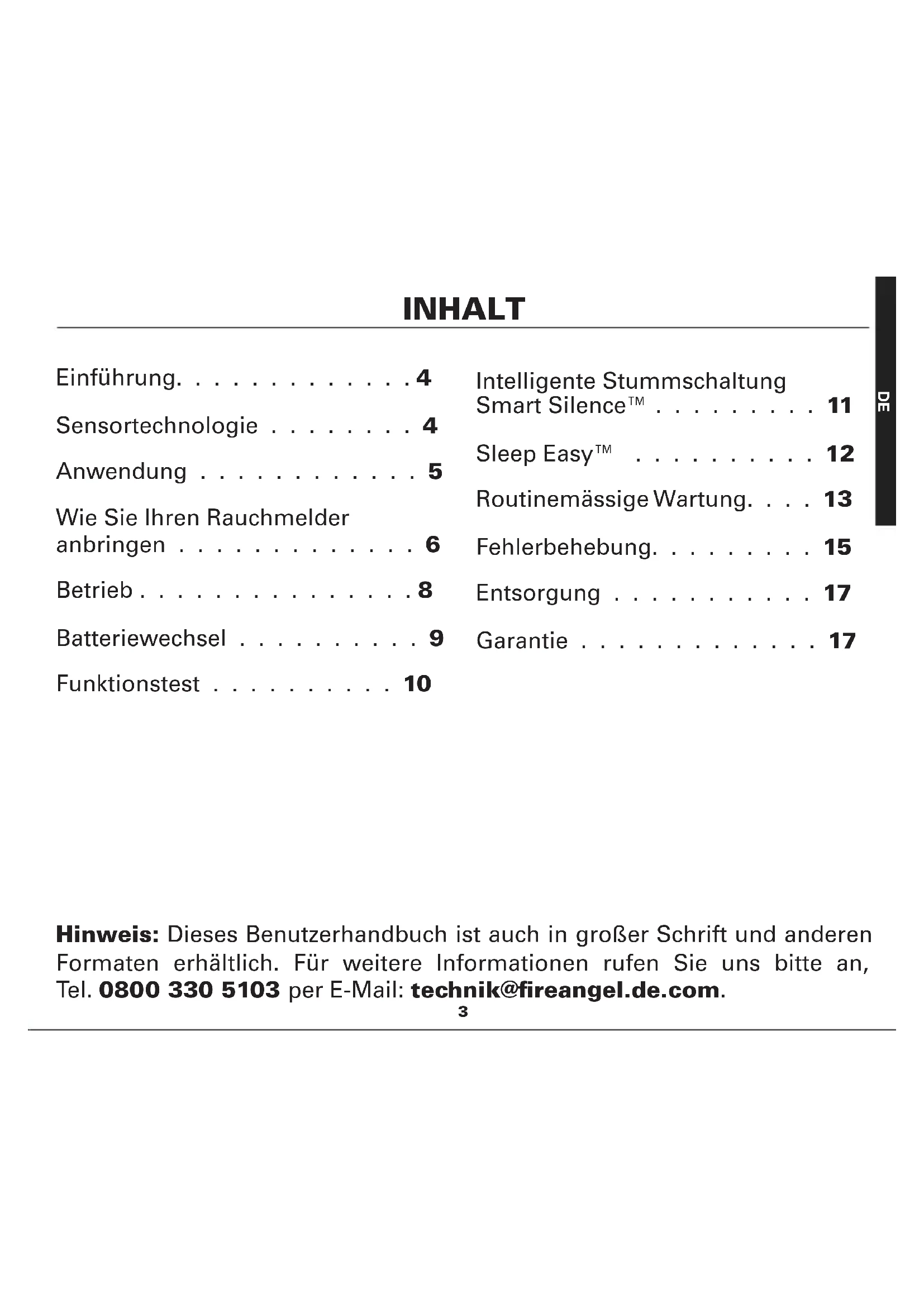 - Hinweis: Dieses Benutzerhandbuch ist auch in großer Schrift und anderen Formaten erhältlich. Für weitere Informationen rufen Sie uns bitte an, Tel. 0800 330 5103 per E-Mail: technik@fireangel.de.com. Intelligente Stummschaltung Smart Silence™ p. 11