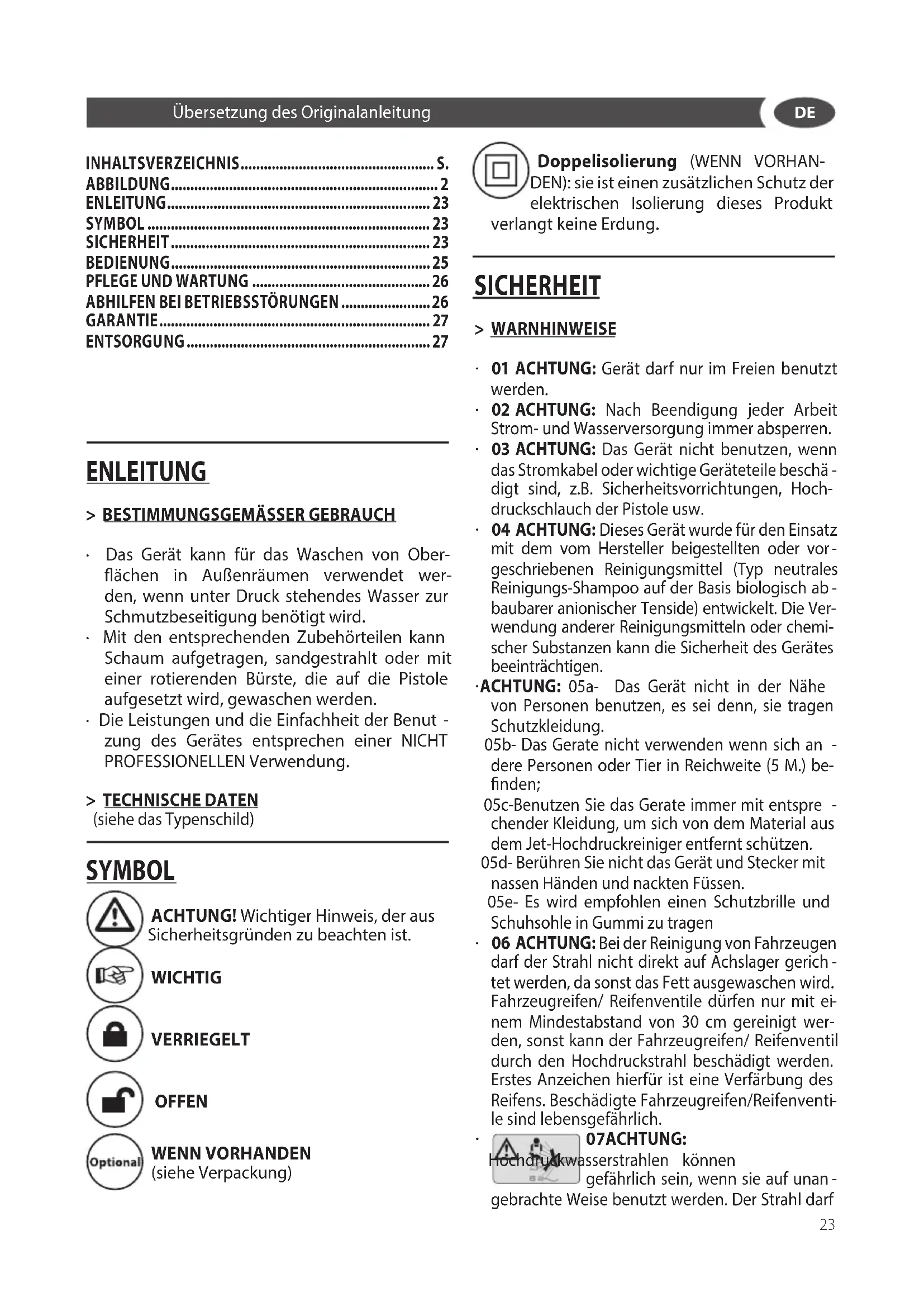23 ACHTUNG: Den Strahl nicht auf sich selbst oder andere Personen richten, um Schuhe oder Kleider zu reinigen.