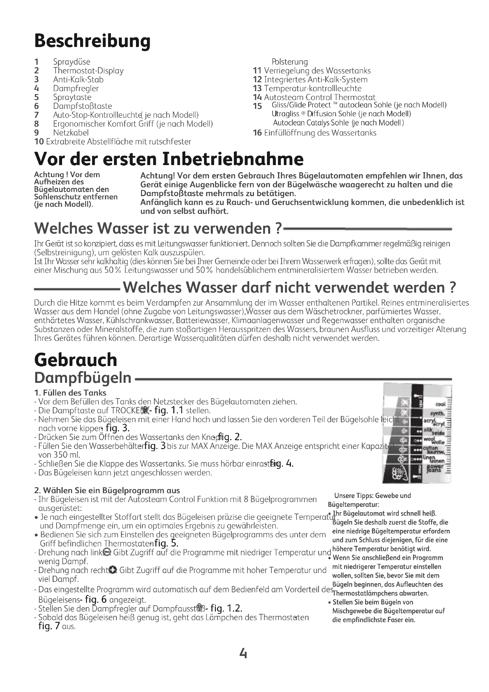 - fig. 1.1 stellen.- Nehmen Sie das Bügeleisen mit einer Hand hoch und lassen Sie den vorderen Teil der Bügelsohle leichtnach vorne kippen - fig. 3. - Drücken Sie zum Öffnen des Wassertanks den Knopf - fig. 2. - Füllen Sie den Wasserbehälter - fig. 3 bis zur MAX Anzeige. Die MAX Anzeige entspricht einer Kapazitätvon 350 ml.- Schließen Sie die Klappe des Wassertanks. Sie muss hörbar einrasten - fig. 4. - Das Bügeleisen kann jetzt angeschlossen werden.2. Wählen Sie ein Bügelprogramm aus- Ihr Bügeleisen ist mit der Autosteam Control Funktion mit 8 Bügelprogrammenausgerüstet:• Je nach eingestellter Stoffart stellt das Bügeleisen präzise die geeignete Temperaturund Dampfmenge ein, um ein optimales Ergebnis zu gewährleisten.• Bedienen Sie sich zum Einstellen des geeigneten Bügelprogramms des unter demGriff befindlichen Thermostaten - fig. 5. - Drehung nach links : Gibt Zugriff auf die Programme mit niedriger Temperatur undwenig Dampf. - Drehung nach rechts : Gibt Zugriff auf die Programme mit hoher Temperatur undviel Dampf. - Das eingestellte Programm wird automatisch auf dem Bedienfeld am Vorderteil desBügeleisens - fig. 6 angezeigt.- Stellen Sie den Dampfregler auf Dampfausstoß - fig. 1.2. - Sobald das Bügeleisen heiß genug ist, geht das Lämpchen des Thermostaten