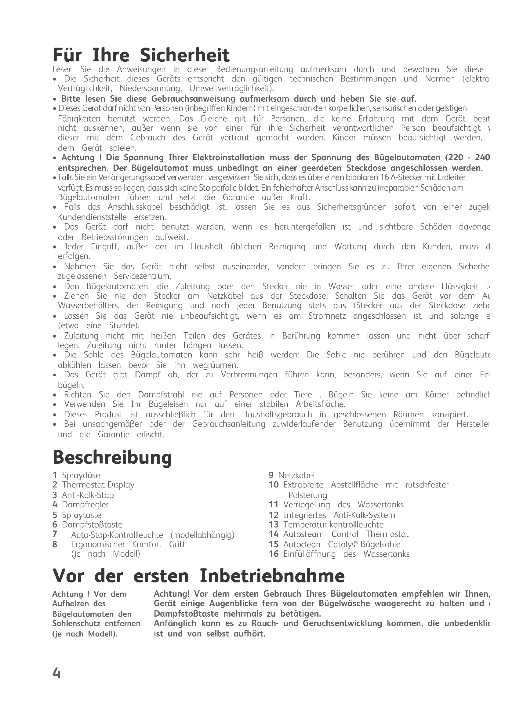 - Achtung ! Die Spannung Ihrer Elektroinstallation muss der Spannung des Bügelautomaten (220 - 240 V) entsprechen. Der Bügelautomat muss unbedingt an einer geerdeten Steckdose angeschlossen werden.