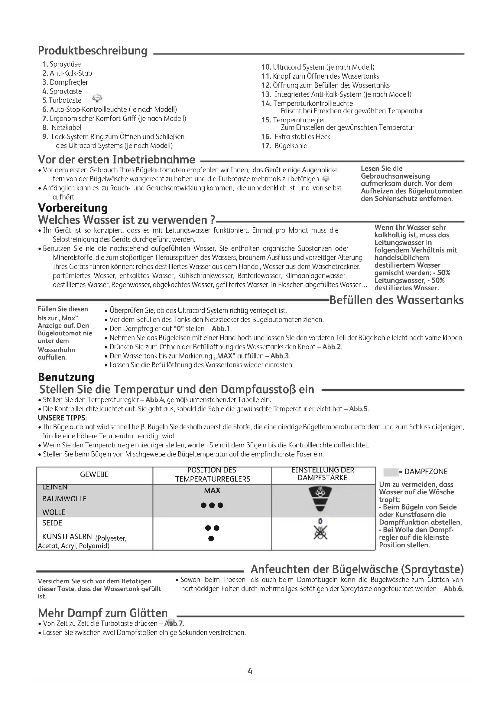 rlischt bei Erreichen der gewählten Temperatur15. TemperaturreglerZum Einstellen der gewünschten Temperatur16. Extra stabiles Heck17. BügelsohleLesen Sie dieGebrauchsanweisungaufmerksam durch. Vor demAufheizen des Bügelautomatenden Sohlenschutz entfernen. Wenn Ihr Wasser sehrkalkhaltig ist, muss dasLeitungswasser infolgendem Verhältnis mithandelsüblichemdestilliertem Wassergemischt werden: - 50%Leitungswasser, - 50%destilliertes Wasser.Füllen Sie diesenbis zur „Max”Anzeige auf. DenBügelautomat nieunter demWasserhahnauffüllen. GEWEBE POSITION DES TEMPERATURREGLERS EINSTELLUNG DER DAMPFSTÄRKE LEINEN BAUMWOLLE WOLLE SEIDE KUNSTFASERN (Polyester, Acetat, Acryl, Polyamid) MAX
