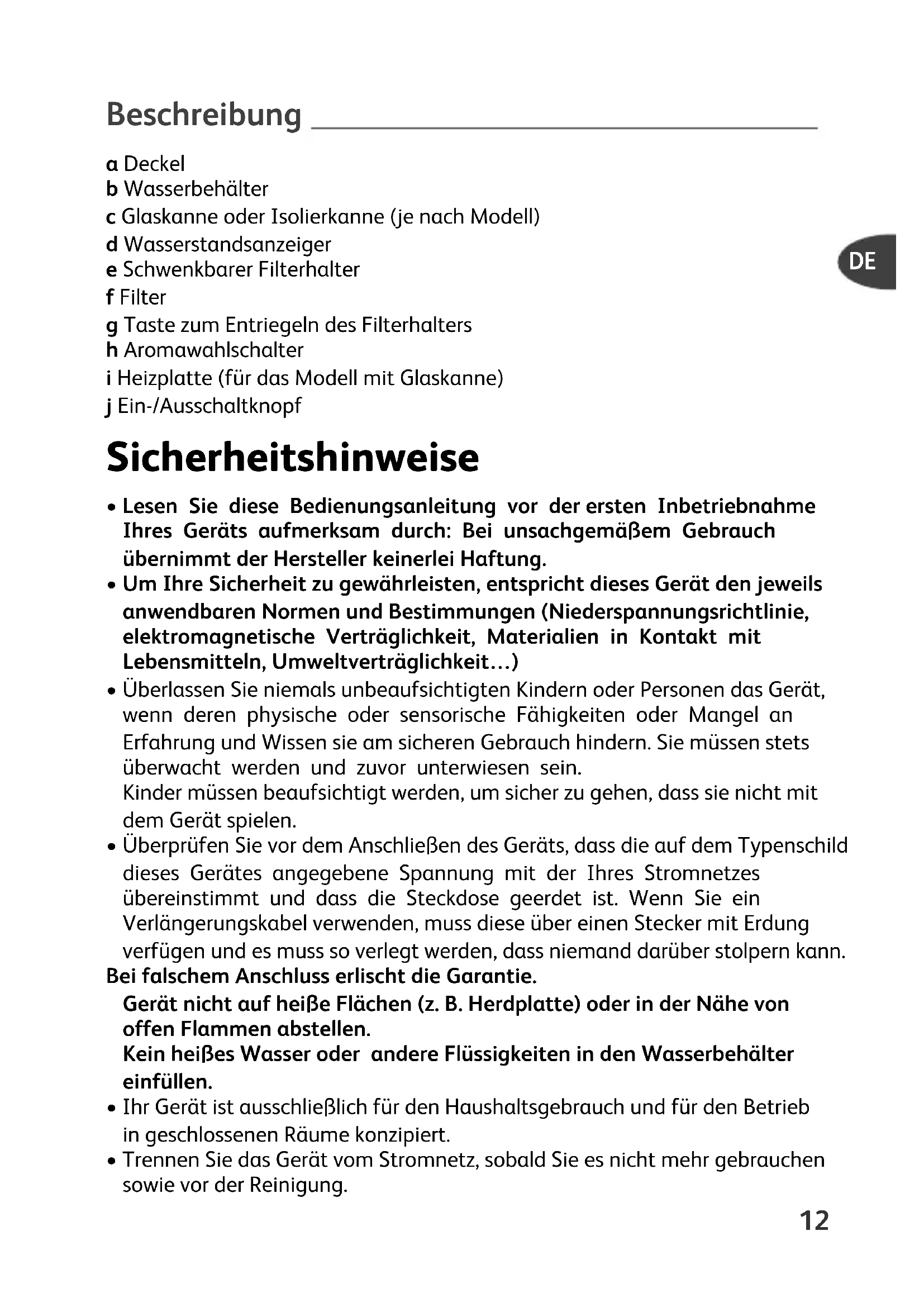 SM_COFFEE-MAKER-EXPRESS_Mise en page 1 20/05/11 14:43 Page11Beschreibung a Deckel b Wasserbehälter c Glaskanne oder Isolierkanne (je nach Modell) d Wasserstandsanzeiger e Schwenkbarer Filterhalter f Filter g Taste zum Entriegeln des Filterhalters h Aromawahlschalter i Heizplatte (für das Modell mit Glaskanne) j Ein-/Ausschaltknopf Sicherheitshinweise