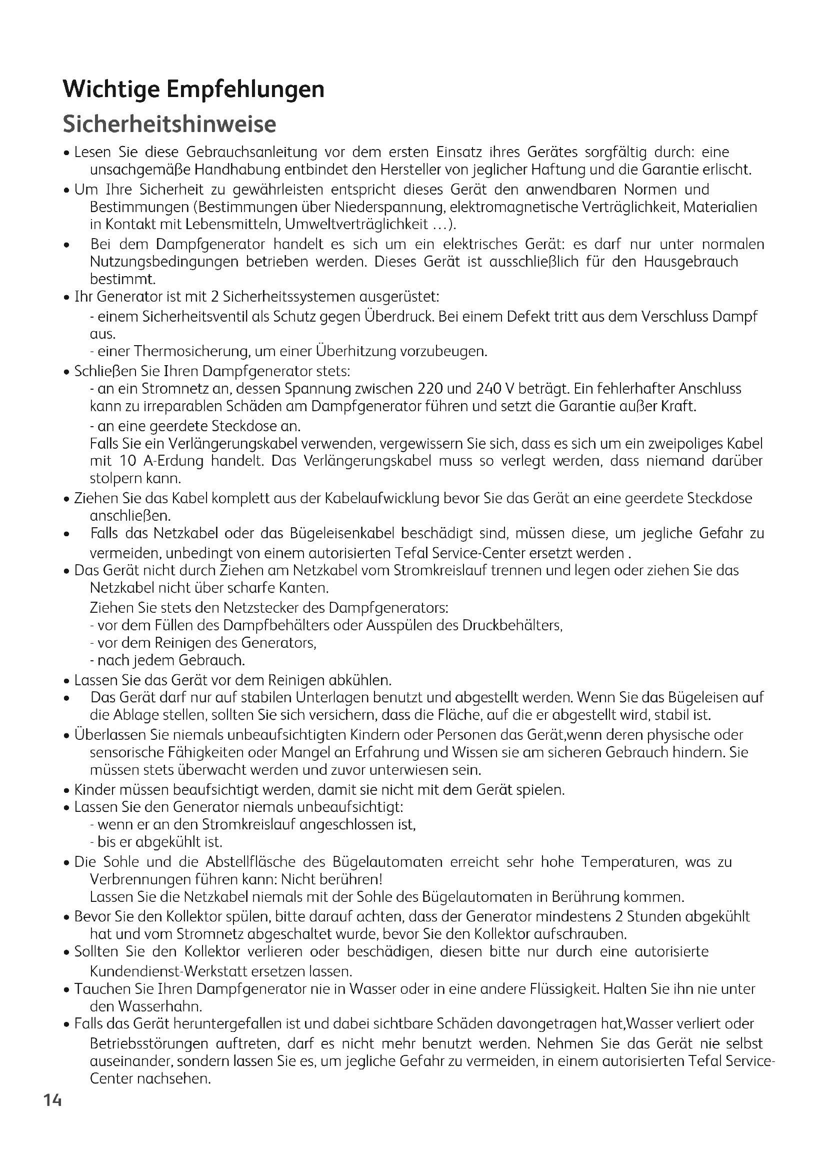 - Bei dem Dampfgenerator handelt es sich um ein elektrisches Gerät: es darf nur unter normalen Nutzungsbedingungen betrieben werden. Dieses Gerät ist ausschließlich für den Hausgebrauch bestimmt.