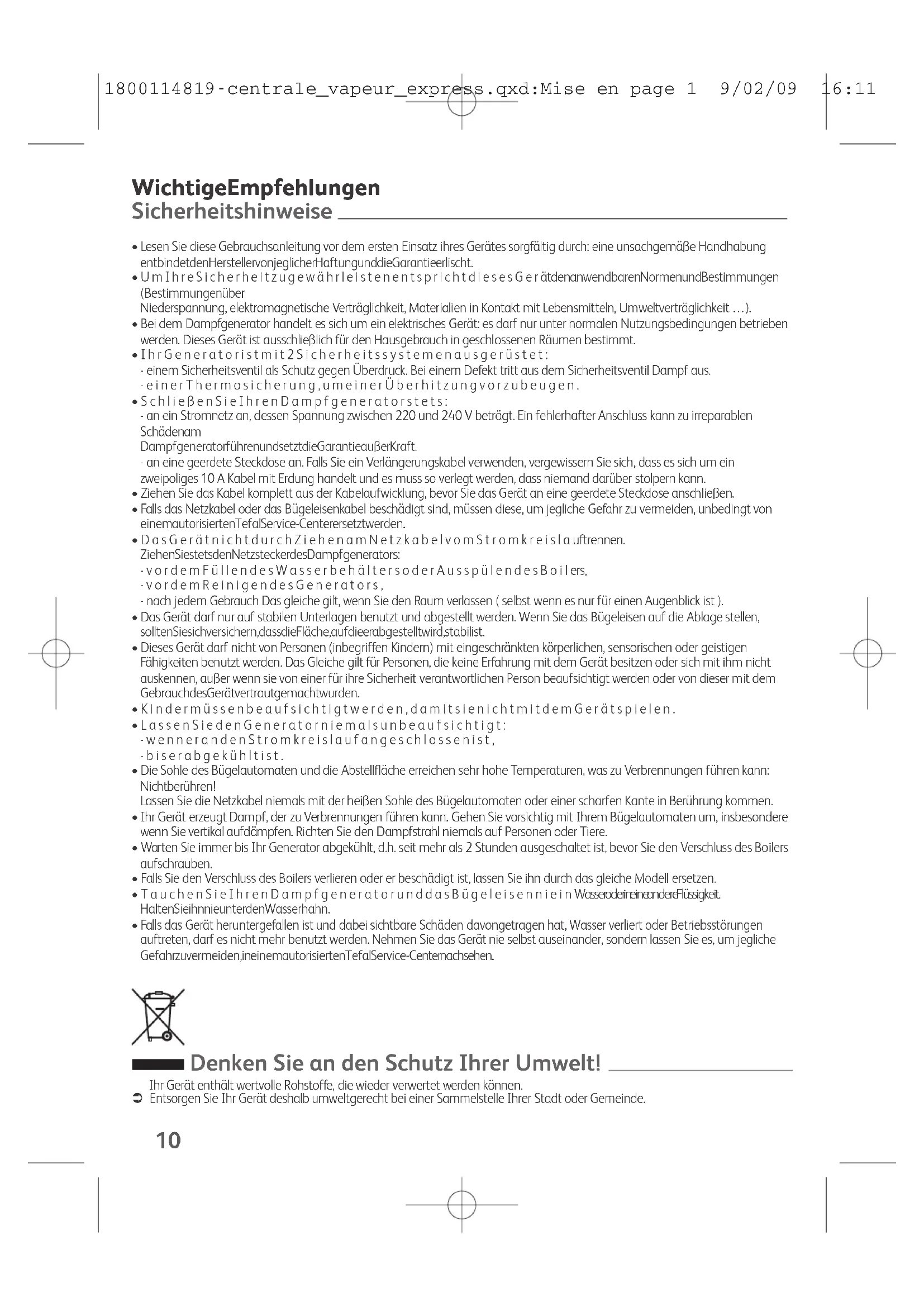 - FallsdasGerätheruntergefallenistunddabeisichtbareSchäden dav ongetr agen hat, W asser verliert oder Betriebsstörungen auftreten, darf es nicht mehr benutzt werden. Nehmen Sie das Gerät nie selbst auseinander, sondern lassen Sie es, um jegliche Gefahr zu vermeiden, in einem autorisierten Tefal Service-Center nachsehen. Ihr Gerät enthält wertv olle Rohstoffe, die wieder verw ertetwerdenkönnen. ! Entsorgen Sie Ihr Gerät deshalb umweltgerecht bei einer Sammelstelle Ihrer Stadt oder Gemeinde. Wichtige Empfehlungen Sicherheitshinweise Denken Sie an den Schutz Ihrer Umwelt! 1800114819-centrale_vapeur_express.qxd:Mise en page 1 9/02/09 16:11 Page 1011 Welches Wasser verwenden ?