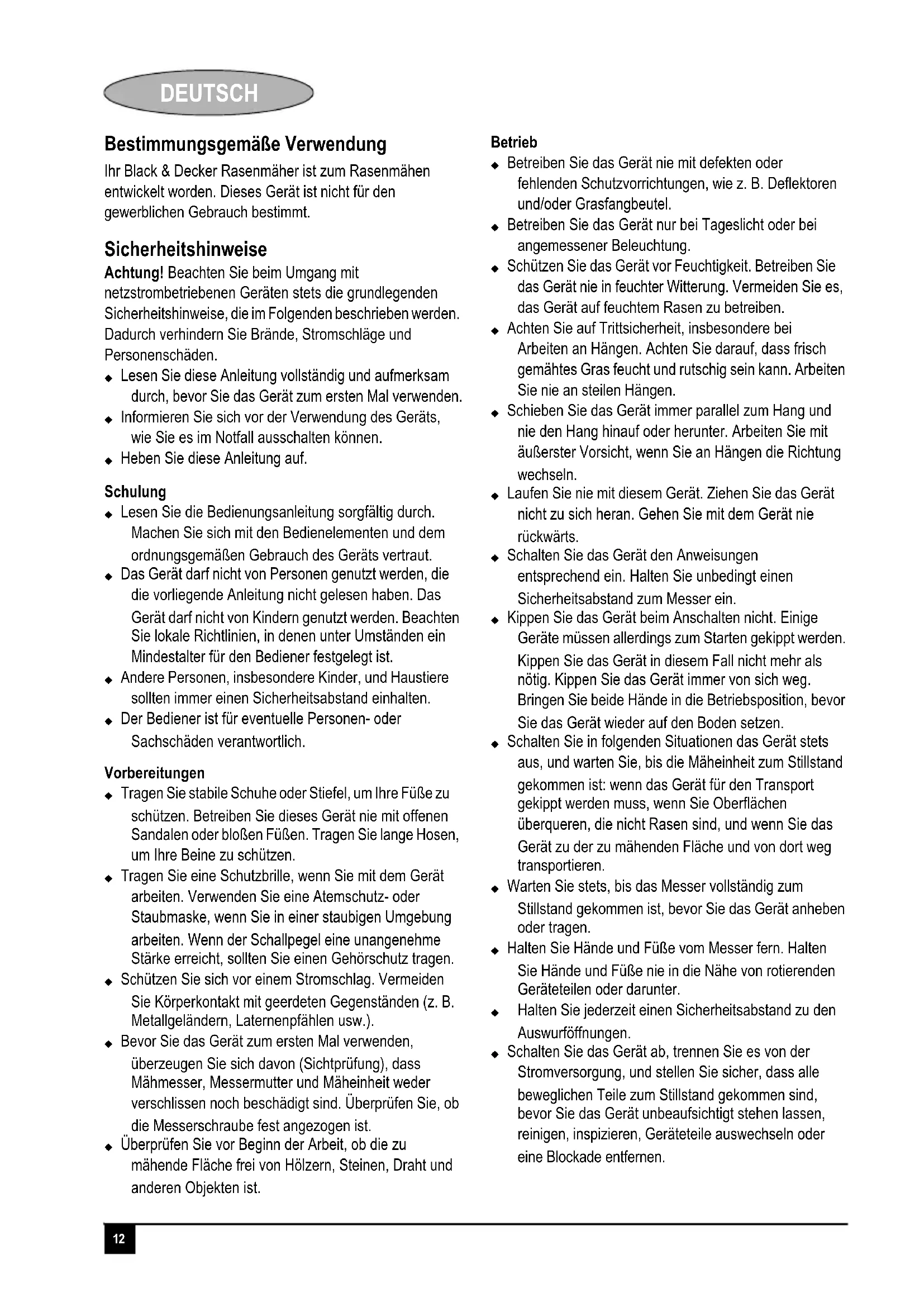 ENGLISH Guarantee Black & Decker is confident of the quality of its products and offers an outstanding guarantee. This guarantee statement is in addition to and in no way prejudices your statutory rights. The guarantee is valid within the territories of the Member States of the European Union and the European Free Trade Area. If a Black & Decker product becomes defective due to faulty materials, workmanship or lack of conformity, within 24 months from the date of purchase, Black & Decker guarantees to replace defective parts, repair products subjected to fair wear and tear or replace such products to make sure of the minimum inconvenience to the customer unless: The product has been used for trade, professional or hire purposes. The product has been subjected to misuse or neglect. The product has sustained damage through foreign objects, substances or accidents. Repairs have been attempted by persons other than authorised repair agents or Black & Decker service staff. To claim on the guarantee, you will need to submit proof of purchase to the seller or an authorised repair agent. You can check the location of your nearest authorised repair agent by contacting your local Black & Decker office at the address indicated in this manual. Alternatively, a list of authorised Black & Decker repair agents and full details of our after- sales service and contacts are available on the Internet at: www.2helpU.com Please visit our website www.blackanddecker.co.uk to register your new Black & Decker product and to be kept up to date on new products and special offers. Further information on the Black & Decker brand and our range of products is available at www.blackanddecker.co.uk.12 DEUTSCH Deutsch Bestimmungsgemäße Verwendung Ihr Black & Decker Rasenmäher ist zum Rasenmähen entwickelt worden. Dieses Gerät ist nicht für den gewerblichen Gebrauch bestimmt. Sicherheitshinweise Achtung! Beachten Sie beim Umgang mit netzstrombetriebenen Geräten stets die grundlegenden Sicherheitshinweise, die im Folgenden beschrieben werden. Dadurch verhindern Sie Brände, Stromschläge und Personenschäden. Lesen Sie diese Anleitung vollständig und aufmerksam durch, bevor Sie das Gerät zum ersten Mal verwenden. Informieren Sie sich vor der Verwendung des Geräts, wie Sie es im Notfall ausschalten können. Heben Sie diese Anleitung auf. Schulung Lesen Sie die Bedienungsanleitung sorgfältig durch. Machen Sie sich mit den Bedienelementen und dem ordnungsgemäßen Gebrauch des Geräts vertraut. Das Gerät darf nicht von Personen genutzt werden, die die vorliegende Anleitung nicht gelesen haben. Das Gerät darf nicht von Kindern genutzt werden. Beachten Sie lokale Richtlinien, in denen unter Umständen ein Mindestalter für den Bediener festgelegt ist. Andere Personen, insbesondere Kinder, und Haustiere sollten immer einen Sicherheitsabstand einhalten. Der Bediener ist für eventuelle Personen- oder Sachschäden verantwortlich. Vorbereitungen Tragen Sie stabile Schuhe oder Stiefel, um Ihre Füße zu schützen. Betreiben Sie dieses Gerät nie mit offenen Sandalen oder bloßen Füßen. Tragen Sie lange Hosen, um Ihre Beine zu schützen. Tragen Sie eine Schutzbrille, wenn Sie mit dem Gerät arbeiten. Verwenden Sie eine Atemschutz- oder Staubmaske, wenn Sie in einer staubigen Umgebung arbeiten. Wenn der Schallpegel eine unangenehme Stärke erreicht, sollten Sie einen Gehörschutz tragen. Schützen Sie sich vor einem Stromschlag. Vermeiden Sie Körperkontakt mit geerdeten Gegenständen (z. B. Metallgeländern, Laternenpfählen usw.). Bevor Sie das Gerät zum ersten Mal verwenden, überzeugen Sie sich davon (Sichtprüfung), dass Mähmesser, Messermutter und Mäheinheit weder verschlissen noch beschädigt sind. Überprüfen Sie, ob die Messerschraube fest angezogen ist. Überprüfen Sie vor Beginn der Arbeit, ob die zu mähende Fläche frei von Hölzern, Steinen, Draht und anderen Objekten ist. Betrieb Betreiben Sie das Gerät nie mit defekten oder fehlenden Schutzvorrichtungen, wie z. B. Deflektoren und/oder Grasfangbeutel. Betreiben Sie das Gerät nur bei Tageslicht oder bei angemessener Beleuchtung. Schützen Sie das Gerät vor Feuchtigkeit. Betreiben Sie das Gerät nie in feuchter Witterung. Vermeiden Sie es, das Gerät auf feuchtem Rasen zu betreiben. Achten Sie auf Trittsicherheit, insbesondere bei Arbeiten an Hängen. Achten Sie darauf, dass frisch gemähtes Gras feucht und rutschig sein kann. Arbeiten Sie nie an steilen Hängen. Schieben Sie das Gerät immer parallel zum Hang und nie den Hang hinauf oder herunter. Arbeiten Sie mit äußerster Vorsicht, wenn Sie an Hängen die Richtung wechseln. Laufen Sie nie mit diesem Gerät. Ziehen Sie das Gerät nicht zu sich heran. Gehen Sie mit dem Gerät nie rückwärts. Schalten Sie das Gerät den Anweisungen entsprechend ein. Halten Sie unbedingt einen Sicherheitsabstand zum Messer ein. Kippen Sie das Gerät beim Anschalten nicht. Einige Geräte müssen allerdings zum Starten gekippt werden. Kippen Sie das Gerät in diesem Fall nicht mehr als nötig. Kippen Sie das Gerät immer von sich weg. Bringen Sie beide Hände in die Betriebsposition, bevor Sie das Gerät wieder auf den Boden setzen. Schalten Sie in folgenden Situationen das Gerät stets aus, und warten Sie, bis die Mäheinheit zum Stillstand gekommen ist: wenn das Gerät für den Transport gekippt werden muss, wenn Sie Oberflächen überqueren, die nicht Rasen sind, und wenn Sie das Gerät zu der zu mähenden Fläche und von dort weg transportieren. Warten Sie stets, bis das Messer vollständig zum Stillstand gekommen ist, bevor Sie das Gerät anheben oder tragen. Halten Sie Hände und Füße vom Messer fern. Halten Sie Hände und Füße nie in die Nähe von rotierenden Geräteteilen oder darunter. Halten Sie jederzeit einen Sicherheitsabstand zu den Auswurföffnungen. Schalten Sie das Gerät ab, trennen Sie es von der Stromversorgung, und stellen Sie sicher, dass alle beweglichen Teile zum Stillstand gekommen sind,