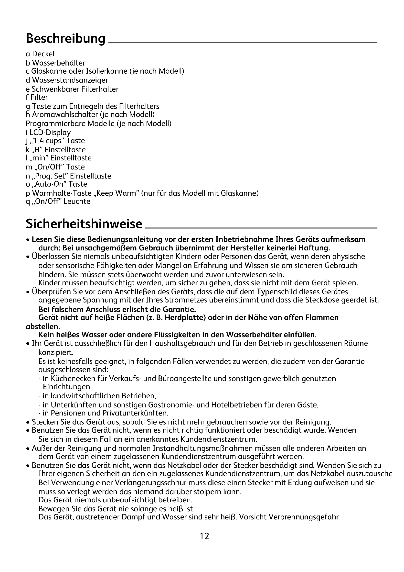 ENBeschreibung a Deckel b Wasserbehälter c Glaskanne oder Isolierkanne (je nach Modell) d Wasserstandsanzeiger e Schwenkbarer Filterhalter f Filter g Taste zum Entriegeln des Filterhalters h Aromawahlschalter (je nach Modell) Programmierbare Modelle (je nach Modell) i LCD-Display j „1-4 cups” Taste k „H” Einstelltaste l „min” Einstelltaste m „On/Off” Taste n „Prog. Set” Einstelltaste o „Auto-On” Taste p Warmhalte-Taste „Keep Warm” (nur für das Modell mit Glaskanne) q „On/Off” Leuchte Sicherheitshinweise