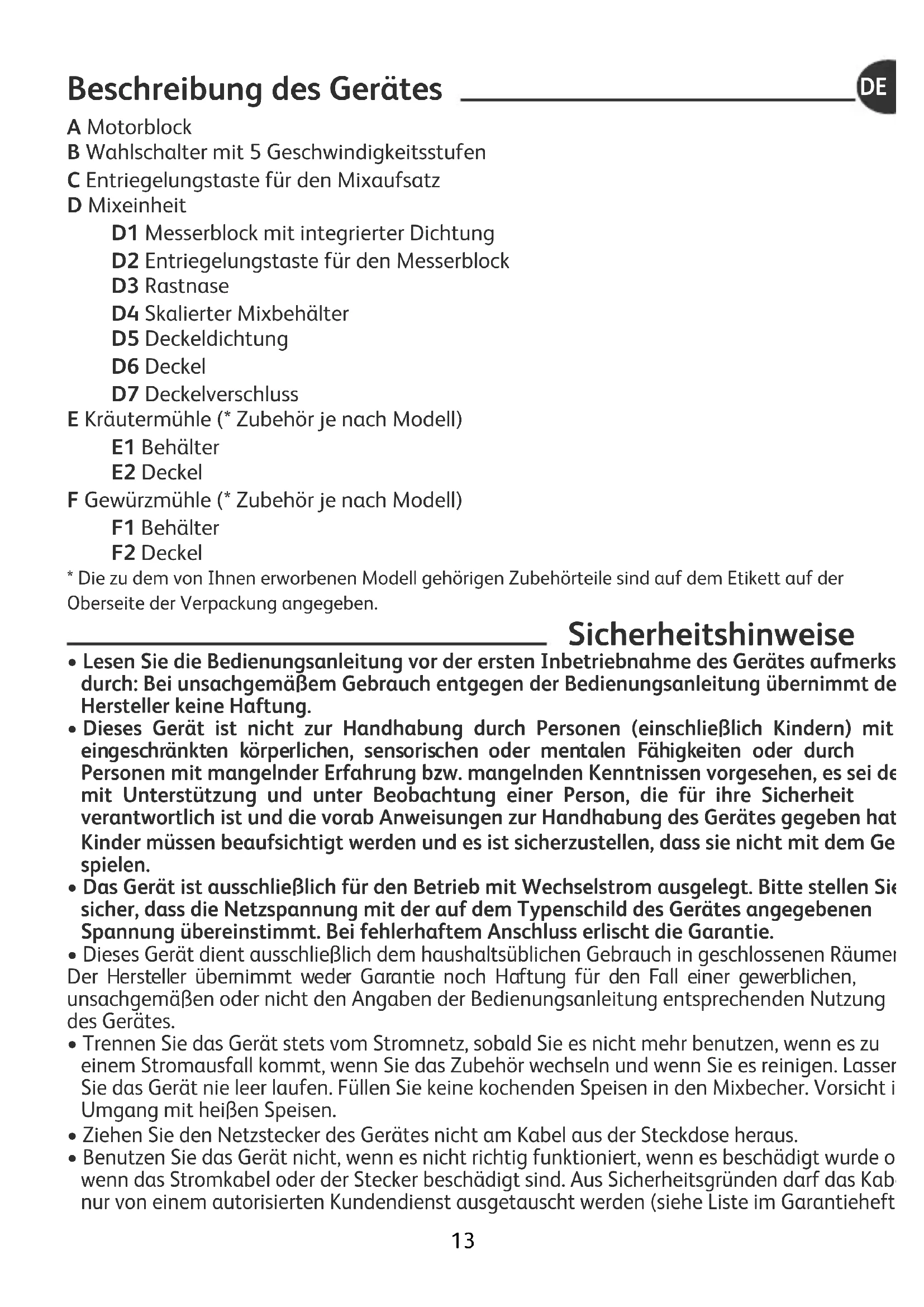 - Höchste Vorsicht ist beim Hantieren mit den scharfen Klingen des Messerblocks (D1), der Kräutermühle (E), der Gewürzmühle (F) sowie beim Leeren der Behälter und bei der Reinigung geboten: Die Klingen sind sehr scharf.