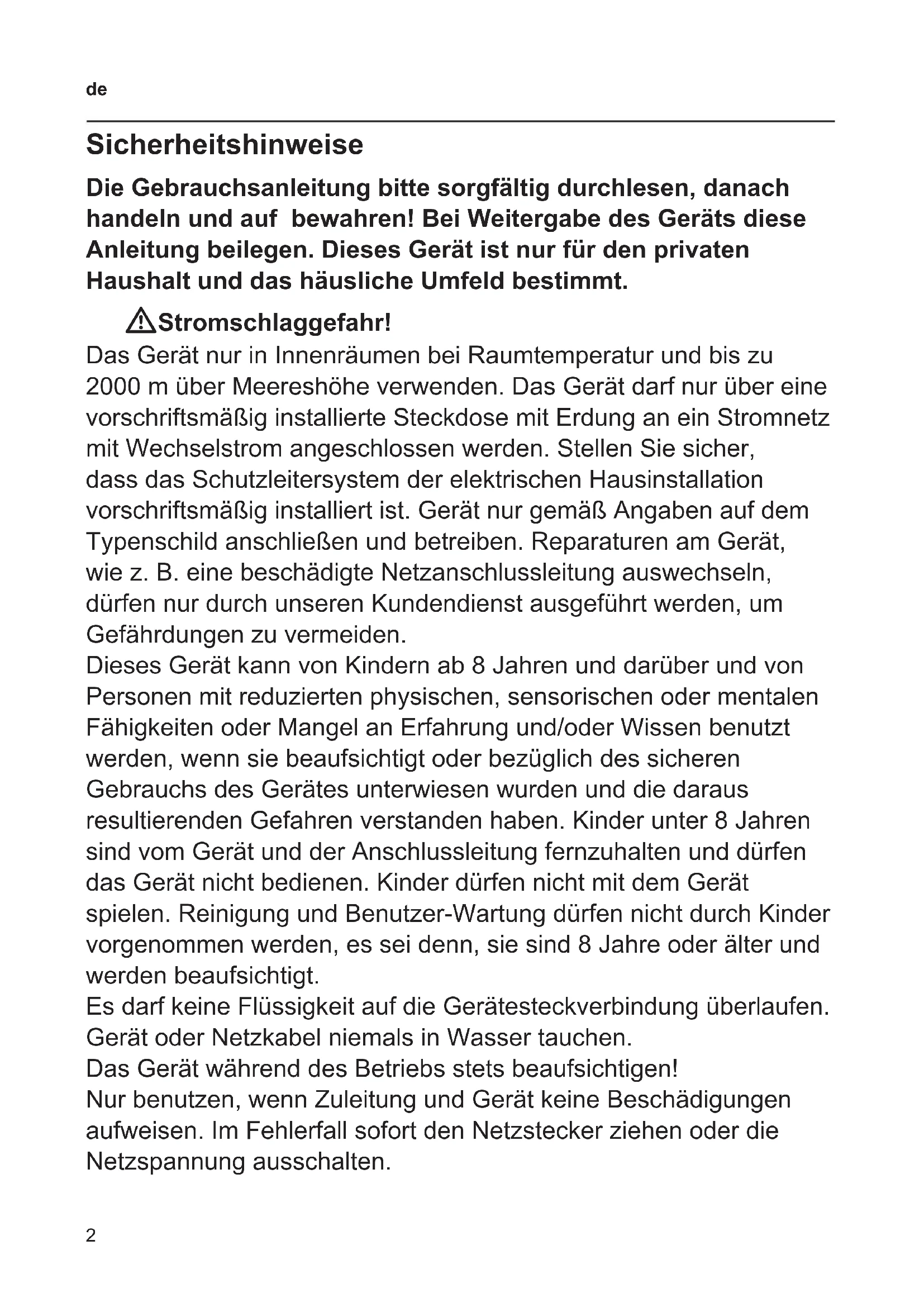 Sicherheitshinweise Die Gebrauchsanleitung bitte sorgfältig durchlesen, danach handeln und auf bewahren! Bei Weitergabe des Geräts diese Anleitung beilegen. Dieses Gerät ist nur für den privaten Haushalt und das häusliche Umfeld bestimmt. WStromschlaggefahr! Das Gerät nur in Innenräumen bei Raumtemperatur und bis zu 2000 m über Meereshöhe verwenden. Das Gerät darf nur über eine vorschriftsmäßig installierte Steckdose mit Erdung an ein Stromnetz mit Wechselstrom angeschlossen werden. Stellen Sie sicher, dass das Schutzleitersystem der elektrischen Hausinstallation vorschriftsmäßig installiert ist. Gerät nur gemäß Angaben auf dem Typenschild anschließen und betreiben. Reparaturen am Gerät, wie z. B. eine beschädigte Netzanschlussleitung auswechseln, dürfen nur durch unseren Kundendienst ausgeführt werden, um Gefährdungen zu vermeiden. Dieses Gerät kann von Kindern ab 8 Jahren und darüber und von Personen mit reduzierten physischen, sensorischen oder mentalen Fähigkeiten oder Mangel an Erfahrung und/oder Wissen benutzt werden, wenn sie beaufsichtigt oder bezüglich des sicheren Gebrauchs des Gerätes unterwiesen wurden und die daraus resultierenden Gefahren verstanden haben. Kinder unter 8 Jahren sind vom Gerät und der Anschlussleitung fernzuhalten und dürfen das Gerät nicht bedienen. Kinder dürfen nicht mit dem Gerät spielen. Reinigung und Benutzer-Wartung dürfen nicht durch Kinder vorgenommen werden, es sei denn, sie sind 8 Jahre oder älter und werden beaufsichtigt. Es darf keine Flüssigkeit auf die Gerätesteckverbindung überlaufen. Gerät oder Netzkabel niemals in Wasser tauchen. Das Gerät während des Betriebs stets beaufsichtigen! Nur benutzen, wenn Zuleitung und Gerät keine Beschädigungen aufweisen. Im Fehlerfall sofort den Netzstecker ziehen oder die Netzspannung ausschalten.3