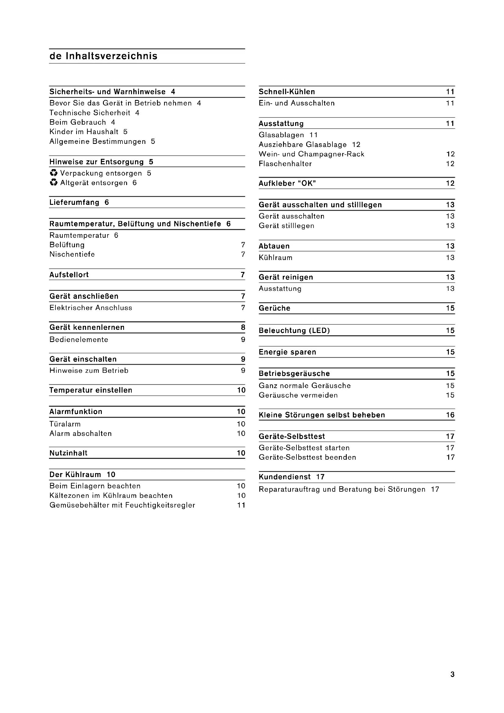 - Altgerät entsorgen 6 Lieferumfang 6 Raumtemperatur, Belüftung und Nischentiefe 6 Raumtemperatur 6 Belüftung 7 Nischentiefe 7 Aufstellort 7 Gerät anschließen 7 Elektrischer Anschluss 7 Gerät kennenlernen 8 Bedienelemente 9 Gerät einschalten 9 Hinweise zum Betrieb 9 Temperatur einstellen 10 Alarmfunktion 10 Türalarm 10 Alarm abschalten 10 Nutzinhalt 10 Der Kühlraum 10 Beim Einlagern beachten 10 Kältezonen im Kühlraum beachten 10 Gemüsebehälter mit Feuchtigkeitsregler 11 Schnell-Kühlen 11 Ein- und Ausschalten 11 Ausstattung 11 Glasablagen 11 Ausziehbare Glasablage 12 Wein- und Champagner-Rack 12 Flaschenhalter 12 Aufkleber “OK” 12 Gerät ausschalten und stilllegen 13 Gerät ausschalten 13 Gerät stilllegen 13 Abtauen 13 Kühlraum 13 Gerät reinigen 13 Ausstattung 13 Gerüche 15 Beleuchtung (LED) 15 Energie sparen 15 Betriebsgeräusche 15 Ganz normale Geräusche 15 Geräusche vermeiden 15 Kleine Störungen selbst beheben 16 Geräte-Selbsttest 17 Geräte-Selbsttest starten 17 Geräte-Selbsttest beenden 17 Kundendienst 17 Reparaturauftrag und Beratung bei Störungen 174 m Sicherheits- und Warnhinweise Bevor Sie das Gerät in Betrieb nehmen Lesen Sie Gebrauchs- und Montageanleitung aufmerksam durch! Sie enthalten wichtige Informationen über Aufstellen, Gebrauch und Wartung des Gerätes. Der Hersteller haftet nicht, wenn Sie die Hinweise und Warnungen der Gebrauchsanleitung missachten. Bewahren Sie alle Unterlagen für späteren Gebrauch oder für Nachbesitzer auf. Technische Sicherheit Das Gerät enthält in geringer Menge das umweltfreundliche, aber brennbare Kältemittel R600a. Achten Sie darauf, dass die Rohre des Kältemittel-Kreislaufes bei Transport oder Montage nicht beschädigt werden. Herausspritzendes Kältemittel kann zu Augenverletzungen führen oder sich entzünden. Bei Beschädigung ▯ offenes Feuer oder Zündquellen vom Gerät fernhalten, ▯ Raum für einige Minuten gut durchlüften, ▯ Gerät ausschalten und Netzstecker ziehen, ▯ Kundendienst benachrichtigen. Je mehr Kältemittel in einem Gerät ist, umso größer muss der Raum sein, in dem das Gerät steht. In zu kleinen Räumen kann bei einem Leck ein brennbares Gas-Luft- Gemisch entstehen. Pro 8 g Kältemittel muss der Raum mindestens 1 m³ groß sein. Die Menge des Kältemittels Ihres Gerätes steht auf dem Typenschild im Inneren des Gerätes. Wenn die Netzanschlussleitung dieses Gerätes beschädigt wird, muss sie durch den Hersteller, Kundendienst oder eine ähnlich qualifizierte Person ersetzt werden. Unsachgemäße Installationen und Reparaturen können den Benutzer erheblich gefährden. Reparaturen dürfen nur durch den Hersteller, Kundendienst oder eine ähnlich qualifizierte Person durchgeführt werden. Es dürfen nur Originalteile des Herstellers benutzt werden. Nur bei diesen Teilen gewährleistet der Hersteller, dass sie die Sicherheitsanforderungen erfüllen. Eine Verlängerung der Netzanschlussleitung darf nur über den Kundendienst bezogen werden. Beim Gebrauch ▯ Nie elektrische Geräte innerhalb des Gerätes verwenden (z. B. Heizgeräte, elektrische Eisbereiter usw.). Explosionsgefahr! ▯ Nie das Gerät mit einem Dampfreinigungsgerät abtauen oder reinigen! Der Dampf kann an elektrische Teile gelangen und einen Kurzschluss auslösen. Stromschlaggefahr! ▯ Keine spitzen oder scharfkantigen Gegenstände verwenden, um Reif- und Eisschichten zu entfernen. Sie könnten damit die Kältemittel-Rohre beschädigen. Herausspritzendes Kältemittel kann sich entzünden oder zu Augenverletzungen führen. ▯ Keine Produkte mit brennbaren Treibgasen (z. B. Spraydosen) und keine explosiven Stoffe lagern. Explosionsgefahr! ▯ Sockel, Auszüge, Türen usw. nicht als Trittbrett oder zum Abstützen missbrauchen.5 ▯ Zum Abtauen und Reinigen Netzstecker ziehen oder Sicherung ausschalten. Am Netzstecker ziehen, nicht am Anschlusskabel. ▯ Hochprozentigen Alkohol nur dicht verschlossen und stehend lagern. ▯ Kunststoffteile und Türdichtung nicht mit Öl oder Fett verschmutzen. Kunststoffteile und Türdichtung werden sonst porös. ▯ Be- und Entlüftungsöffnungen für das Gerät nie abdecken oder zustellen. ▯ Vermeidung von Risiken für Kinder und gefährdete Personen: Gefährdet sind Kinder, Personen, die körperlich, psychisch oder in ihrer Wahrnehmung eingeschränkt sind sowie Personen, die nicht genügend Wissen über die sichere Bedienung des Gerätes haben. Stellen Sie sicher, dass Kinder und gefährdete Personen die Gefahren verstanden haben. Eine für die Sicherheit verantwortliche Person muss Kinder und gefährdete Personen am Gerät beaufsichtigen oder anleiten. Nur Kinder ab 8 Jahren das Gerät benutzen lassen. Bei Reinigung und Wartung Kinder beaufsichtigen. Niemals Kinder mit dem Gerät spielen lassen. Kinder im Haushalt ▯ Verpackung und deren Teile nicht Kindern überlassen. Erstickungsgefahr durch Faltkartons und Folien! ▯ Das Gerät ist kein Spielzeug für Kinder! ▯ Bei Gerät mit Türschloss: Schlüssel außer Reichweite von Kindern aufbewahren! Allgemeine Bestimmungen Das Gerät eignet sich zum Kühlen von Lebensmitteln. Dieses Gerät ist für den häuslichen Gebrauch im Privathaushalt und das häusliche Umfeld bestimmt. Das Gerät ist funkentstört nach EU-Richtlinie 2004/108/EC. Der Kältekreislauf ist auf Dichtheit geprüft. Dieses Erzeugnis entspricht den einschlägigen Sicherheitsbestimmungen für Elektrogeräte (EN 60335-2-24). Dieses Gerät ist für eine Nutzung bis zu einer Höhe von maximal 2000 Metern über dem Meeresspiegel bestimmt. Hinweise zur Entsorgung