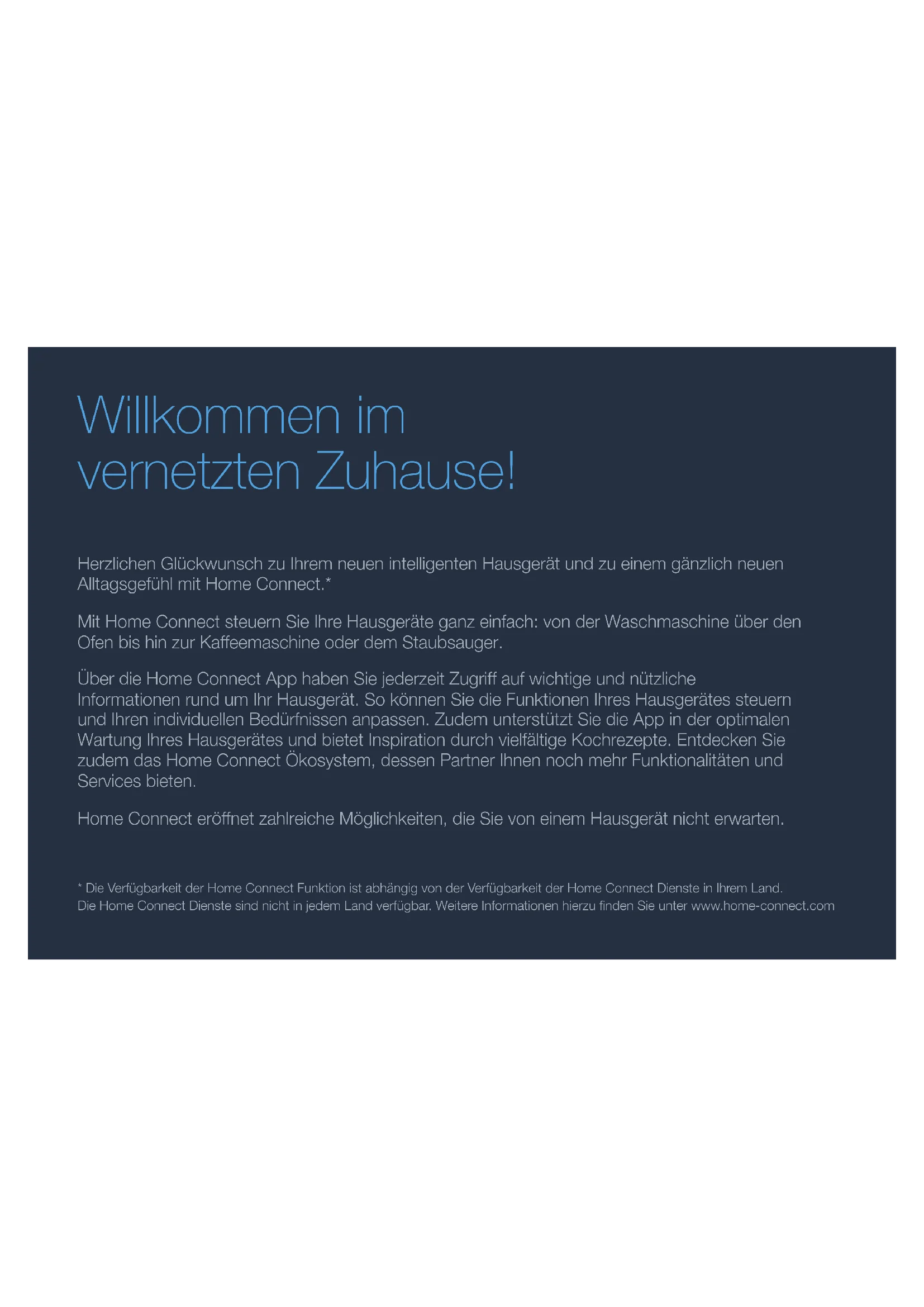 DE Verbinden Sie Ihr Kühlgerät mit der Zukunft. 2 EN Connect your refrigerator to the future. 8 FR Connectez votre réfrigérateur à l’avenir. 14 IT Collegate il vostro frigorifero – con il futuro. 20 ES Conectesufrigorícoconelfuturo. 26 Installation guide2 DE Herzlichen Glückwunsch zu Ihrem neuen intelligenten Hausgerät und zu einem gänzlich neuen AlltagsgefühlmitHomeConnect.* MitHomeConnectsteuernSieIhreHausgeräteganzeinfach:vonderWaschmaschineüberden Ofen bis hin zur Kaffeemaschine oder dem Staubsauger. ÜberdieHomeConnectApphabenSiejederzeitZugriffaufwichtigeundnützliche Informationen rund um Ihr Hausgerät. So können Sie die Funktionen Ihres Hausgerätes steuern undIhrenindividuellenBedürfnissenanpassen.ZudemunterstütztSiedieAppinderoptimalen WartungIhresHausgerätesundbietetInspirationdurchvielfältigeKochrezepte.EntdeckenSie zudemdasHomeConnectÖkosystem,dessenPartnerIhnennochmehrFunktionalitätenund Services bieten. HomeConnecteröffnetzahlreicheMöglichkeiten,dieSievoneinemHausgerätnichterwarten. *DieVerfügbarkeitderHomeConnectFunktionistabhängigvonderVerfügbarkeitderHomeConnectDiensteinIhremLand. DieHomeConnectDienstesindnichtinjedemLandverfügbar.WeitereInformationenhierzundenSieunterwww.home-connect.com Willkommen im vernetzten Zuhause!3 DE Entdecken Sie die Möglichkeiten von HomeConnect Verwalten Sie Ihr Hausgerät InderGeräteübersichtderAppndenSiealleIhre verbundenen Hausgeräte und haben Zugriff auf wichtige undnützlicheInformationen.SokönnenSiezumBeispiel die Funktionen Ihres Hausgerätes steuern und Ihren individuellenBedürfnissenanpassen. Lassen Sie sich inspirieren DerRezeptbereichbieteteineVielzahlaninspirierenden Rezepten,TippsundVideos,diedasKochenundBacken zueinemnochschönerenErlebnismachen. Hilfe und Unterstützung DerServicebereichbietethilfreicheInformationenzur richtigenWartungundBedienungIhresHausgerätes. Noch mehr Vorteile UnserPartnernetzwerkwächststetig.EineÜbersichtaller PartnerndenSieunterwww.home-connect.com. Los geht’s! WasSiebenötigen: 1 | Ihr mit dem Stromnetz verbundenes und eingeschaltetes Kühlgerät. 2 | EinSmartphoneoderTabletmiteineraktuellenVersiondes iOS oder Android Betriebssystems. 3 | IhrKühlgerätinReichweitedesWLAN-SignalsIhres Heimnetzwerks. 4 | DenNamen(SSID)undPasswort(Key)IhresWLAN- Netzwerks. 5 | DieseInstallationsanleitung. WichtigeInformation: Datensicherheit:Datensicherheithatfür HomeConnecthöchstePriorität.DerAustauschvon Datenerfolgtstetsverschlüsselt.HomeConnect setztSicherheitsvorkehrungein,dieregelmäßig geprüftundaktualisiertwerden.Mehrdazuunter www.home-connect.com. Gerätesicherheit: Zum sicheren Betrieb IhresHausgerätsmitHomeConnectFunktion berücksichtigen Sie bitte die Sicherheitshinweise in derGeräte-Gebrauchsanleitung.4 DE Schritt 2: Kühlgerät mit dem Heimnetzwerk verbinden 1 | Ihr Kühlgerät ist bereits mit dem Stromnetz verbunden und eingeschaltet. 2 | ÖffnenSiedieHomeConnectApp,umIhrKühlgerät hinzuzufügen. 3 | FolgenSiedenAnweisungeninderAppundbeziehenSie sichnuraufdieseAnleitung,wennSiedieAppdazuauffordert Hinweis: WirarbeitenlaufendanderVerbesserungder HomeConnectApp.DieskannzuUnterschieden bei den Verbindungsschritten führen. Bitte halten Sie sich an die Anweisungen der neuesten Version IhrerHomeConnectApp.SieführtSiedurchden Verbindungsprozess. Schritt 1:HomeConnectApp herunterladen und Benutzerkonto anlegen 1 | ÖffnenSiedenAppStore(AppleGeräte)oderGooglePlay Store(AndroidGeräte)aufIhremSmartphoneoderTablet. 2 | SuchenSieimStorenach„HomeConnect“undinstallieren SiedieApp. HomeConnectApp: 3 | ÖffnenSiedieAppundregistrierenSiesich,umein HomeConnectBenutzerkontozuerstellen. 4 | NotierenSiesichdieHomeConnectZugangsdaten (BenutzerkontoundPasswort)–Siewerdendiesespäter benötigen. DieAppführtSiedurchdienotwendigenSchritte,umIhr GerätmitHomeConnectzuverbinden.DieAppverweistauf dieseAnleitung,wennnötig.5 DE Schritt 2.1: Kühlgerät mit dem HeimnetzwerkverbindenmitWPS Folgen Sie den Anweisungen in Schritt 2.1 nur, wenn Sie die App dazu auordert. Die folgenden Schritte beschreiben die Bedienung am Hausgerät. 1 | TasteSdrücken,umdasHauptmenüzuöffnen. 2 | MitTaste zumMenüpunktGrundeinstellungen blättern. 3 | ZumÖffnendesMenüpunktsTaste drücken. Grundeinstellungen 4 | MitTaste zumMenüpunktHeimnetzwerkblättern. 5 | ZumÖffnendesMenüpunktsTaste drücken. Heimnetzwerk Nicht verbunden Im Bedienfeld Ihres Kühlgeräts erscheint Am Router die Verfügbarkeit einer WPS-Funktion prüfen. 6 | MitTaste bestätigen. Am Router die Verfügbarkeiteiner WPS-Funktion prüfen 7 | Automatisch(WPS)auswählen,umdieautomatische Netzwerkverbindungzustarten. 8 | AktivierenSieinnerhalbdernächsten2MinutendieWPS- FunktionanIhremHeimnetzwerk-Router. 9 | Im Bedienfeld Ihres Kühlgeräts erscheint Netzwerkanmeldung erfolgreich. DieAppwirdbenachrichtigt,sobaldIhrKühlgeräterfolgreich mitIhremWLAN-Netzwerkverbundenist. 10 | FolgenSiedenAnweisungeninderApp. Hinweis: WenndieVerbindungnichtinnerhalbvon2Minuten hergestelltwerdenkonnte,stellenSiesicher,dass sichIhrKühlgerätinReichweiteIhresWLAN- Netzwerksbendet. BeieinigenHausgerätenwirdderWPS-Modusauch „AutomatischeAnmeldung“genannt.