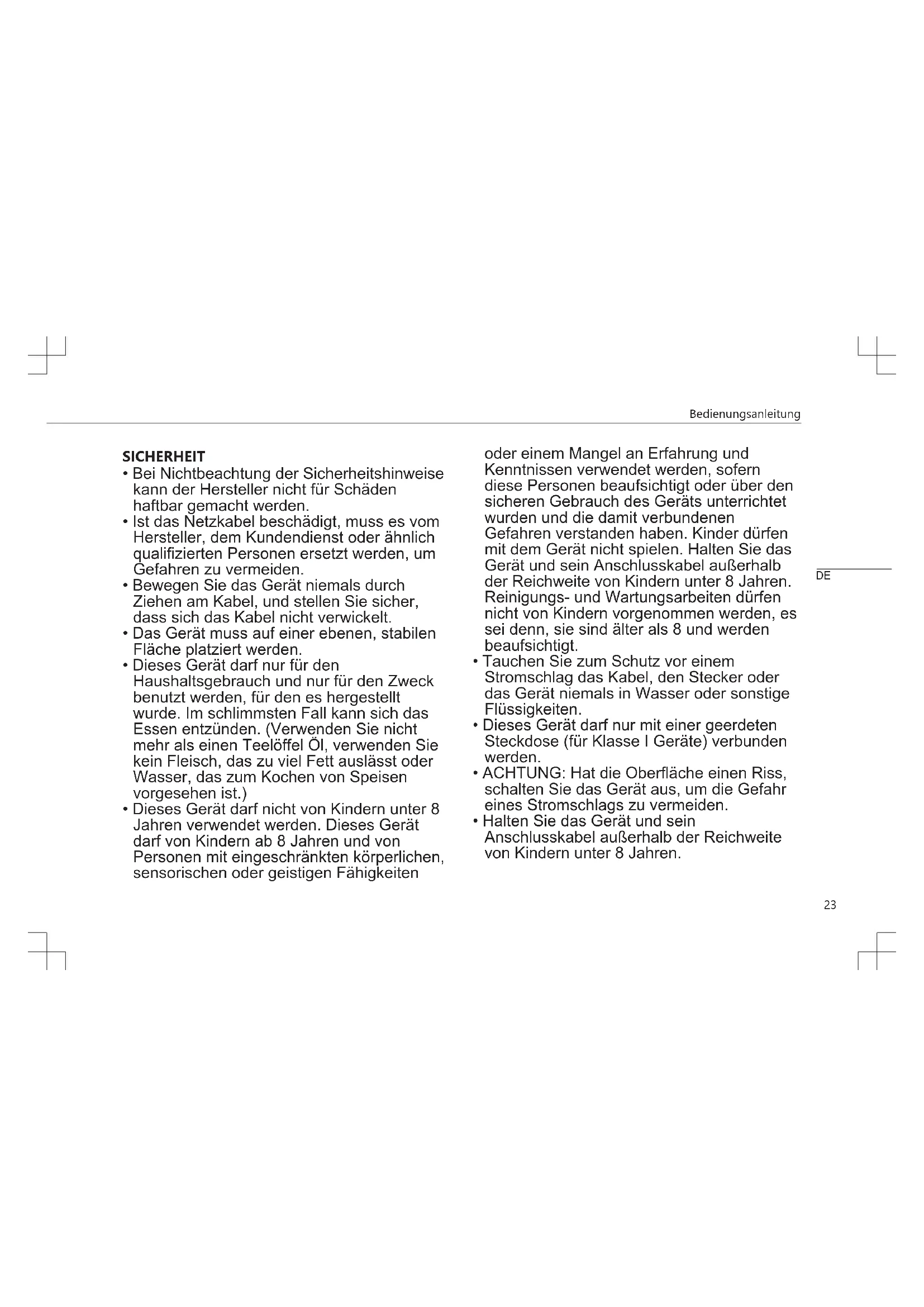 - Halten Sie das Gerät und sein Anschlusskabel außerhalb der Reichweite von Kindern unter 8 Jahren. DEBedienungsanleitung